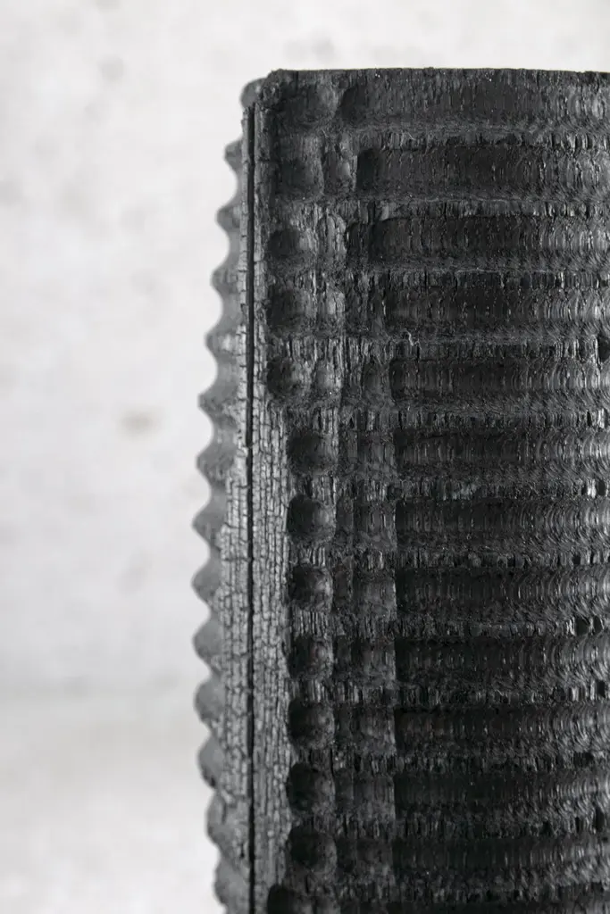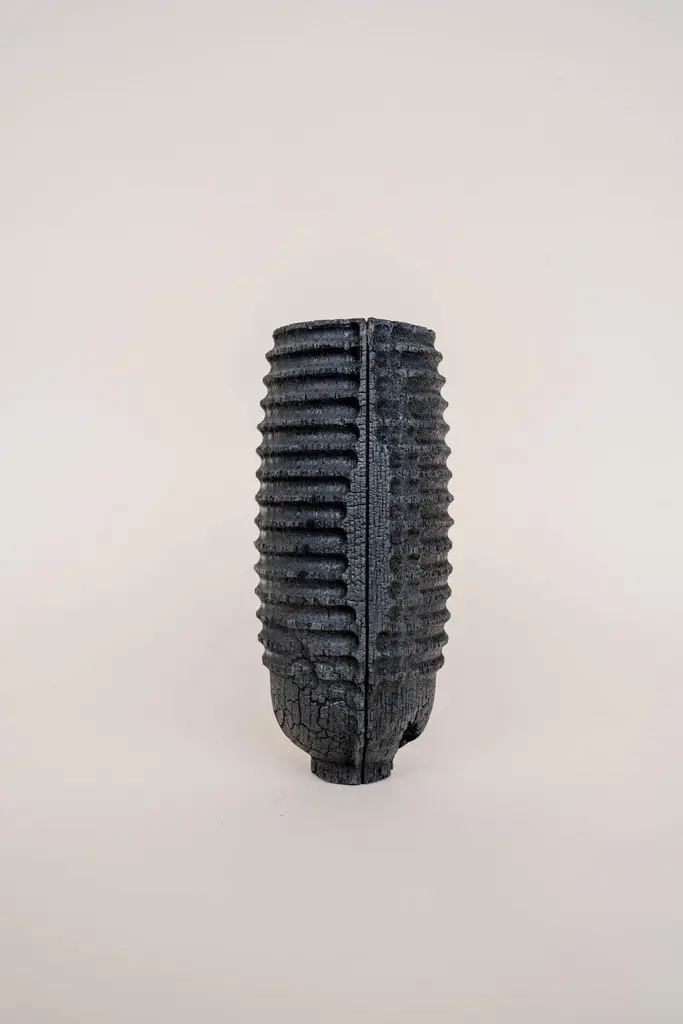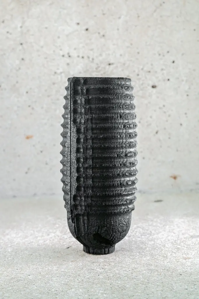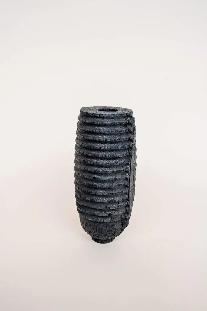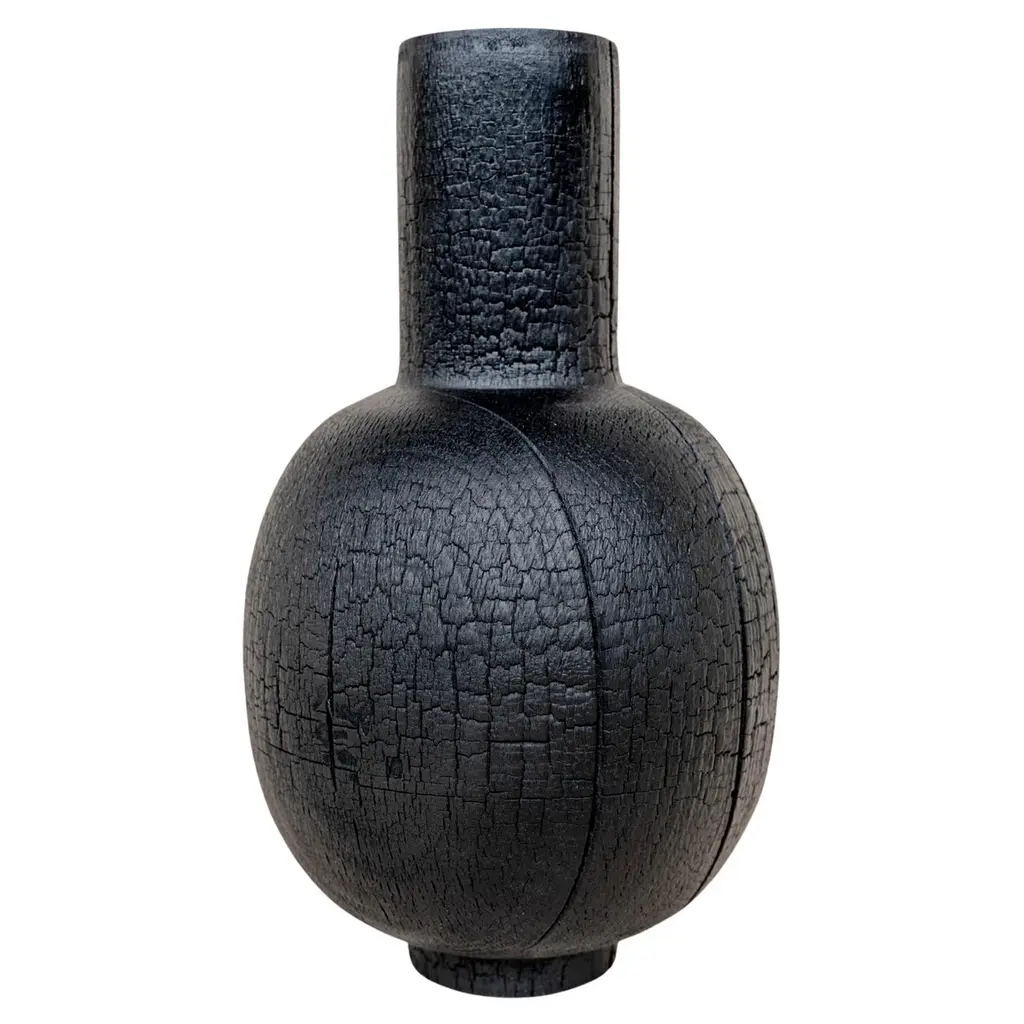 Wide Burnt Vase by Daniel ElkayamOne of a KindDimensions: D 15 x W 15 x H 20 cm Materials: Burnt Beech WoodJerusalem-born Art-designer and Photographer based in Tel-Aviv. Operating in the field of sustainable home decor and specializing in conceptual design, material exploring, and story-telling through objects. Graduated in 2019 his Bachelor's studies at the Industrial design department at Bezalel Academy of Arts and Design, Jerusalem. A former member of the Bezalel Alumni Design Incubator 2020. Won the excellent scholarship of America-Israel cultural foundation of 2019 Inspired by nature and its phenomenons, the artist transforms natural materials and aesthetics into one-of-a-kind unique objects. In his works, Daniel implements his curiosity and yearning for unrefined aesthetics, and by material transformation and unique techniques he is developing in his studio, he shows how unattractive materials can be not only valid but luxurious. Elkayam examines the range between art and design by taking things in and out of their context, creating hybrids between different worlds of content, intervening in natural processes, while leaving a gap for the unexpected, the unknown. He expresses his inner world and illustrates his ideas by creating objects and experiences. Through his perspective of materiality, and empathetic vision of his surroundings, he developed an intuitive way of creation with experimental materials such as algae, corrosion, charcoal, and more. Every collection of objects expresses different material research and follows curious narratives and a variety of topics such as locality, transience, and decay of materials. THE CHARRED COLLECTION: A collection of handmade wooden objects inspired by one of the most powerful natural phenomena in our world, which is out of control. Today the percentage of fires caused by natural causes is significantly lower than those caused by humans. The huge fires quickly deplete the forests, leaving behind a particularly surrealistic view of a burnt, black piece of nature. Out of interest in this show was created the desire to preserve the unique aesthetics of the burnt wood and to express in objects the feelings and questions it raises as a raw material in itself. The same scorched aesthetic combined with everyday objects, on the one hand, serves as a mirror for the consequences of the situation we have created and as a means of dealing with its ecological results, and on the other hand, as a visual echo of fire intensity and aesthetic effects.