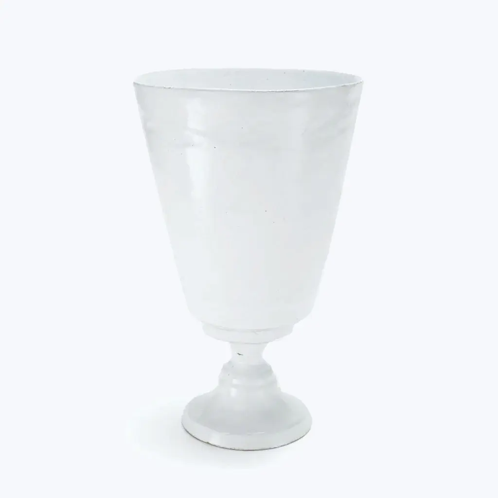 Inspired by the lines of a French goblet, this vase from Astier de Villatte features subtle, hand-formed details at its pedestal base. Handmade on the Rue St. Honore in Paris, these 18th-century inspired ceramics are crafted in a traditional pottery style passed down from generations. Hand molded from black terracotta, each piece is finished in a milky-white glaze that highlights the unique character of the clay, celebrating its imperfections and ensuring that no two pieces are exactly alike. Romantically bohemian, yet practical for every day use, they are entirely handcrafted in an antique Bastille workshop, historically home to Napoleon Bonaparte's own silversmith.