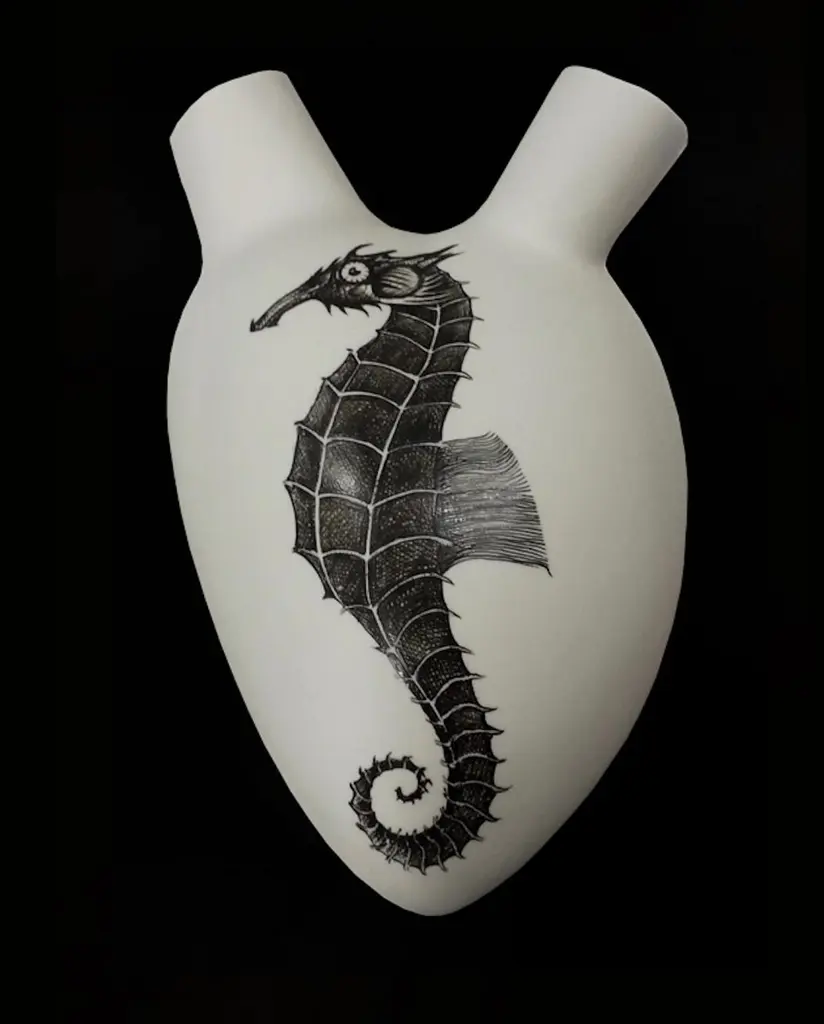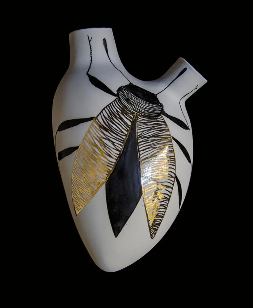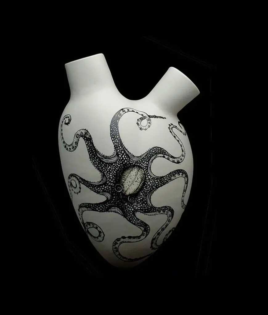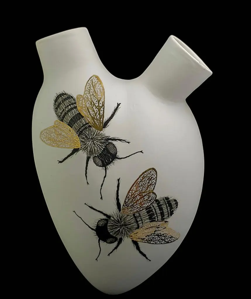 The heart collection is the result of the extravagant creativity of two innovative designers, who are inspired especially by the human body.This collection is made by 4 beautiful pieces all handmade in Italy. The hearts take up the symbolism of love, nature, human body and our feelings. Sometimes love can hurts, but it will always be the driving force of our lives. These Biscuit porcelain Hearts are not only sculptures, each one is a vase that you can hang on the wall and fullfill with fresh flowers or ornamental flowers.This collection is entirely handmade. The material used is porcelain, of Limoges (France) and German origin, fired at 1260 C. The shape of heart is made by casting in plaster moulds. The sculptures (thorns, coral, birds,..) are added to the heart immediately after finishing. The object is first fired at 980 C and then painted using metal oxides. Then glass is applied to the parts that need to be polished. After a second cooking, the piece is finished.The whole process is strictly handmade so small imperfections in shape and color and differences in gloss are due to the manual processing.