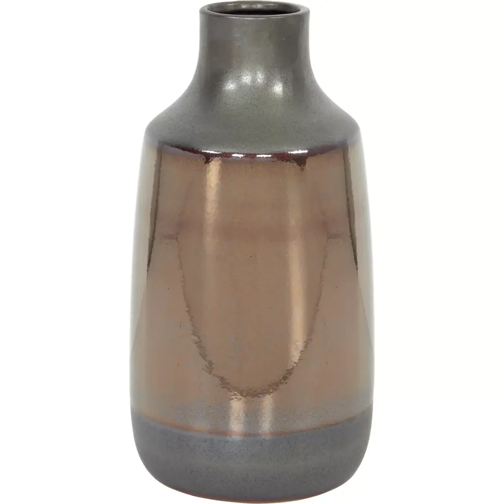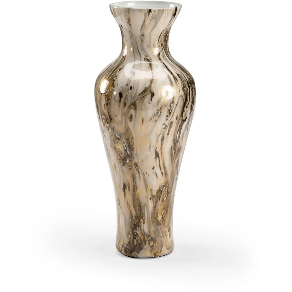 Oyster swirl vase is a large enameled iron vase that features an eye catching gold and white abstract ombre design. Provide charm in any room by adding cherry blossoms, pussy willow branches or tall faux flowers.