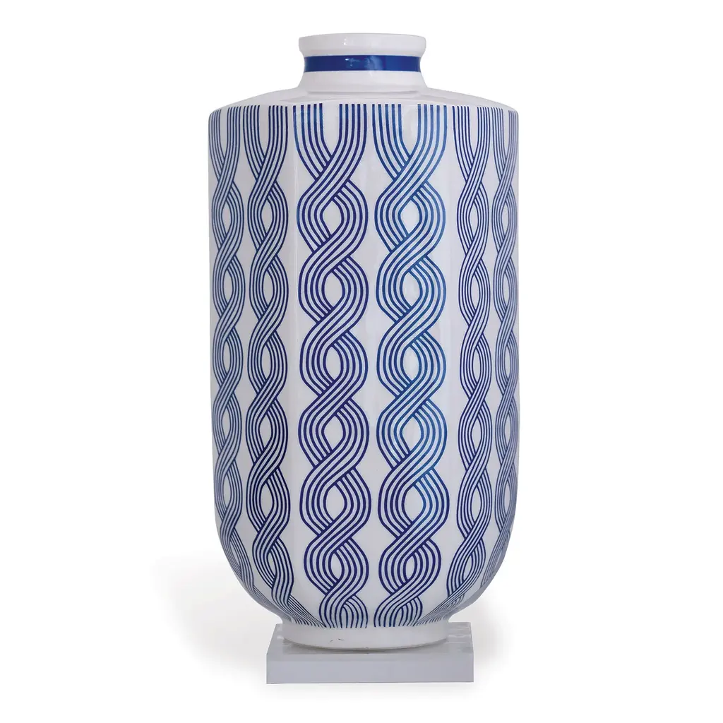As part of the WILLIAMSBURG collection for PORT 68, Evelyn celebrates the graphic woven wicker pattern in blue on cream crackled hexagon shaped porcelain silhouettes. We have this pattern on vases and the modern lamp. Materials: porcelain Porcelain vase. SKU: ACBS-369-02 Size: 20"H x 10.5"W x 9"D Free shipping in the U.S.