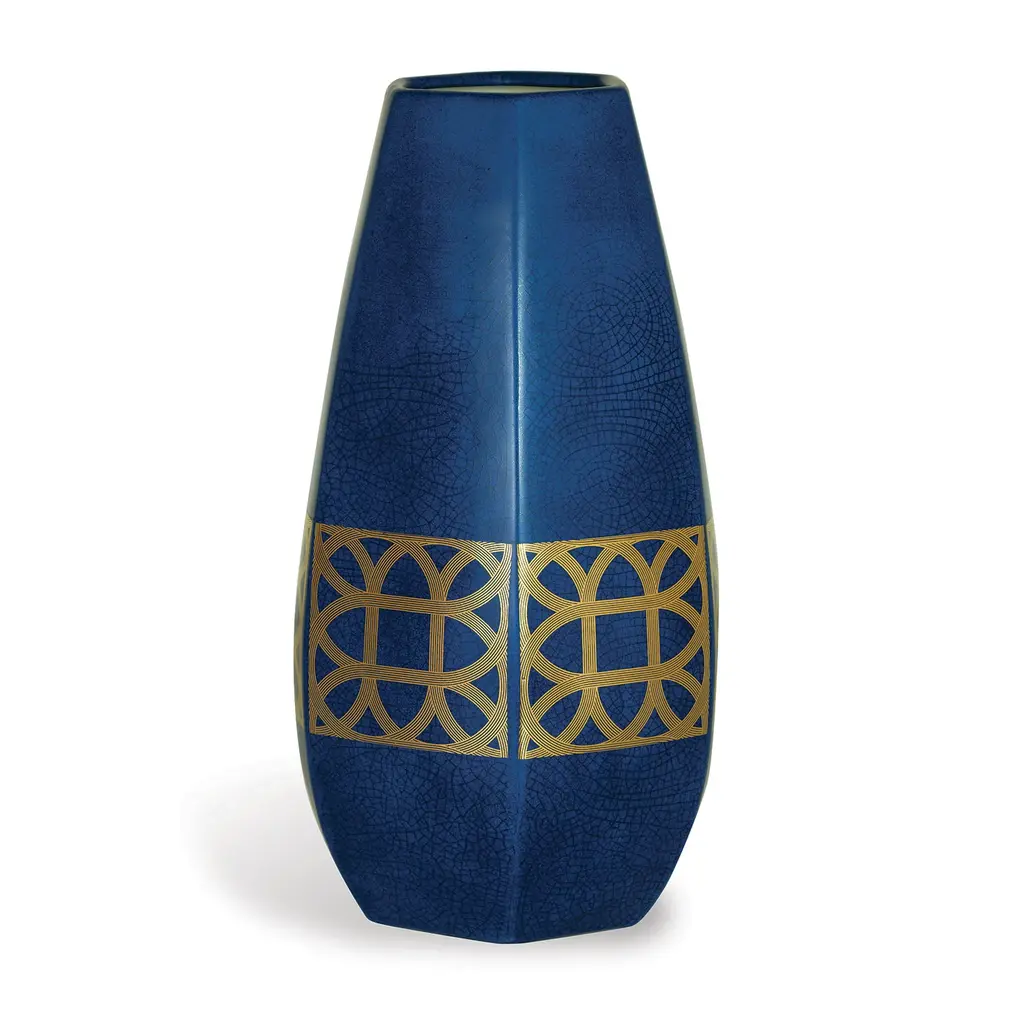 Inspired by woven basketwork, the Lamerie pattern is part of the Colonial Williamsburg collection of a silver fruit basket made in London in the 1740's. We interpreted the lattice pattern into a burnished gold lattice stamp on our royal blue crackled porcelain vase. Vase top opening is: 4" x 4". Materials: porcelain SKU: ACBS-328-02 Size: 16.5"H x 9"Dia Free shipping in the U.S.
