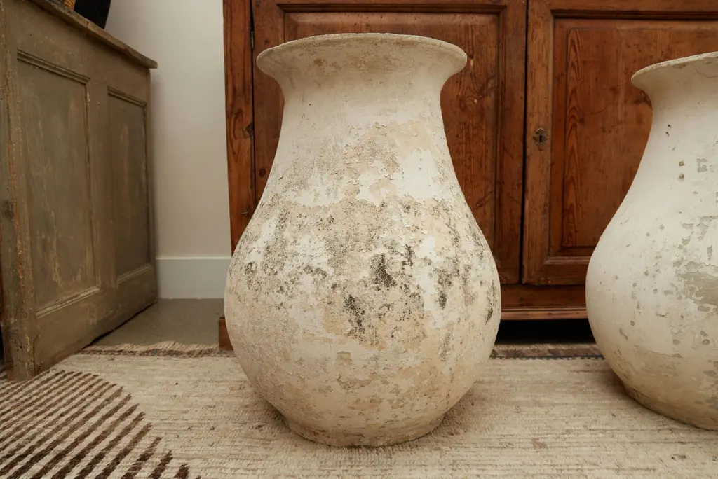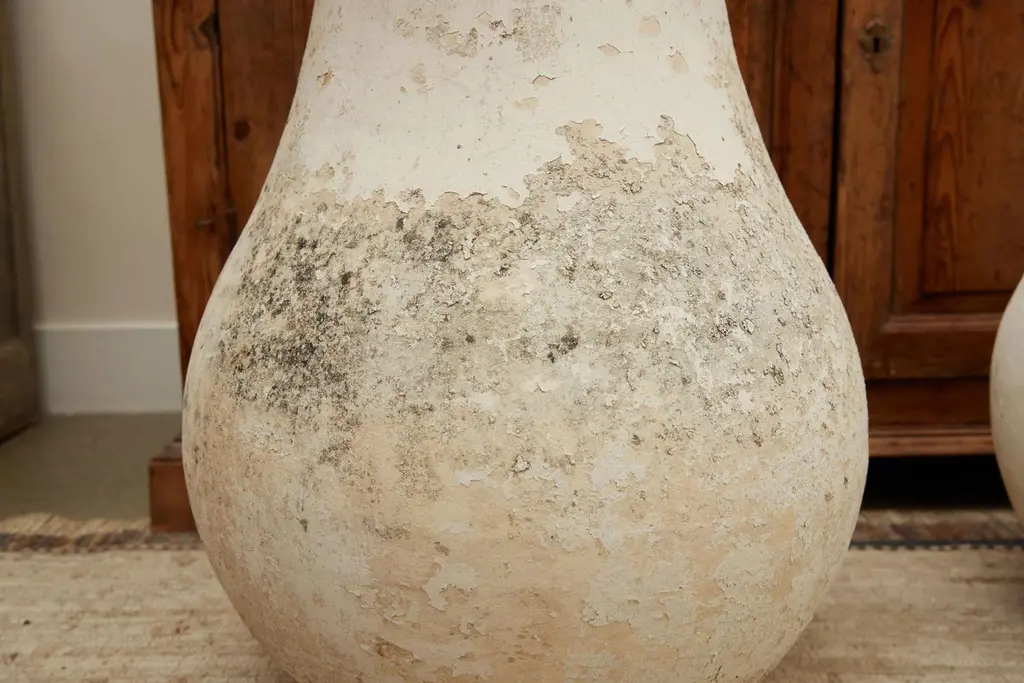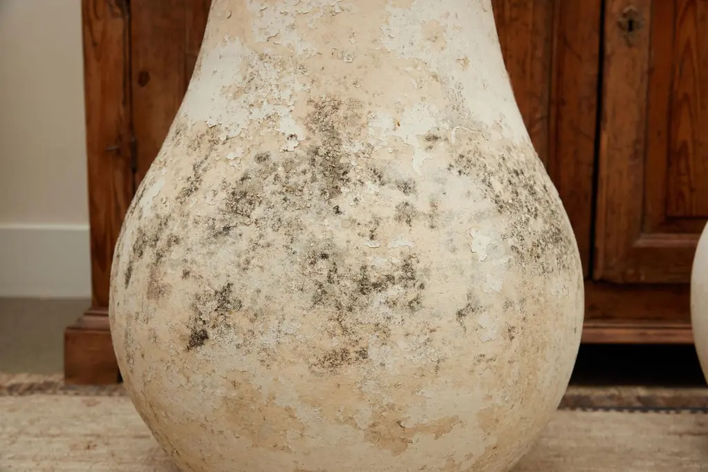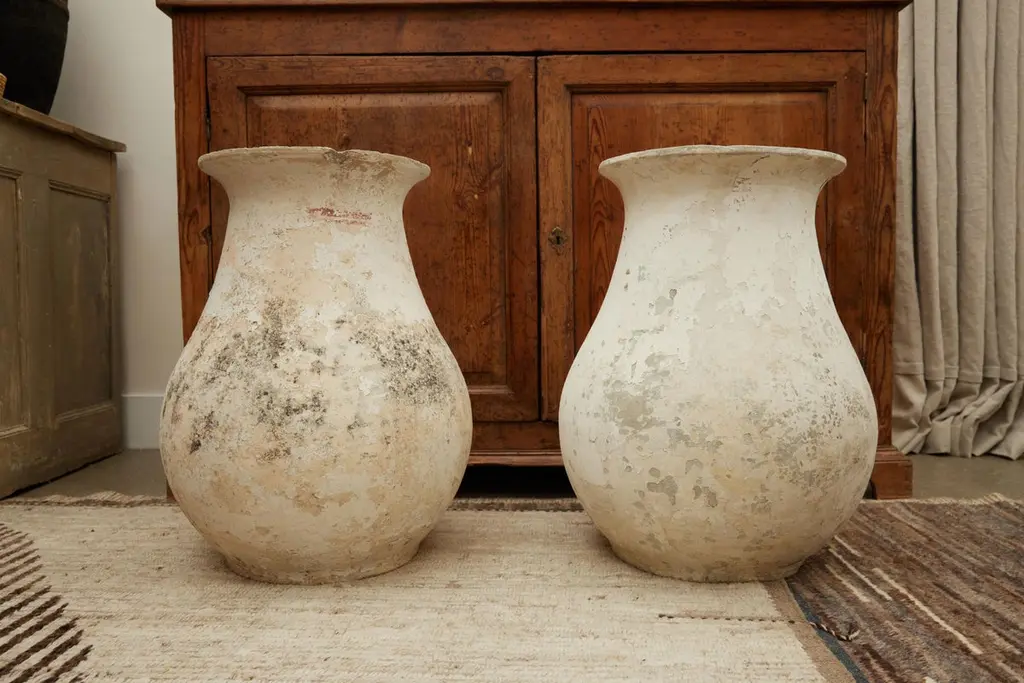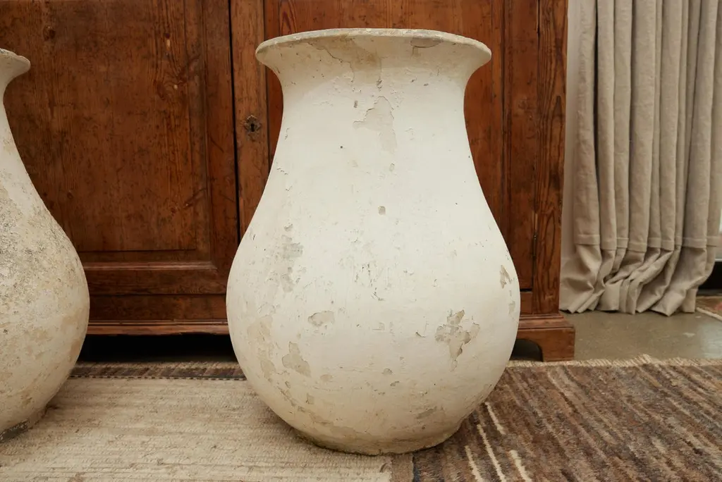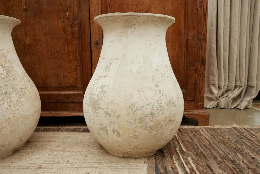 Stunning pair of concrete vases by Willy Guhl. Extremely rare model. Slightly tapered neck with pronounced lip spout. Made of fiber cement. Painted in beige color with years of patina. Beautiful texture and color with great presence. Excellent condition. Price for the pair Drainage holes in base