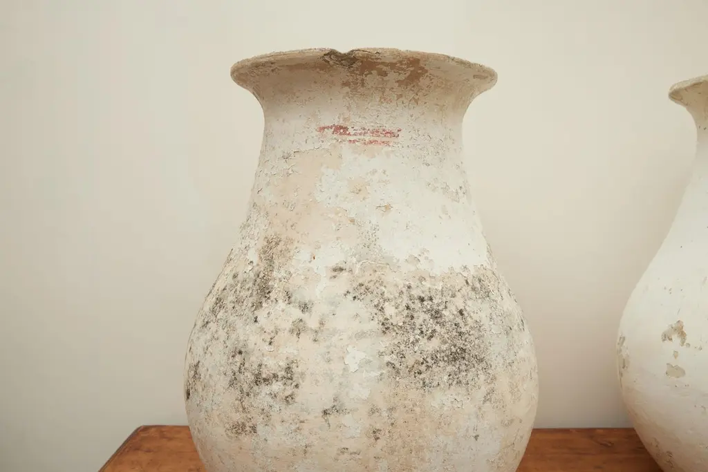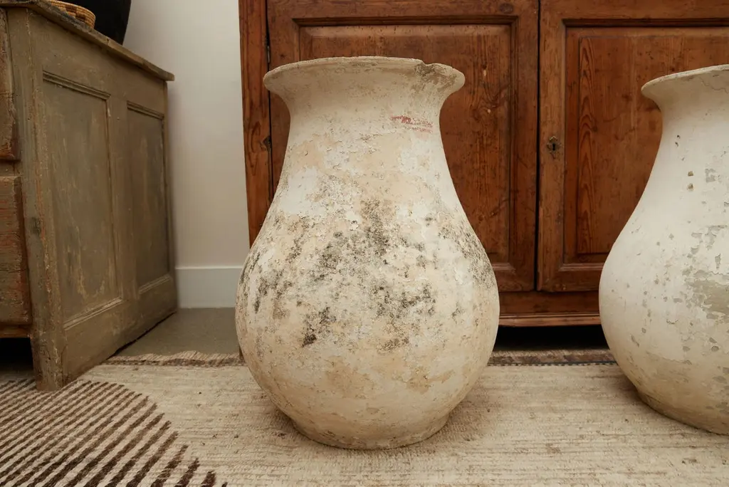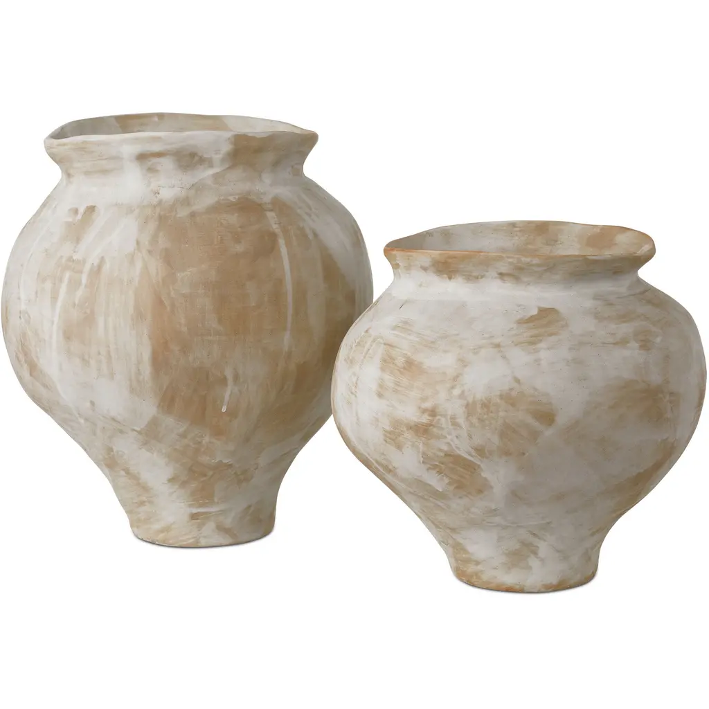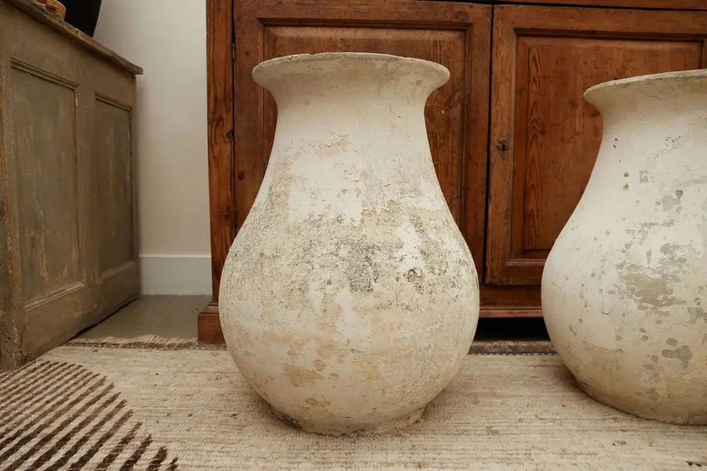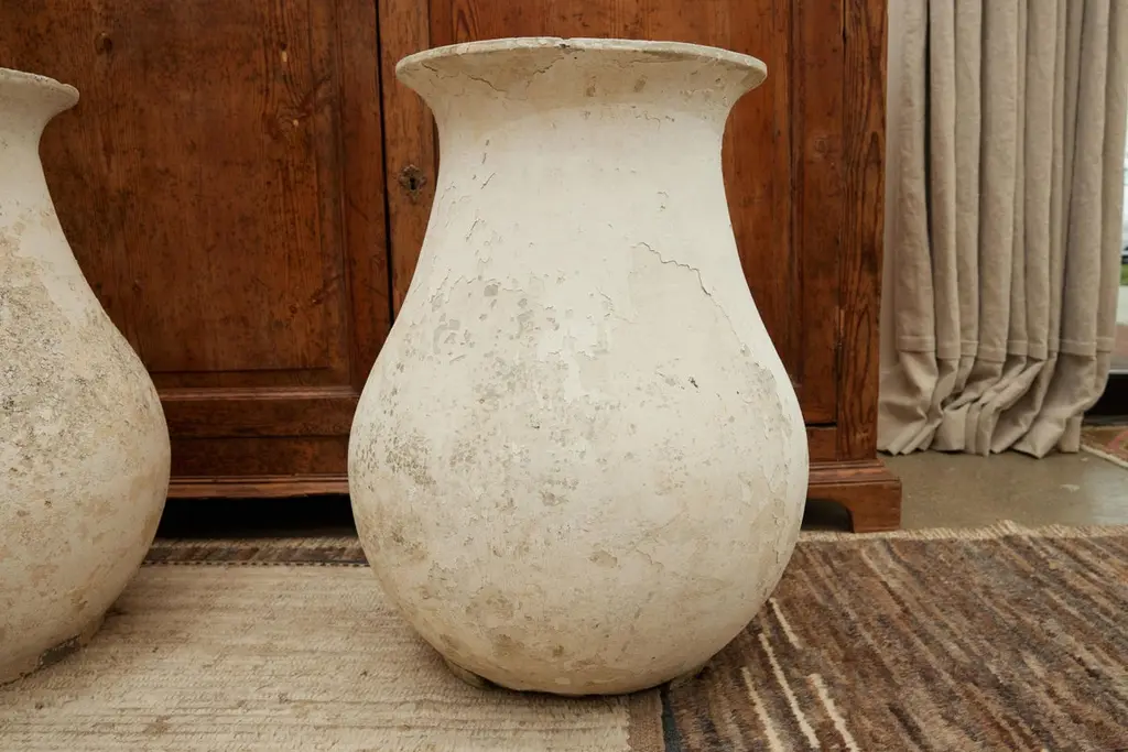 Stunning pair of concrete vases by Willy Guhl. Extremely rare model. Slightly tapered neck with pronounced lip spout. Made of fiber cement. Painted in beige color with years of patina. Beautiful texture and color with great presence. Excellent condition. Price for the pair Drainage holes in base