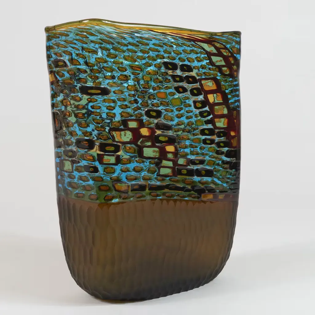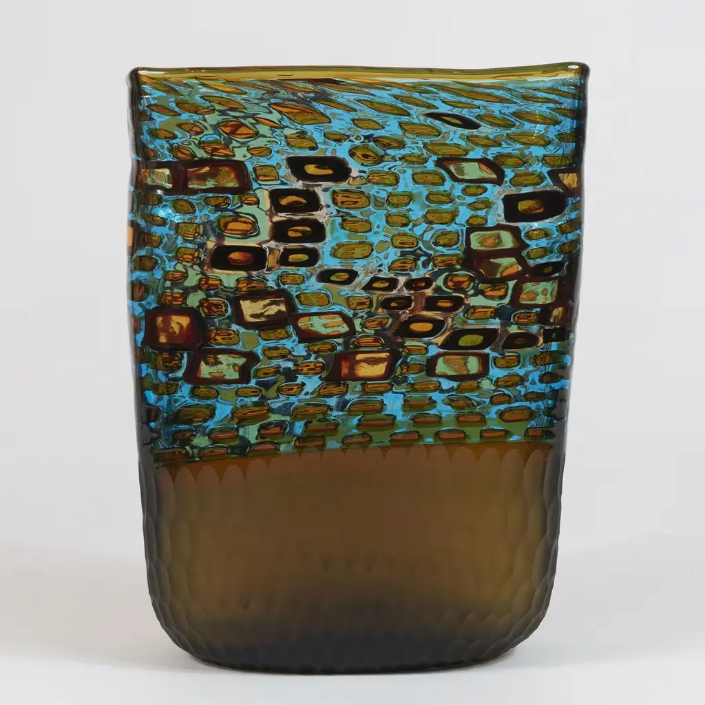 Tsuchida Yasuhiko designed a collection inspired by Manhattan's skyscrapers windows after he visited New York in 1999 during the Christmas season. In this hand-blown Murano glass vase he encapsulated his vivid memory. The one-of-a-kind piece was realized in 2001 combining techniques like blown glass, "tessere" (mosaic), and "battuto" (engraved). The amber color is enriched by brilliant turquoise tesserae.