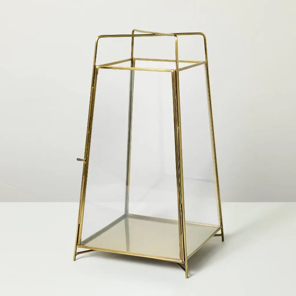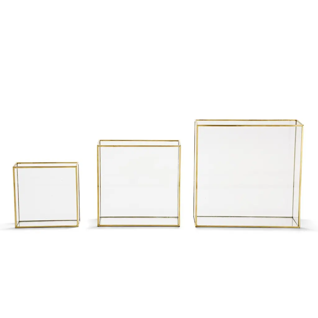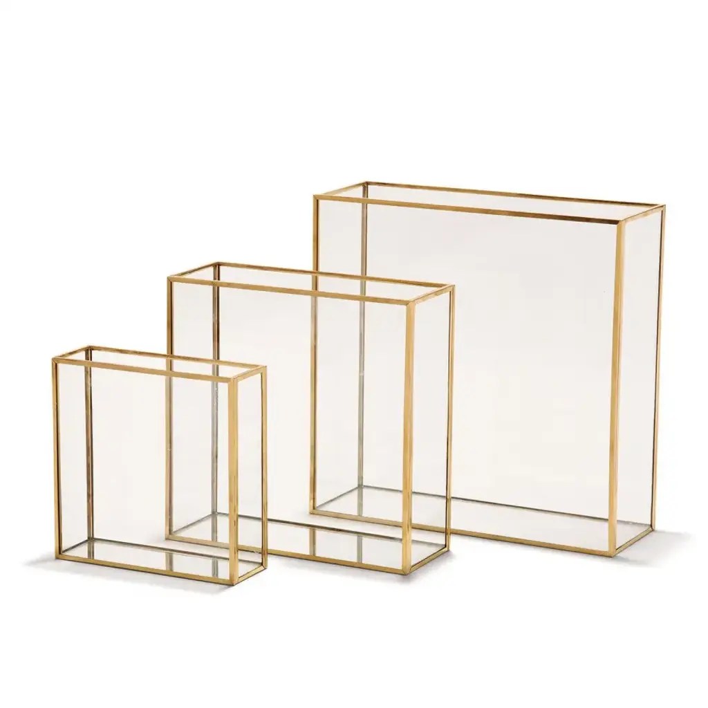 Keep flowers and greenery on a 360 degree display with these gold trimmed windowed vases. Each vase includes a reflective mirror base, glass panel with a simple gold metal edge and has a narrow depth all design elements that helps make flower arranging easy. Water-tight Reflective Mirrored Base Enhances the Look of Your Arrangement Create Art with Flowers, Rocks and Much More Hand Folded Antique Gold Edge Felt Bottom Table Protector Dimensions: 6" W x 2" D x 6" H, 8" W x 3" D x 8" H, 10" H x 3 1/2" D x 10" H