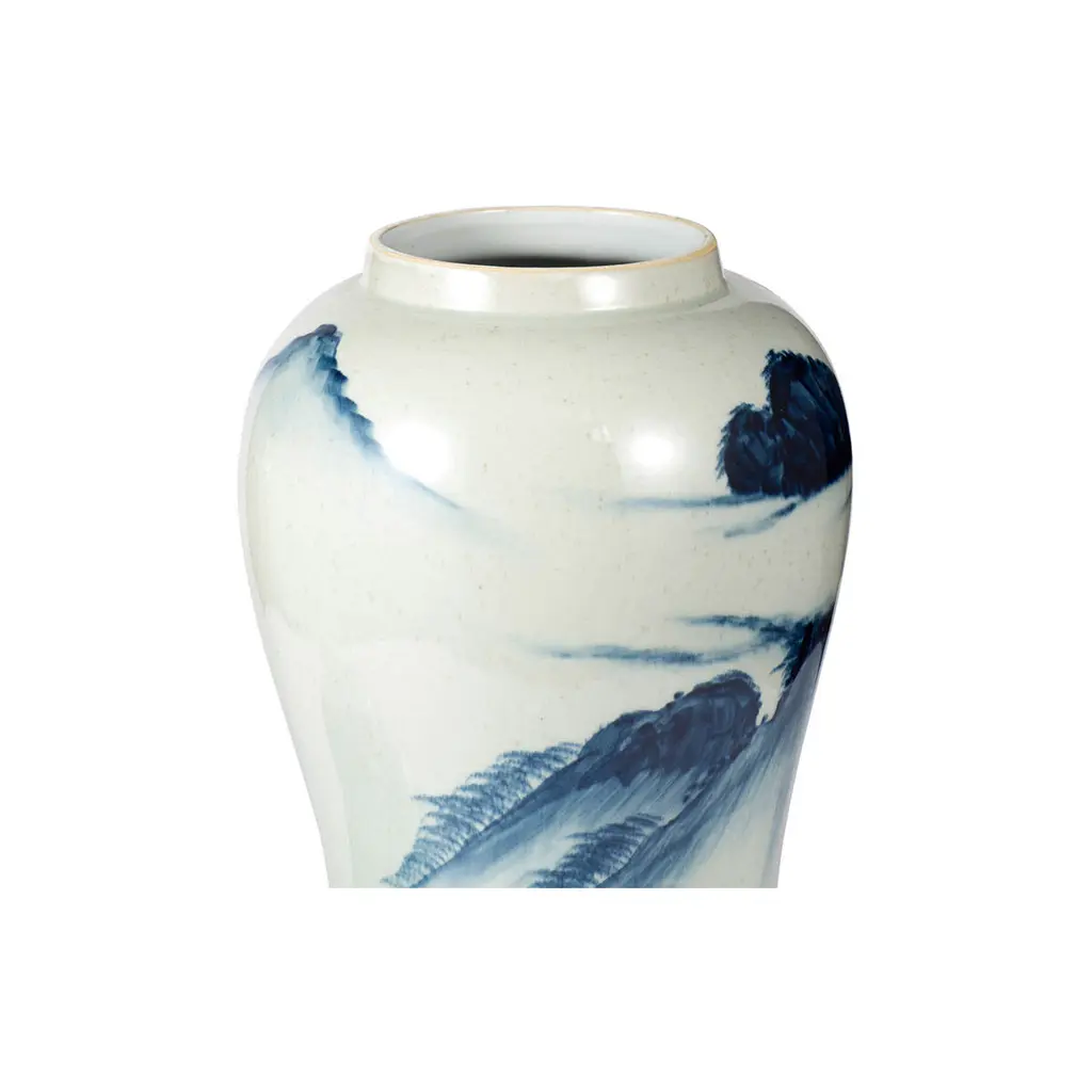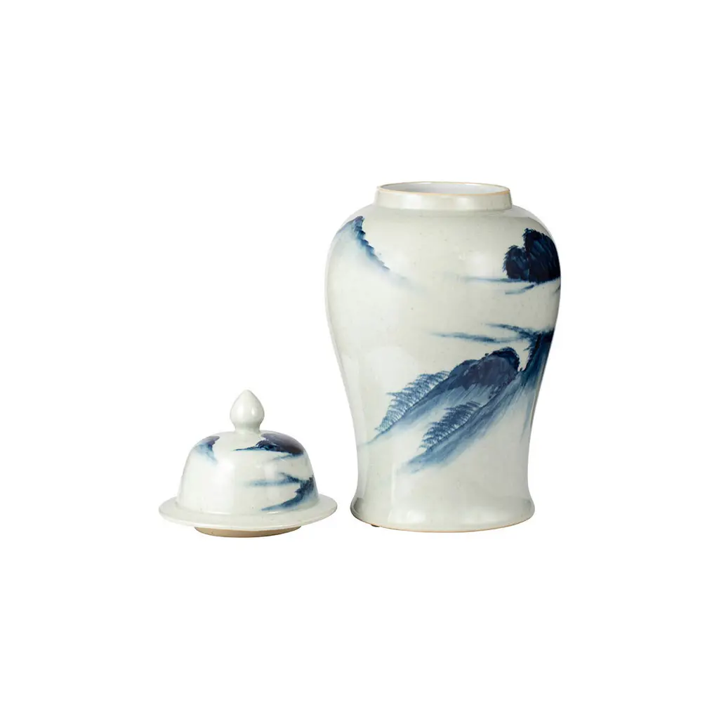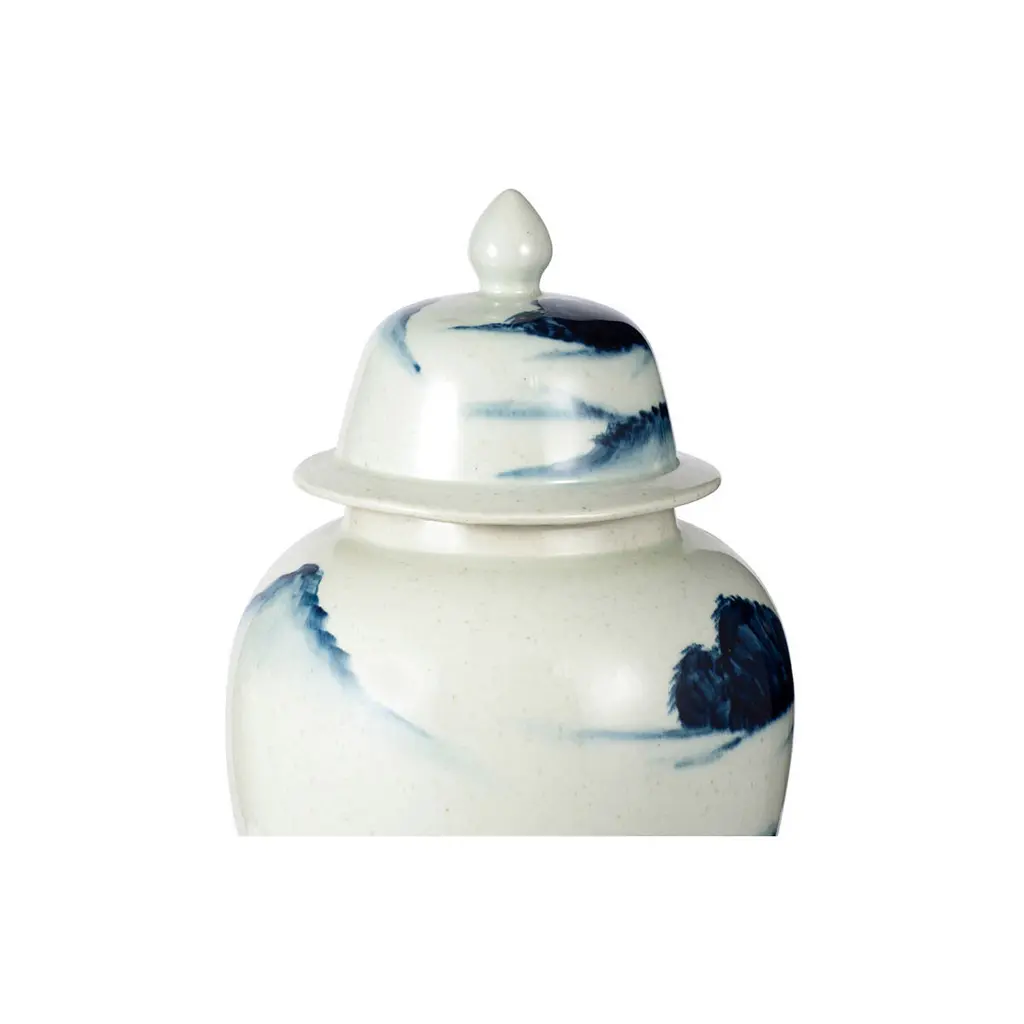 The Windswept Ginger Jar evokes an ageless splendor with a rich blue landscape painted on a classic white ceramic jar. The jar's sleek silhouette is elegant enough for an office shelf, the piece also makes an exquisite addition to a traditional sunroom, globally-inspired living room, or classic kitchen. Use to store items or fill with opulent blooms for a lavish look.