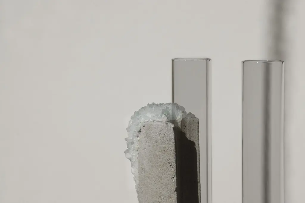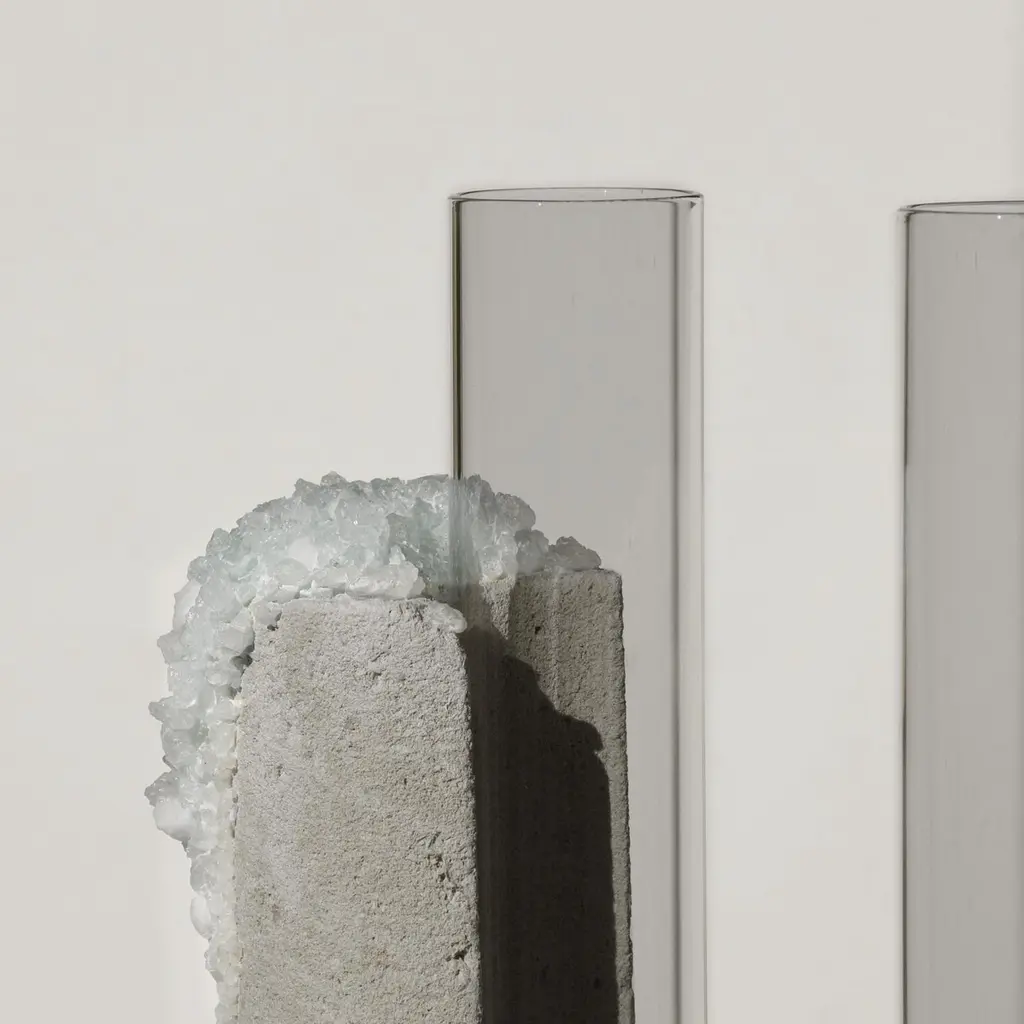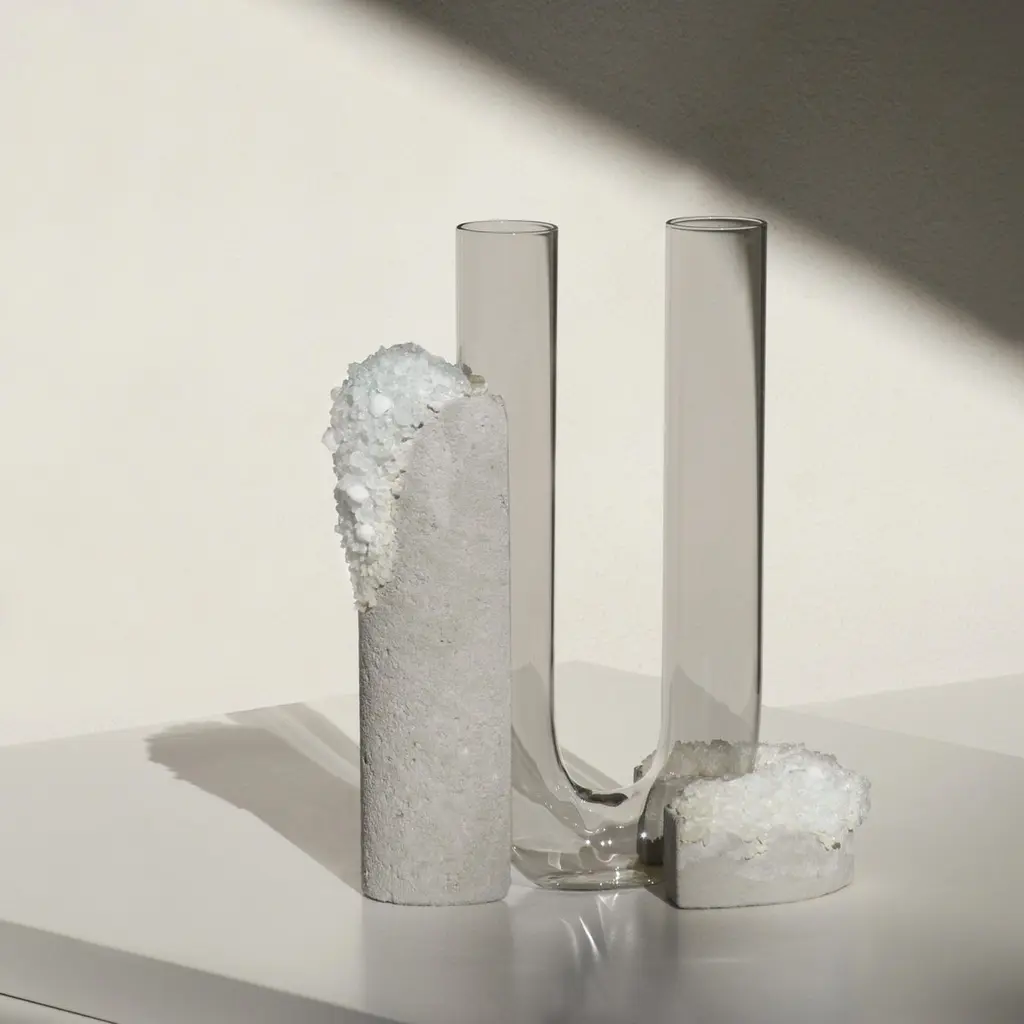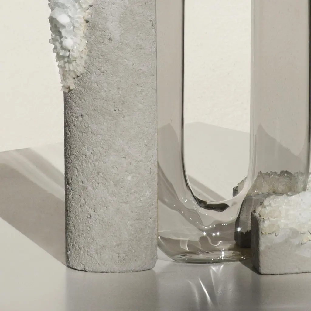 Winter 1 Cochlea Della Consapevolezza Seasons Edition Vase by Coki BarbieriDimensions: W 24 x D 14 x H 30 cm.Materials: Handcrafted stone made with Matera stone fragments, sedimentary rocks of the Italian Apennines and pure water, Italian rock salt crystals, black mineral pigments from Italian soils, smoked painted borosilicate glassCochlea della Consapevolezza - SEASONS EDITION - Winter 1Embellished with Italian rock salt crystals colored with natural pigments from the Italian subsoil, this vase from the Cochlea collection (inspired by the metamorphosis of snails) represents architecture and nature united together: curved and geometric shapes resulting from glass and sustainable stone.Like all COKI products, it is entirely made in Italy with raw materials processed according to the highest standards of recovery of virgin stones and using only substances that are not harmful to humans and the environment, without components of animal origin.The particular technique Glaciazione makes it possible to unite crystals and the handcrafted stone created from fragments of historical stones found in Matera (Città dei Sassi, UNESCO World Heritage, European Capital of Culture) and sedimentary rocks of the Italian Apennines, recovered and reprocessed following a sustainable production cycle. This material research is originalfrom the COKI studio and uses a natural chemical and physical adhesion process between the two materials. The result is a composite material, biodegradable in water, so it is recommended not to wet the stone part and always keep it away from sources of humidity.A precious objects collection made in Italy with natural and vegan origin materials, conceived by architectural and product designer Coki Barbieri and created by the local craftsmen to expand a new slow living awareness and surround oneself with a few objects, capable of staying alongside us over time.The climate emergency and increased future anxiety push our work to imagine alternative ways of living, producing, and consuming. For that Coki Barbieri uses notions of geology, chemistry, and design culture to create new products (and materials) from fragments and waste from natural products (such as stone and minerals).Coki Barbieri established her eponymous studio-workshop in Rimini in 2017, bringing to life a sustainable way of conceiving the product design for home. Nature inspires her environmentally conscious creations, which are imbued with emotional energy while maintaining their aesthetic impact and practical functionality. Coki collaborates with talented Italian craftsmen to produce one-of-a-kind homeware objects capable of unlocking new synergies between concepts, materials, and use.