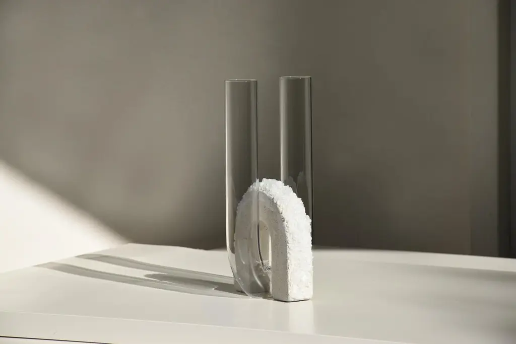 Winter 1 Cochlea Della Liberazione Seasons Edition Vase by Coki BarbieriDimensions: W 14 x D 14 x H 30 cm.Materials: Handcrafted stone made with Matera stone fragments, sedimentary rocks of the Italian Apennines and pure water, Italian rock salt crystals, black and blue mineral pigments from Italian soils, smoked painted borosilicate glassCochlea della Liberazione - SEASONS EDITION - Winter 1Embellished with Italian rock salt crystals colored with natural pigments from the Italian subsoil, this vase from the Cochlea collection (inspired by the metamorphosis of snails) represents architecture and nature united together: curved and geometric shapes resulting from glass and sustainable stone.Like all COKI products, it is entirely made in Italy with raw materials processed according to the highest standards of recovery of virgin stones and using only substances that are not harmful to humans and the environment, without components of animal origin.The particular technique Glaciazione makes it possible to unite crystals and the handcrafted stone created from fragments of historical stones found in Matera (Città dei Sassi, UNESCO World Heritage, European Capital of Culture) and sedimentary rocks of the Italian Apennines, recovered and reprocessed following a sustainable production cycle. This material research is originalfrom the COKI studio and uses a natural chemical and physical adhesion process between the two materials. The result is a composite material, biodegradable in water, so it is recommended not to wet the stone part and always keep it away from sources of humidity.A precious objects collection made in Italy with natural and vegan origin materials, conceived by architectural and product designer Coki Barbieri and created by the local craftsmen to expand a new slow living awareness and surround oneself with a few objects, capable of staying alongside us over time.The climate emergency and increased future anxiety push our work to imagine alternative ways of living, producing, and consuming. For that Coki Barbieri uses notions of geology, chemistry, and design culture to create new products (and materials) from fragments and waste from natural products (such as stone and minerals).Coki Barbieri established her eponymous studio-workshop in Rimini in 2017, bringing to life a sustainable way of conceiving the product design for home. Nature inspires her environmentally conscious creations, which are imbued with emotional energy while maintaining their aesthetic impact and practical functionality. Coki collaborates with talented Italian craftsmen to produce one-of-a-kind homeware objects capable of unlocking new synergies between concepts, materials, and use.
