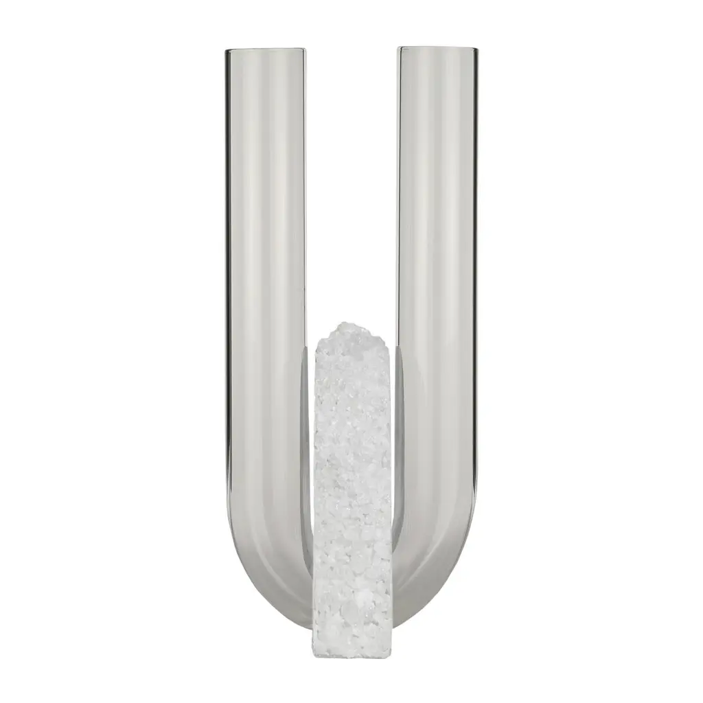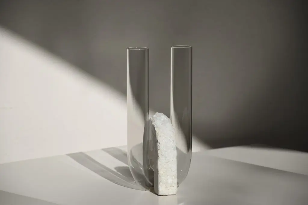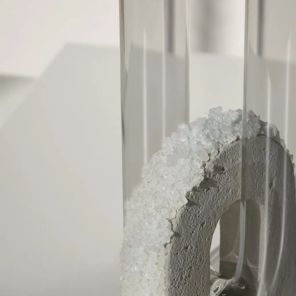 Winter 1 Cochlea Della Liberazione Seasons Edition Vase by Coki BarbieriDimensions: W 14 x D 14 x H 30 cm.Materials: Handcrafted stone made with Matera stone fragments, sedimentary rocks of the Italian Apennines and pure water, Italian rock salt crystals, black and blue mineral pigments from Italian soils, smoked painted borosilicate glassCochlea della Liberazione - SEASONS EDITION - Winter 1Embellished with Italian rock salt crystals colored with natural pigments from the Italian subsoil, this vase from the Cochlea collection (inspired by the metamorphosis of snails) represents architecture and nature united together: curved and geometric shapes resulting from glass and sustainable stone.Like all COKI products, it is entirely made in Italy with raw materials processed according to the highest standards of recovery of virgin stones and using only substances that are not harmful to humans and the environment, without components of animal origin.The particular technique Glaciazione makes it possible to unite crystals and the handcrafted stone created from fragments of historical stones found in Matera (Città dei Sassi, UNESCO World Heritage, European Capital of Culture) and sedimentary rocks of the Italian Apennines, recovered and reprocessed following a sustainable production cycle. This material research is originalfrom the COKI studio and uses a natural chemical and physical adhesion process between the two materials. The result is a composite material, biodegradable in water, so it is recommended not to wet the stone part and always keep it away from sources of humidity.A precious objects collection made in Italy with natural and vegan origin materials, conceived by architectural and product designer Coki Barbieri and created by the local craftsmen to expand a new slow living awareness and surround oneself with a few objects, capable of staying alongside us over time.The climate emergency and increased future anxiety push our work to imagine alternative ways of living, producing, and consuming. For that Coki Barbieri uses notions of geology, chemistry, and design culture to create new products (and materials) from fragments and waste from natural products (such as stone and minerals).Coki Barbieri established her eponymous studio-workshop in Rimini in 2017, bringing to life a sustainable way of conceiving the product design for home. Nature inspires her environmentally conscious creations, which are imbued with emotional energy while maintaining their aesthetic impact and practical functionality. Coki collaborates with talented Italian craftsmen to produce one-of-a-kind homeware objects capable of unlocking new synergies between concepts, materials, and use.