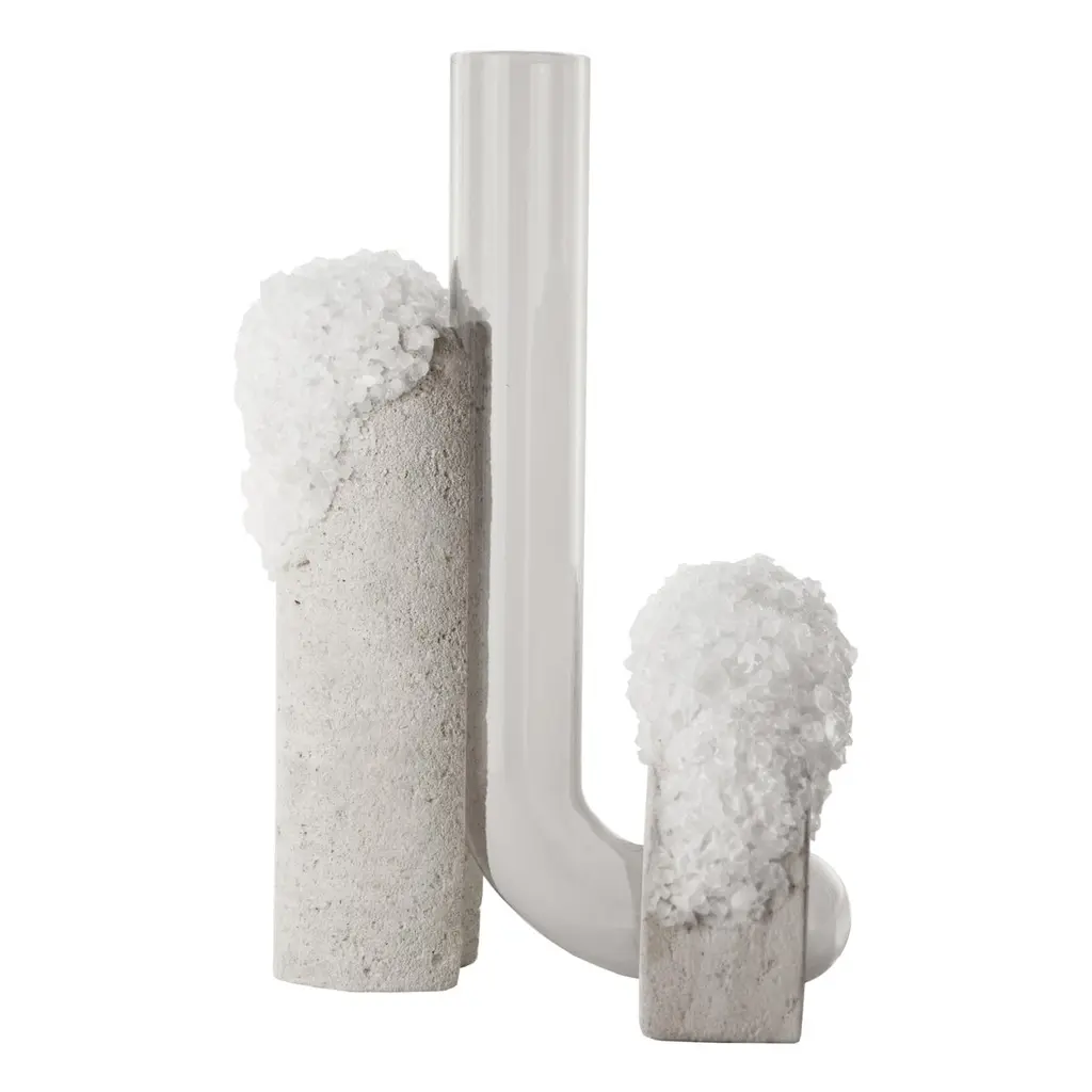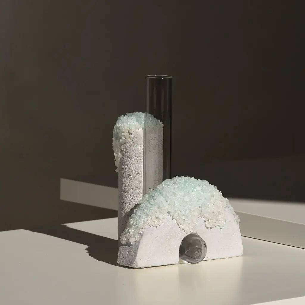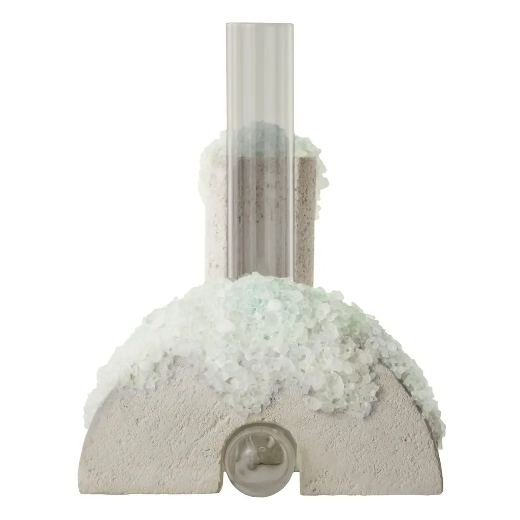 Winter 1 Cochlea della Metamorfosi 1 Seasons Edition Vase by Coki BarbieriDimensions: W 18,5 x D 15 x H 24 cm.Materials: Handcrafted stone made with Matera stone fragments, sedimentary rocks of the Italian Apennines and pure water, Italian rock salt crystals, black and blue mineral pigments from Italian soils, smoked painted borosilicate glass.Cochlea della Metamorfosi 1 - SEASONS EDITION - Winter 1Embellished with Italian rock salt crystals colored with natural pigments from the Italian subsoil, this vase from the Cochlea collection (inspired by the metamorphosis of snails) represents architecture and nature united together: curved and geometric shapes resulting from glass and sustainable stone.Like all COKI products, it is entirely made in Italy with raw materials processed according to the highest standards of recovery of virgin stones and using only substances that are not harmful to humans and the environment, without components of animal origin.The particular technique Glaciazione makes it possible to unite crystals and the handcrafted stone created from fragments of historical stones found in Matera (Città dei Sassi, UNESCO World Heritage, European Capital of Culture) and sedimentary rocks of the Italian Apennines, recovered and reprocessed following a sustainable production cycle. This material research is originalfrom the COKI studio and uses a natural chemical and physical adhesion process between the two materials. The result is a composite material, biodegradable in water, so it is recommended not to wet the stone part and always keep it away from sources of humidity.A precious objects collection made in Italy with natural and vegan origin materials, conceived by architectural and product designer Coki Barbieri and created by the local craftsmen to expand a new slow living awareness and surround oneself with a few objects, capable of staying alongside us over time.The climate emergency and increased future anxiety push our work to imagine alternative ways of living, producing, and consuming. For that Coki Barbieri uses notions of geology, chemistry, and design culture to create new products (and materials) from fragments and waste from natural products (such as stone and minerals).Coki Barbieri established her eponymous studio-workshop in Rimini in 2017, bringing to life a sustainable way of conceiving the product design for home. Nature inspires her environmentally conscious creations, which are imbued with emotional energy while maintaining their aesthetic impact and practical functionality. Coki collaborates with talented Italian craftsmen to produce one-of-a-kind homeware objects capable of unlocking new synergies between concepts, materials, and use.