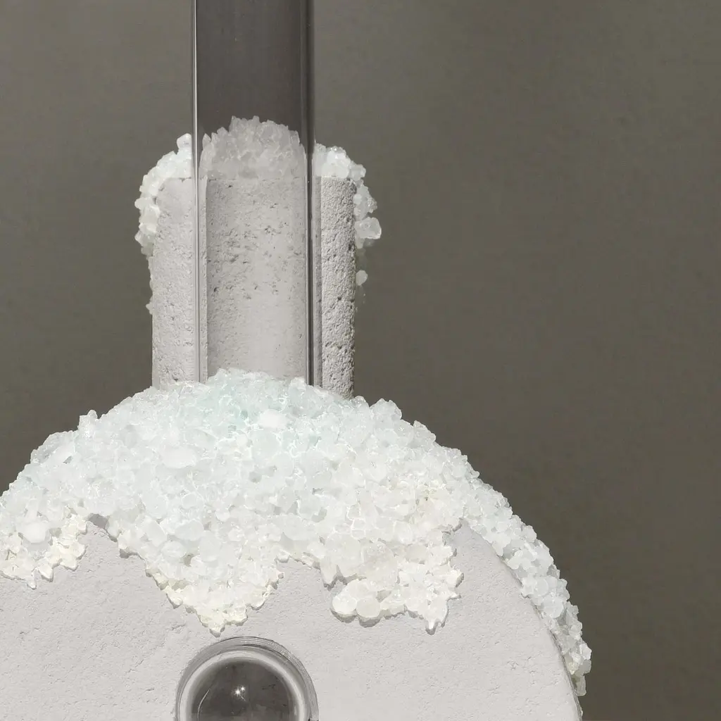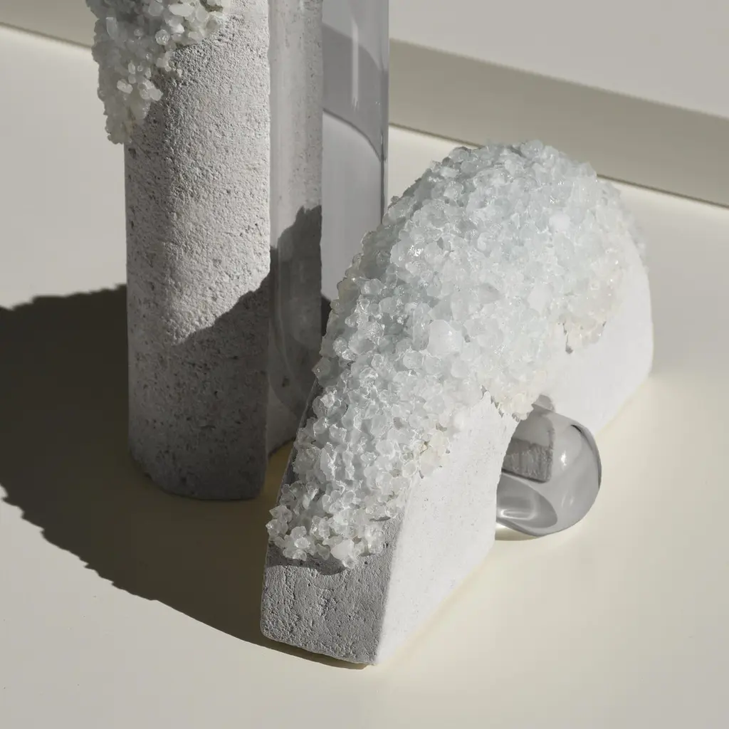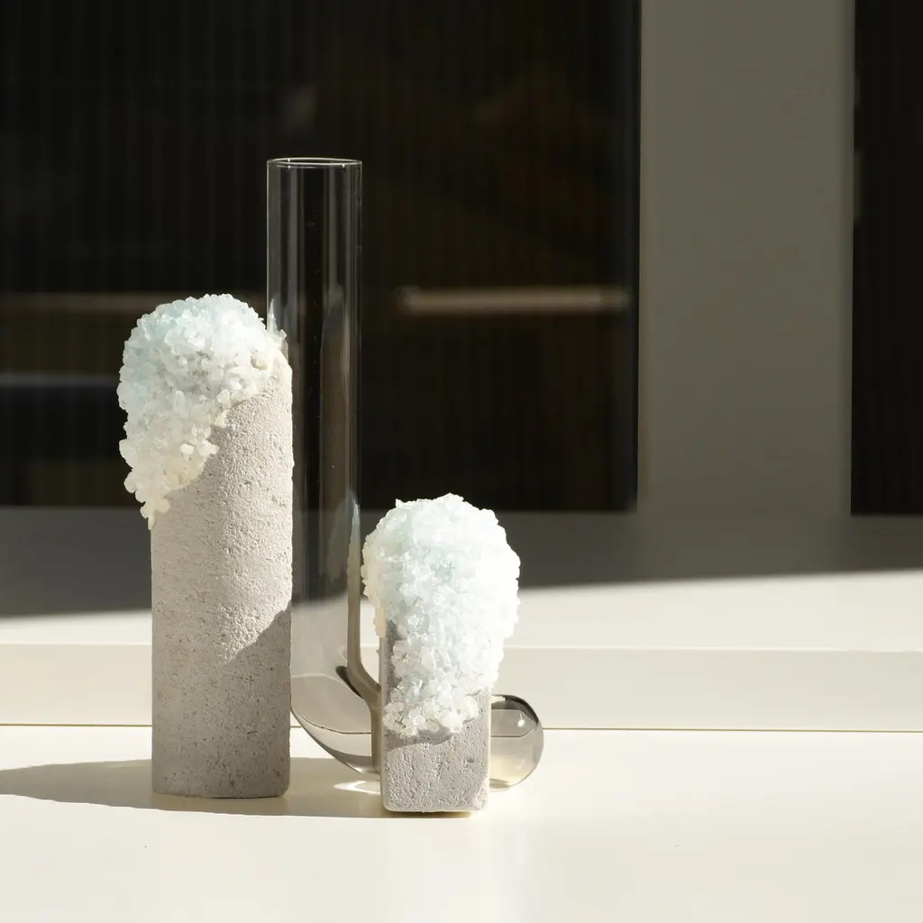 Winter 1 Cochlea della Metamorfosi 1 Seasons Edition Vase by Coki BarbieriDimensions: W 18,5 x D 15 x H 24 cm.Materials: Handcrafted stone made with Matera stone fragments, sedimentary rocks of the Italian Apennines and pure water, Italian rock salt crystals, black and blue mineral pigments from Italian soils, smoked painted borosilicate glass.Cochlea della Metamorfosi 1 - SEASONS EDITION - Winter 1Embellished with Italian rock salt crystals colored with natural pigments from the Italian subsoil, this vase from the Cochlea collection (inspired by the metamorphosis of snails) represents architecture and nature united together: curved and geometric shapes resulting from glass and sustainable stone.Like all COKI products, it is entirely made in Italy with raw materials processed according to the highest standards of recovery of virgin stones and using only substances that are not harmful to humans and the environment, without components of animal origin.The particular technique Glaciazione makes it possible to unite crystals and the handcrafted stone created from fragments of historical stones found in Matera (Città dei Sassi, UNESCO World Heritage, European Capital of Culture) and sedimentary rocks of the Italian Apennines, recovered and reprocessed following a sustainable production cycle. This material research is originalfrom the COKI studio and uses a natural chemical and physical adhesion process between the two materials. The result is a composite material, biodegradable in water, so it is recommended not to wet the stone part and always keep it away from sources of humidity.A precious objects collection made in Italy with natural and vegan origin materials, conceived by architectural and product designer Coki Barbieri and created by the local craftsmen to expand a new slow living awareness and surround oneself with a few objects, capable of staying alongside us over time.The climate emergency and increased future anxiety push our work to imagine alternative ways of living, producing, and consuming. For that Coki Barbieri uses notions of geology, chemistry, and design culture to create new products (and materials) from fragments and waste from natural products (such as stone and minerals).Coki Barbieri established her eponymous studio-workshop in Rimini in 2017, bringing to life a sustainable way of conceiving the product design for home. Nature inspires her environmentally conscious creations, which are imbued with emotional energy while maintaining their aesthetic impact and practical functionality. Coki collaborates with talented Italian craftsmen to produce one-of-a-kind homeware objects capable of unlocking new synergies between concepts, materials, and use.