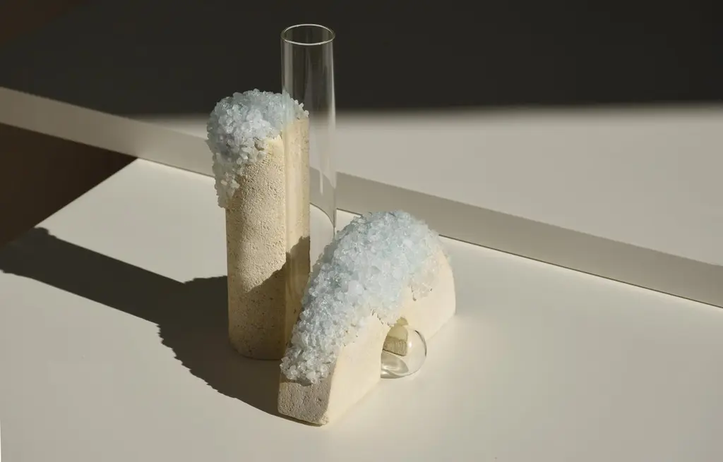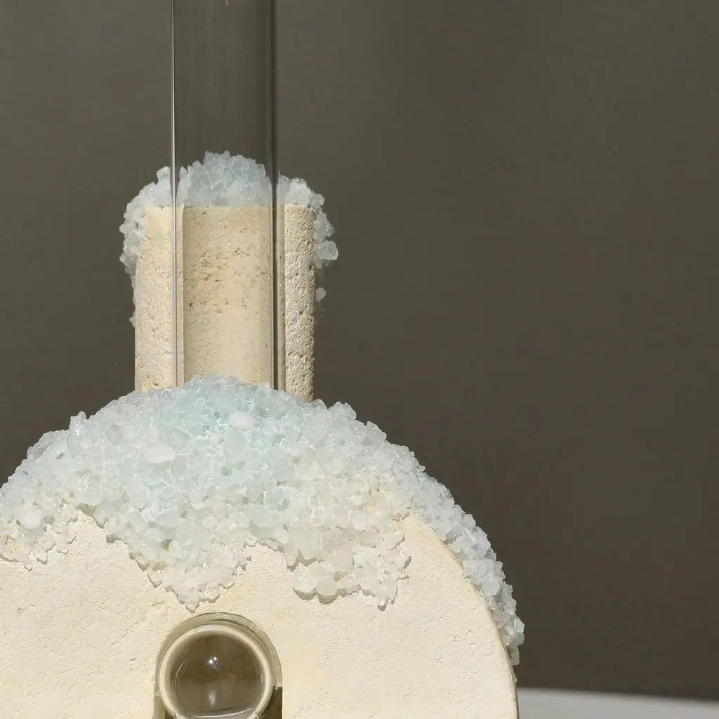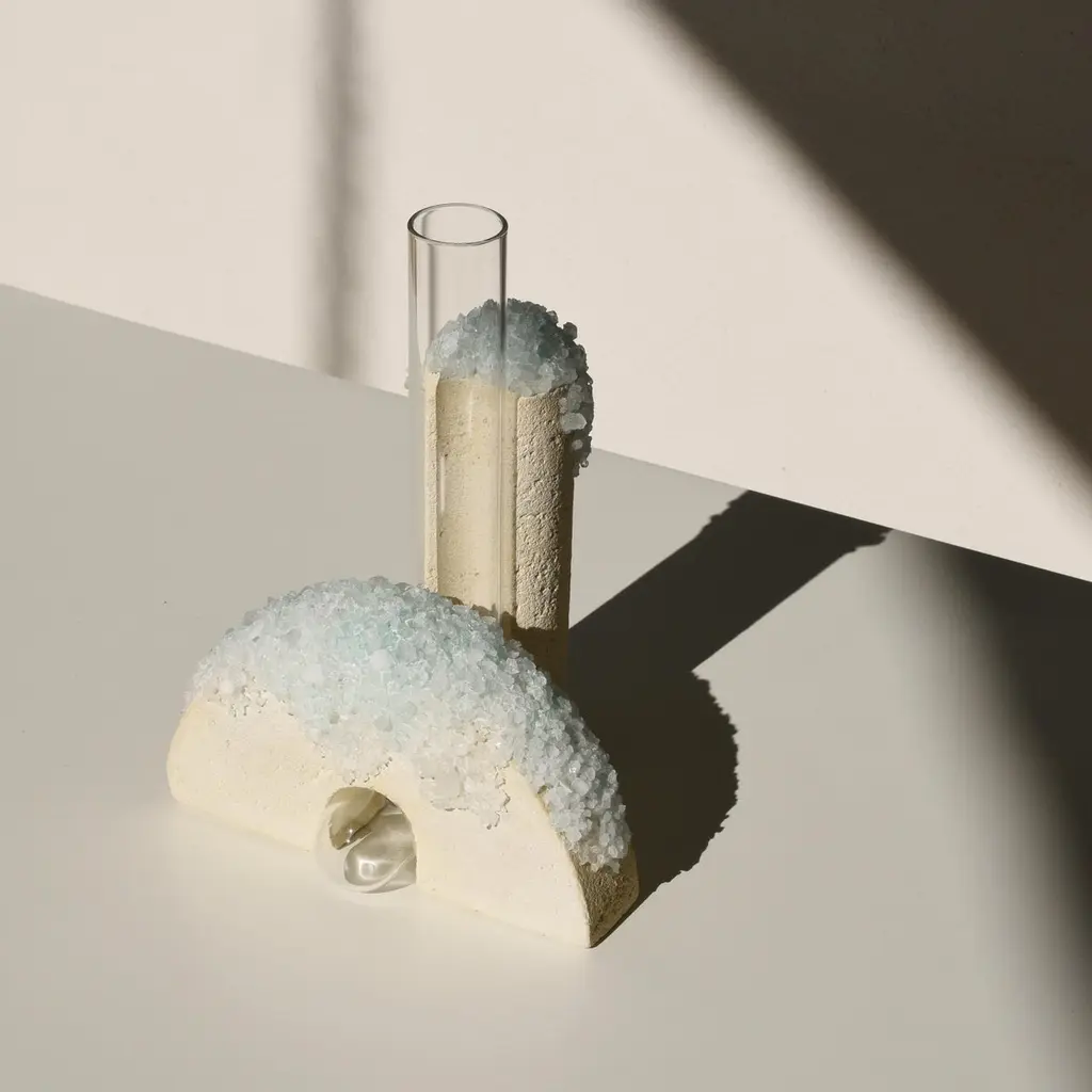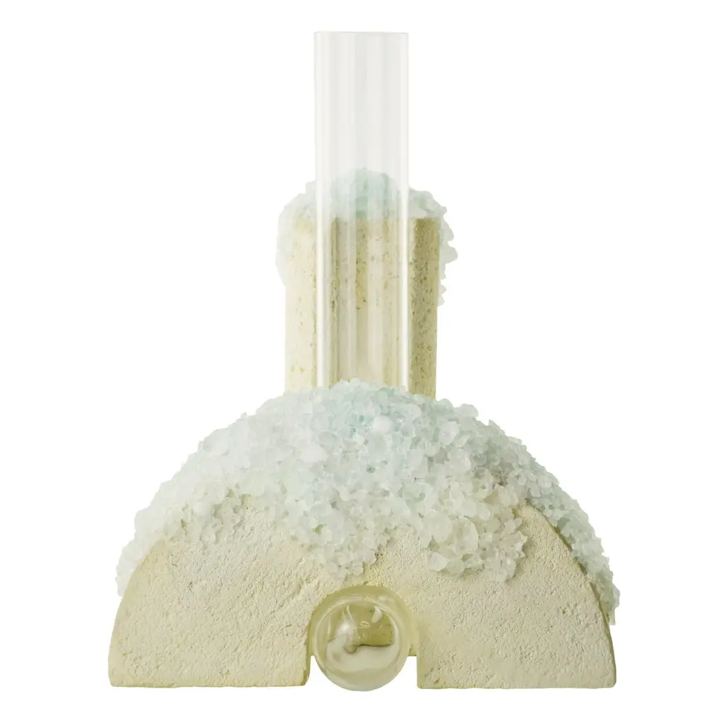 Winter 2 Cochlea della Metamorfosi 1 Seasons Edition Vase by Coki BarbieriDimensions: W 18,5 x D 15 x H 24 cm.Materials: Handcrafted stone made with Matera stone fragments, sedimentary rocks of the Italian Apennines and pure water, Italian rock salt crystals, blue mineral pigments from Italian soils, clear painted borosilicate glass.Cochlea della Metamorfosi 1 - SEASONS EDITION - Winter 1Embellished with Italian rock salt crystals colored with natural pigments from the Italian subsoil, this vase from the Cochlea collection (inspired by the metamorphosis of snails) represents architecture and nature united together: curved and geometric shapes resulting from glass and sustainable stone.Like all COKI products, it is entirely made in Italy with raw materials processed according to the highest standards of recovery of virgin stones and using only substances that are not harmful to humans and the environment, without components of animal origin.The particular technique Glaciazione makes it possible to unite crystals and the handcrafted stone created from fragments of historical stones found in Matera (Città dei Sassi, UNESCO World Heritage, European Capital of Culture) and sedimentary rocks of the Italian Apennines, recovered and reprocessed following a sustainable production cycle. This material research is originalfrom the COKI studio and uses a natural chemical and physical adhesion process between the two materials. The result is a composite material, biodegradable in water, so it is recommended not to wet the stone part and always keep it away from sources of humidity.A precious objects collection made in Italy with natural and vegan origin materials, conceived by architectural and product designer Coki Barbieri and created by the local craftsmen to expand a new slow living awareness and surround oneself with a few objects, capable of staying alongside us over time.The climate emergency and increased future anxiety push our work to imagine alternative ways of living, producing, and consuming. For that Coki Barbieri uses notions of geology, chemistry, and design culture to create new products (and materials) from fragments and waste from natural products (such as stone and minerals).Coki Barbieri established her eponymous studio-workshop in Rimini in 2017, bringing to life a sustainable way of conceiving the product design for home. Nature inspires her environmentally conscious creations, which are imbued with emotional energy while maintaining their aesthetic impact and practical functionality. Coki collaborates with talented Italian craftsmen to produce one-of-a-kind homeware objects capable of unlocking new synergies between concepts, materials, and use.
