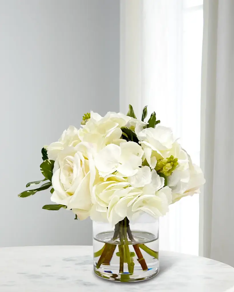 Winward Home Hydrangeas & Roses 9" Faux Floral Arrangement In Glass Vase | Horchow