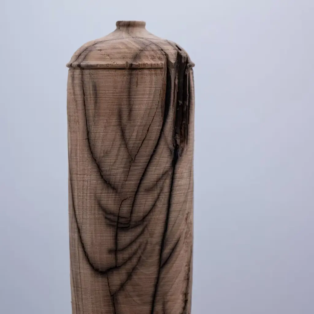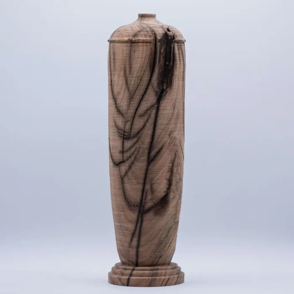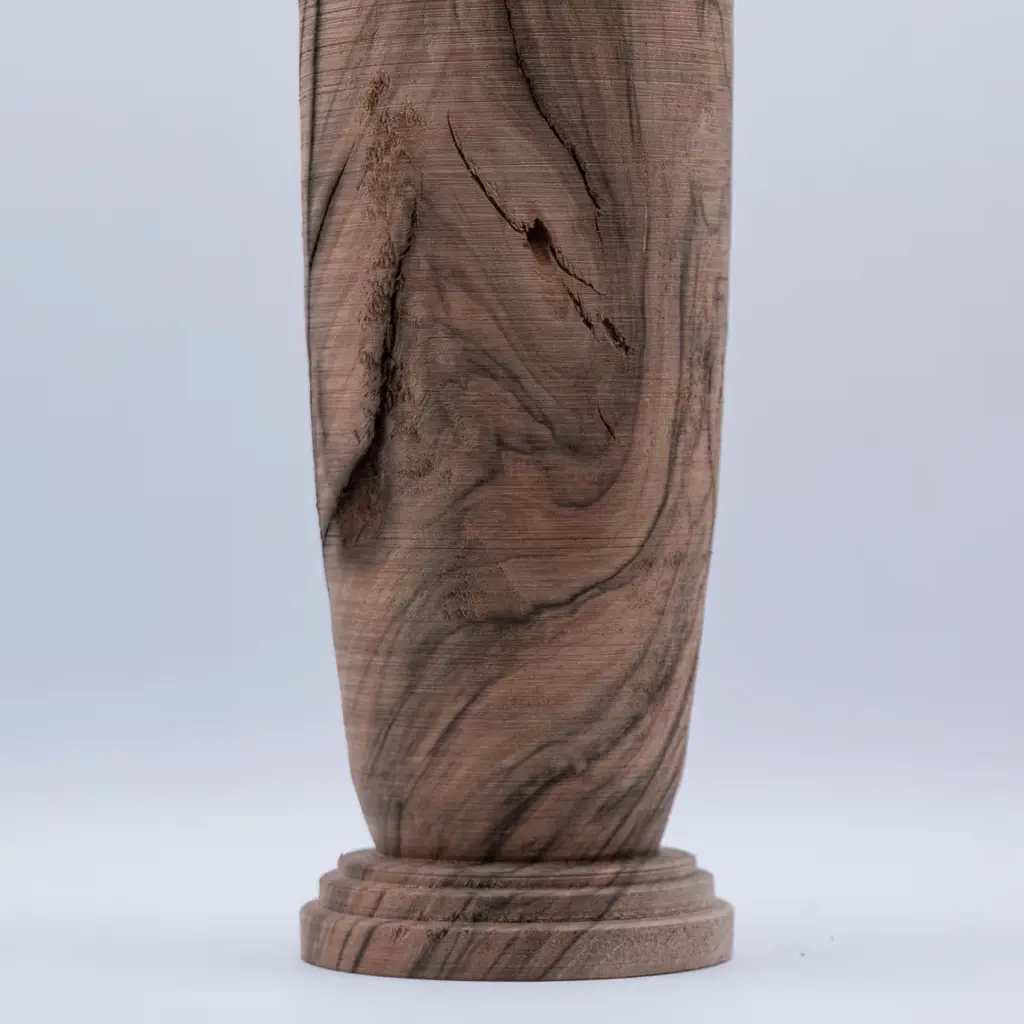 Entirely handcrafted by master woodworker Andrea Celestino, this stunning decorative vase stuns with its exceptional wood grain and graceful silhouette, mounted on a tiered base. Fashioned of walnut wood, the wood is treated with olive oil to seal its natural properties and prevent decay. Do not fill or immerse with water, clean only using a damp cloth.