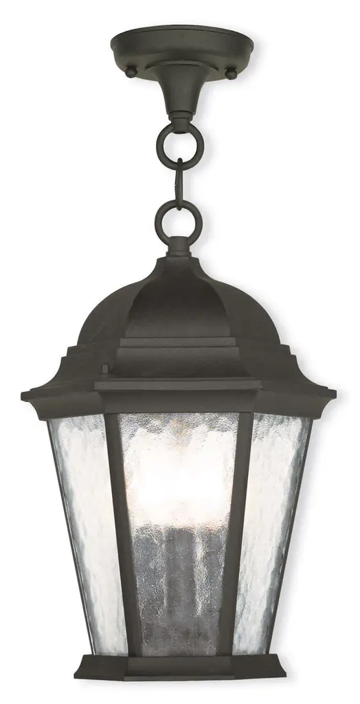 Add more design to the exterior walls of your home with this XL Three Light Matte Black Urn Shaped Hanging Light. The hanging chain has a simple matte black finish on it and is attached to a round hook. The hook attaches to the top of the main body of the light. The light has a domed top with an urn shaped glass globe in the middle. capped by an ornament shape at the bottom. The glass globe has a striped design on it and a slight raindrop pattern. Inside there are three bulbs that allow for more brightness. This light will look great in your front porch, your backyard, or even on your shed or garage wall . 25.25" H x 11.5" W x 11.5" D