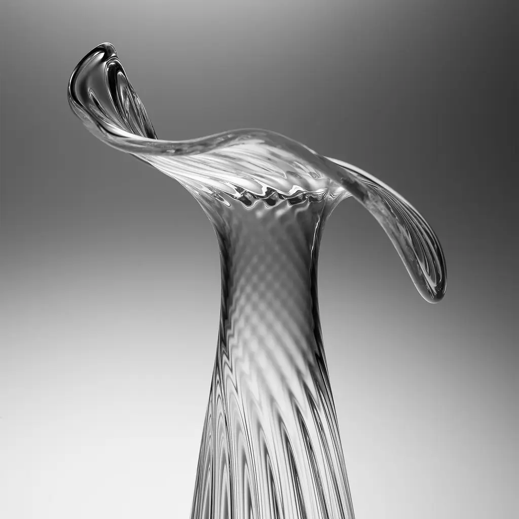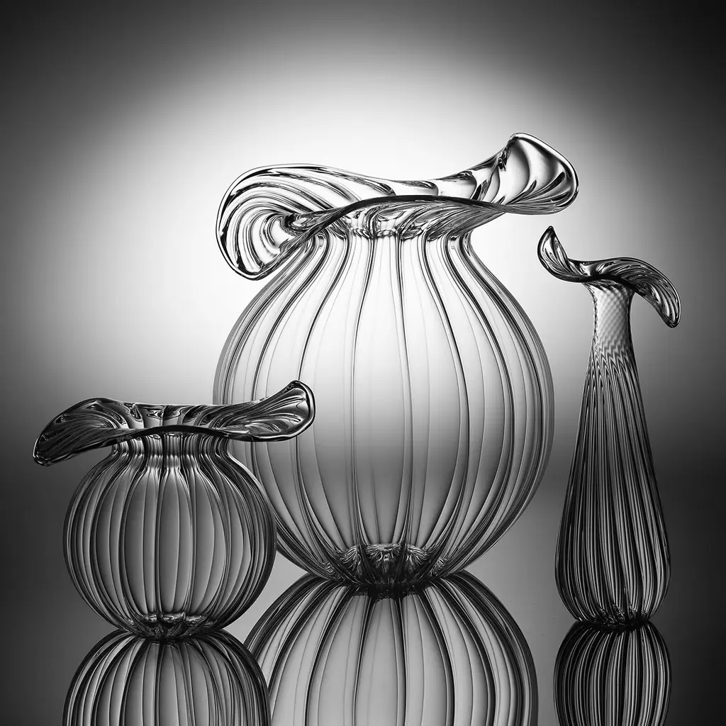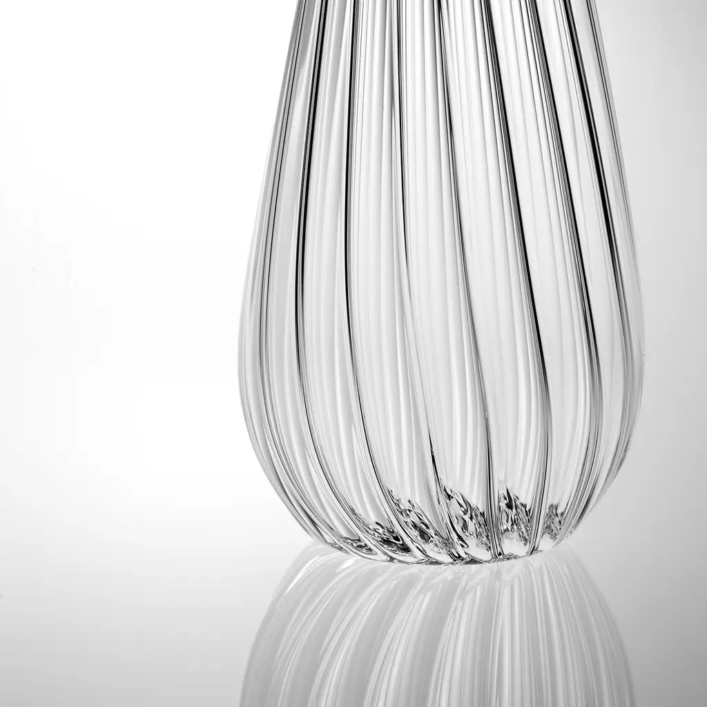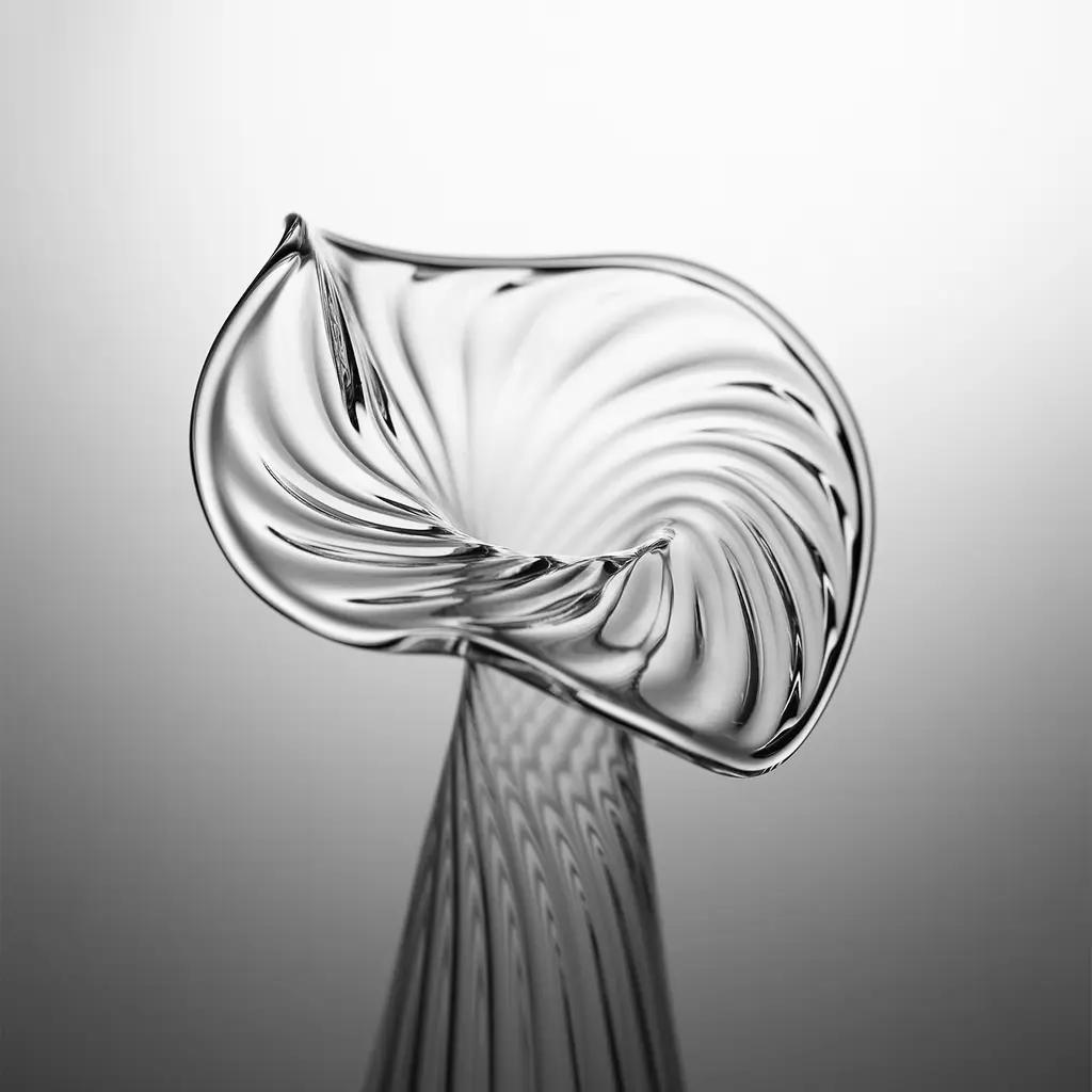 The XSmall Millerighe Soliflore vase is a captivating piece that embodies the elegance of traditional Italian design. Featuring a delicate silhouette reminiscent of a leaf suspended in mid-air, this vase showcases a distinctive striped surface with a unique ‘millerighe’ pattern. Evoking the grace of a dance, the upper portion of the vase gracefully flares open, reminiscent of a peacock’s tail, enhancing its visual appeal and inviting attention. Each vase is thoughtfully crafted, reflecting the mastery of Italian glass artisans and the harmonious blend of artistry and craftsmanship. This exquisite item stands as a testament to refinement and delicacy, making it a striking addition to any home décor. Limited edition piece, ensuring that it not only serves as a functional item but also as a stand-alone work of art.