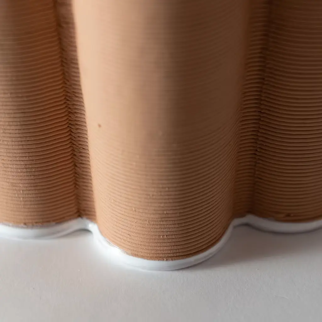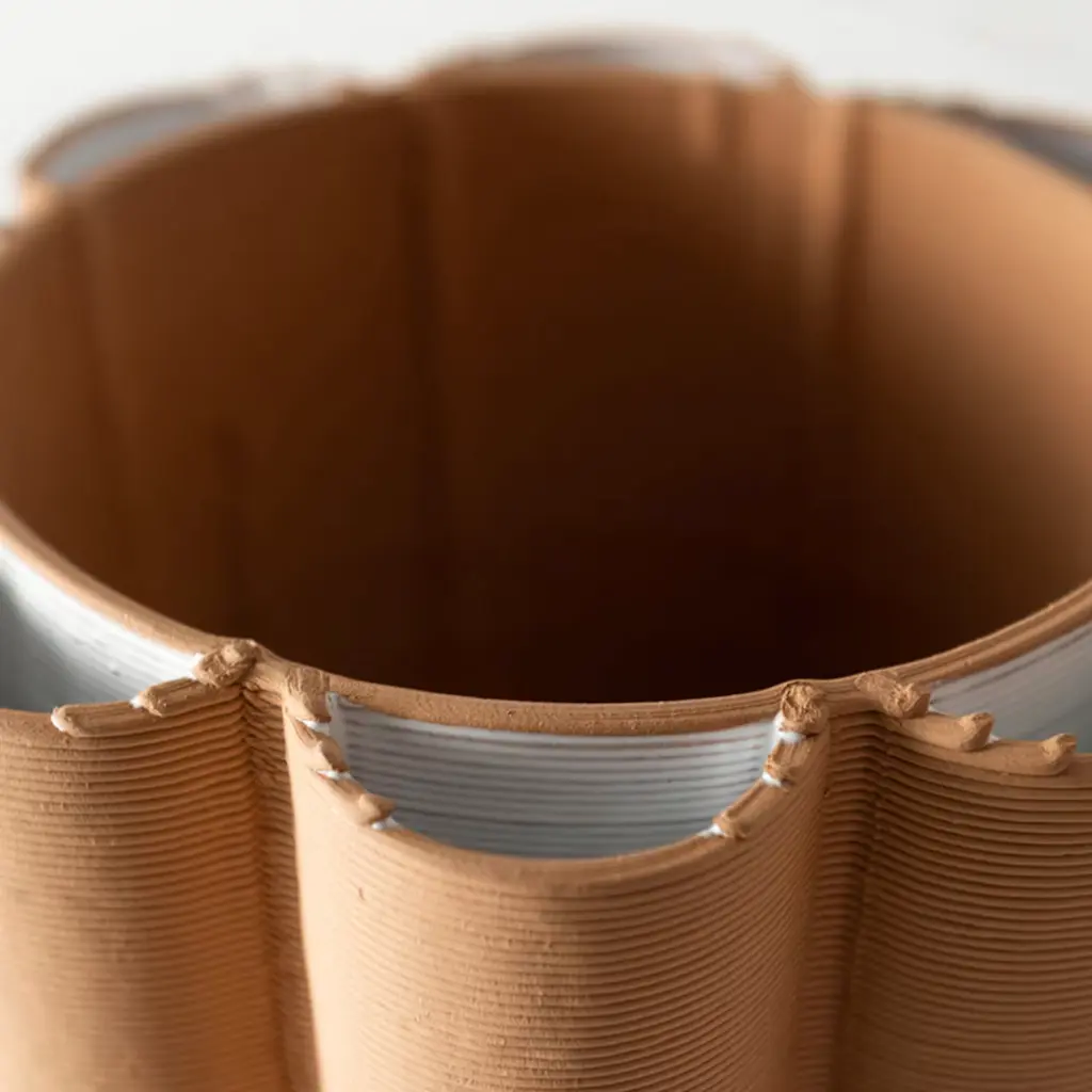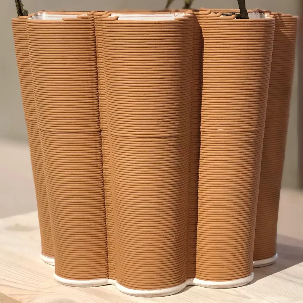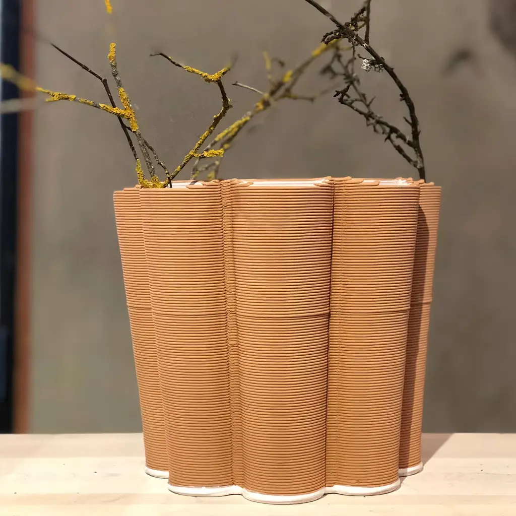 Printed with 3D technology, this splendid vase fashioned of red clay is entirely glazed by hand and decorated with white details. The versatile and innovative tubular silhouette allows for creating free-form compositions with plants and flowers. It features a functional water storage receptacle activated by the porosity of the material.