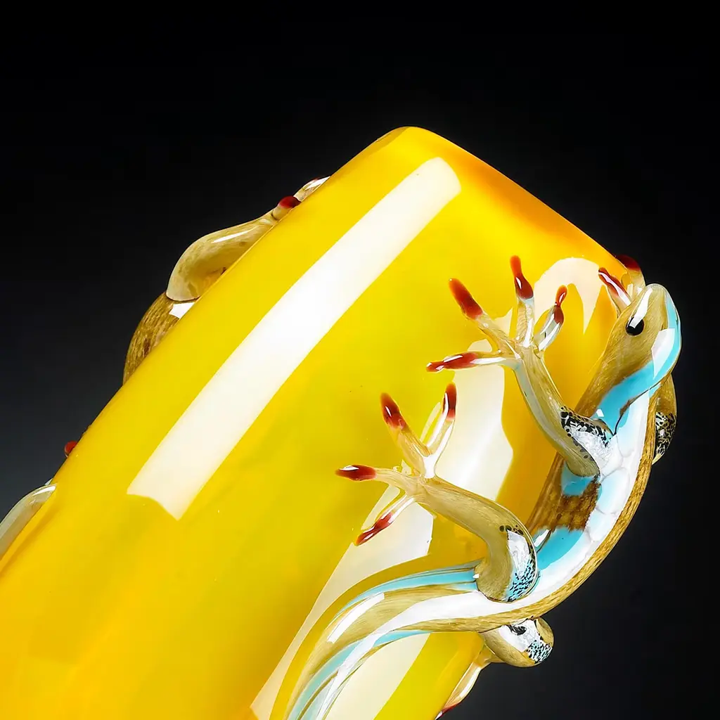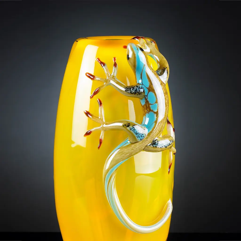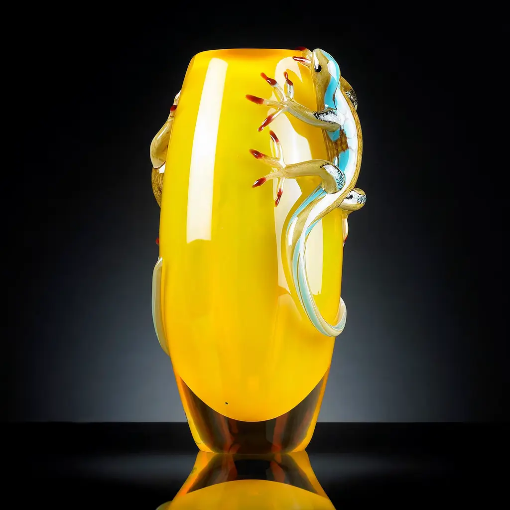 Marked by a soft cylindrical shape, this exquisite vase will make a statement of its own in a modern interior. Entirely handcrafted of blown glass, the vibrant yellow silhouette is adorned with two green and red geckos adding movement to this charming piece. Available in other sizes and colors to display together for a truly original look.