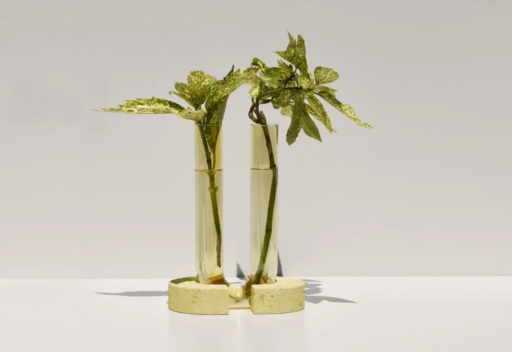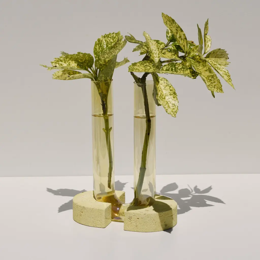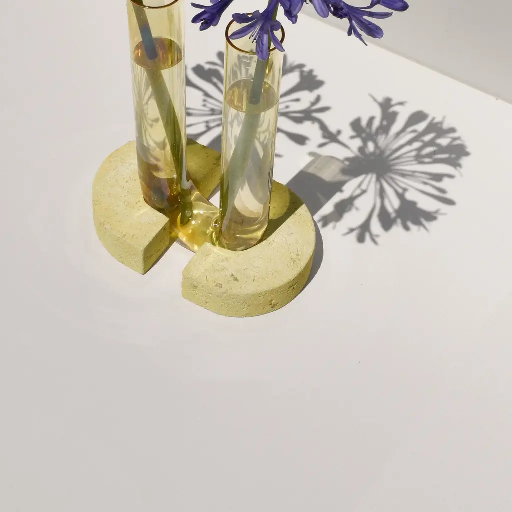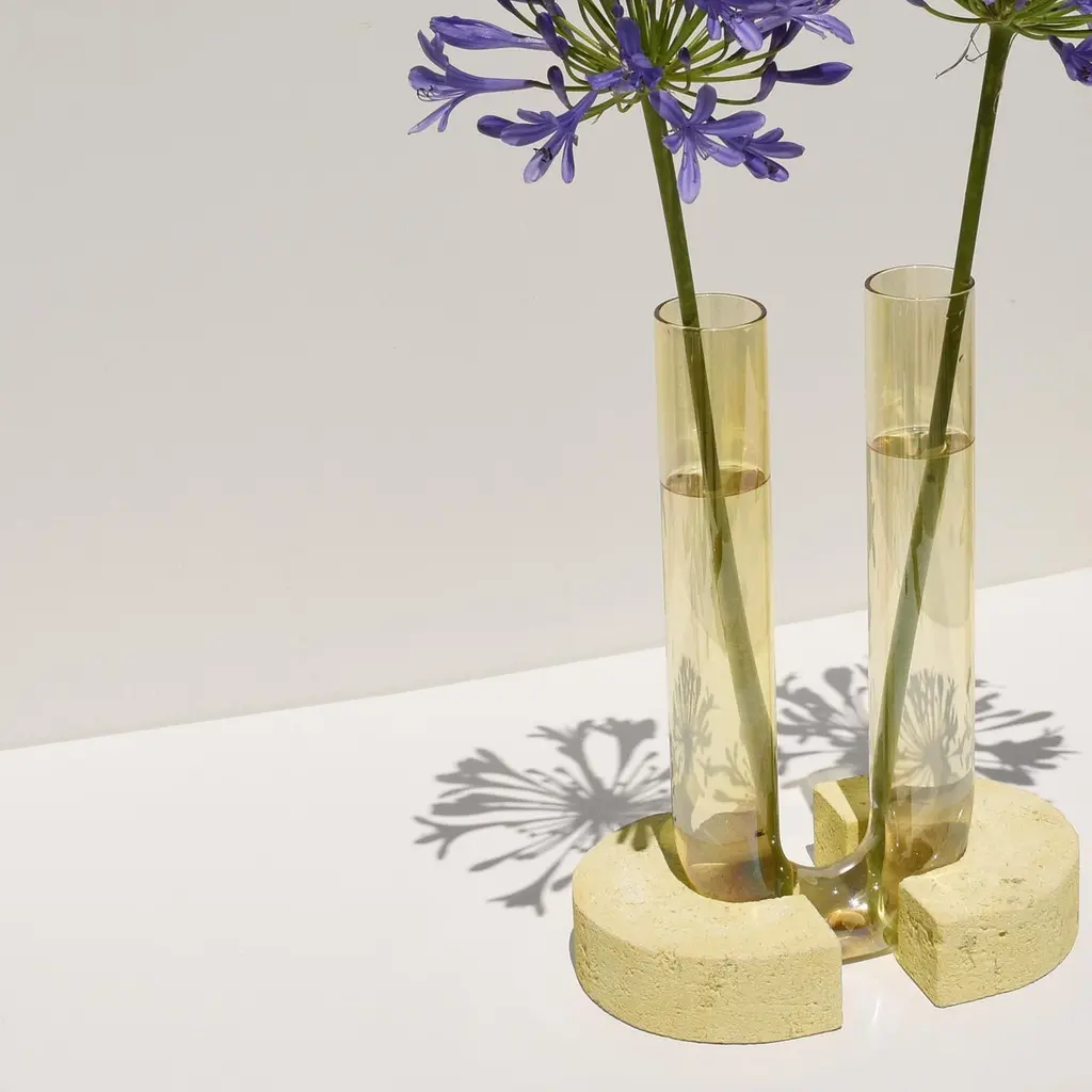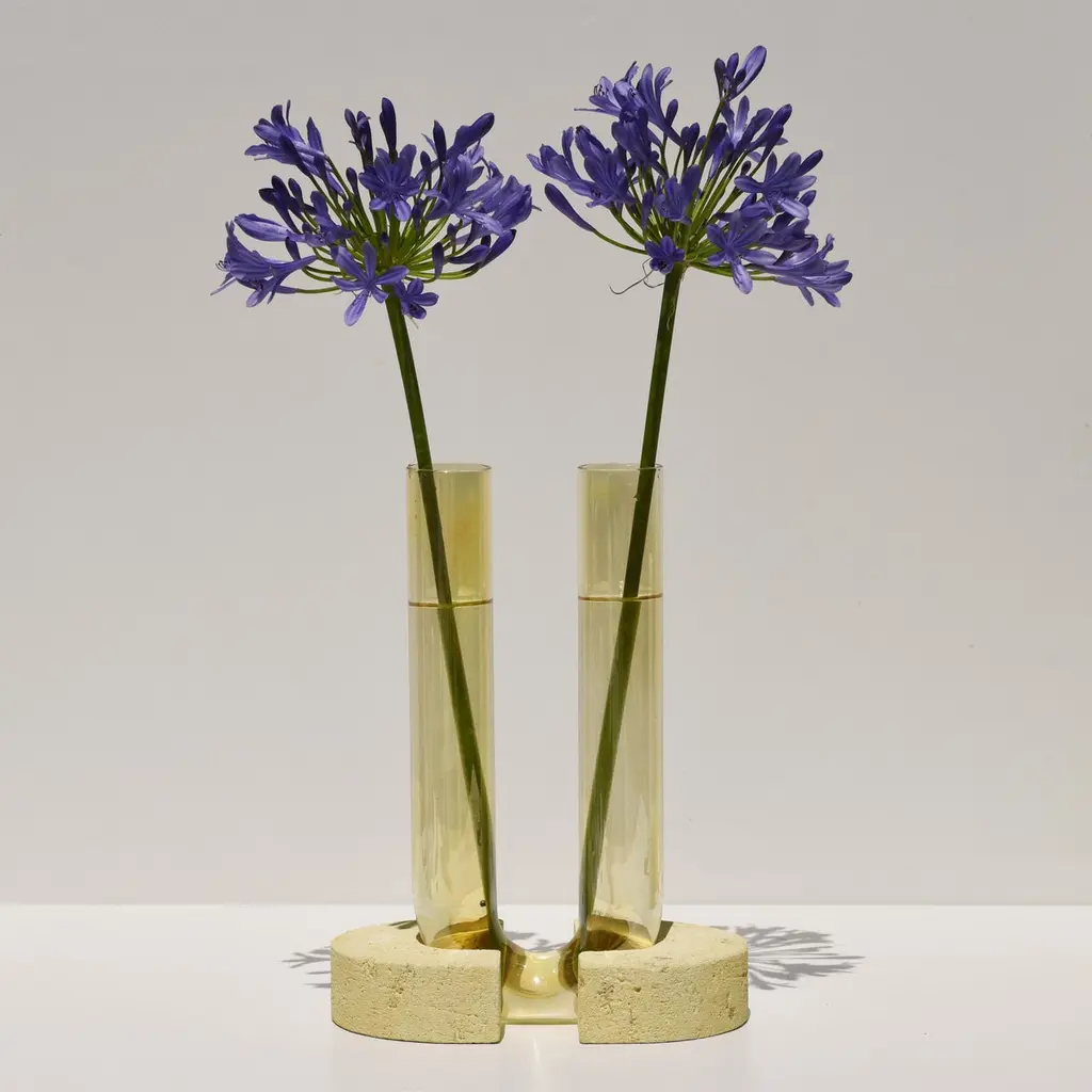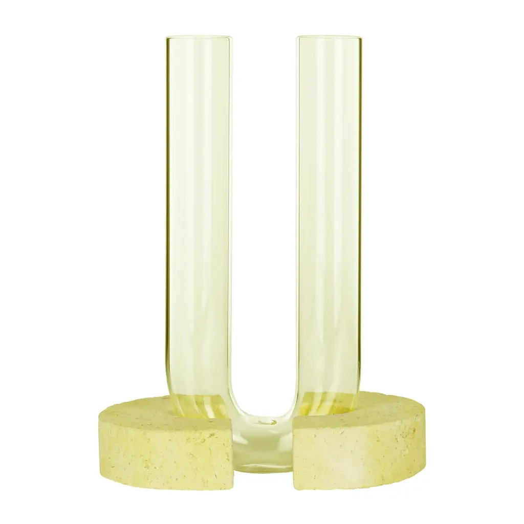 Yellow-Yellow Cochlea della Consapevolezza Soils Edition Vase by Coki BarbieriDimensions: W 24 x D 14 x H 30 cm.Materials: Handcrafted stone made with Matera stone fragments, sedimentary rocks of the Italian Apennines and pure water, yellow mineral pigments from Italian soils, yellow painted borosilicate glass.Cochlea del Risveglio - SOILS EDITION - Yellow-YellowCochleae vases collection is inspired by the life cycle of the snails and captures their growth when the invertebrate's body (represented by the curved glass) develops upwards from the embracing shell symbolized by semicircular shells handcrafted from fragments of historical stones only found in Matera (Città dei Sassi, UNESCO World Heritage, European Capital of Culture), recovered and reprocessed following a sustainable production cycle. The surface of the handcrafted stone piece is treated with an ecological substance developed by COKI. The glass and stone components are notglued and can be separated, disassembled, and ready for new uses.Soils edition is made with colored pigments of Italian soil.A precious objects collection made in Italy with natural and vegan origin materials, conceived by architectural and product designer Coki Barbieri and created by the local craftsmen to expand a new slow living awareness and surround oneself with a few objects, capable of staying alongside us over time.The climate emergency and increased future anxiety push our work to imagine alternative ways of living, producing, and consuming. For that Coki Barbieri uses notions of geology, chemistry, and design culture to create new products (and materials) from fragments and waste from natural products (such as stone and minerals).Coki Barbieri established her eponymous studio-workshop in Rimini in 2017, bringing to life a sustainable way of conceiving the product design for home. Nature inspires her environmentally conscious creations, which are imbued with emotional energy while maintaining their aesthetic impact and practical functionality. Coki collaborates with talented Italian craftsmen to produce one-of-a-kind homeware objects capable of unlocking new synergies between concepts, materials, and use.