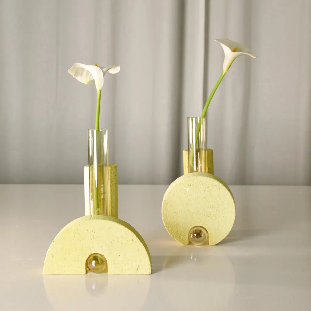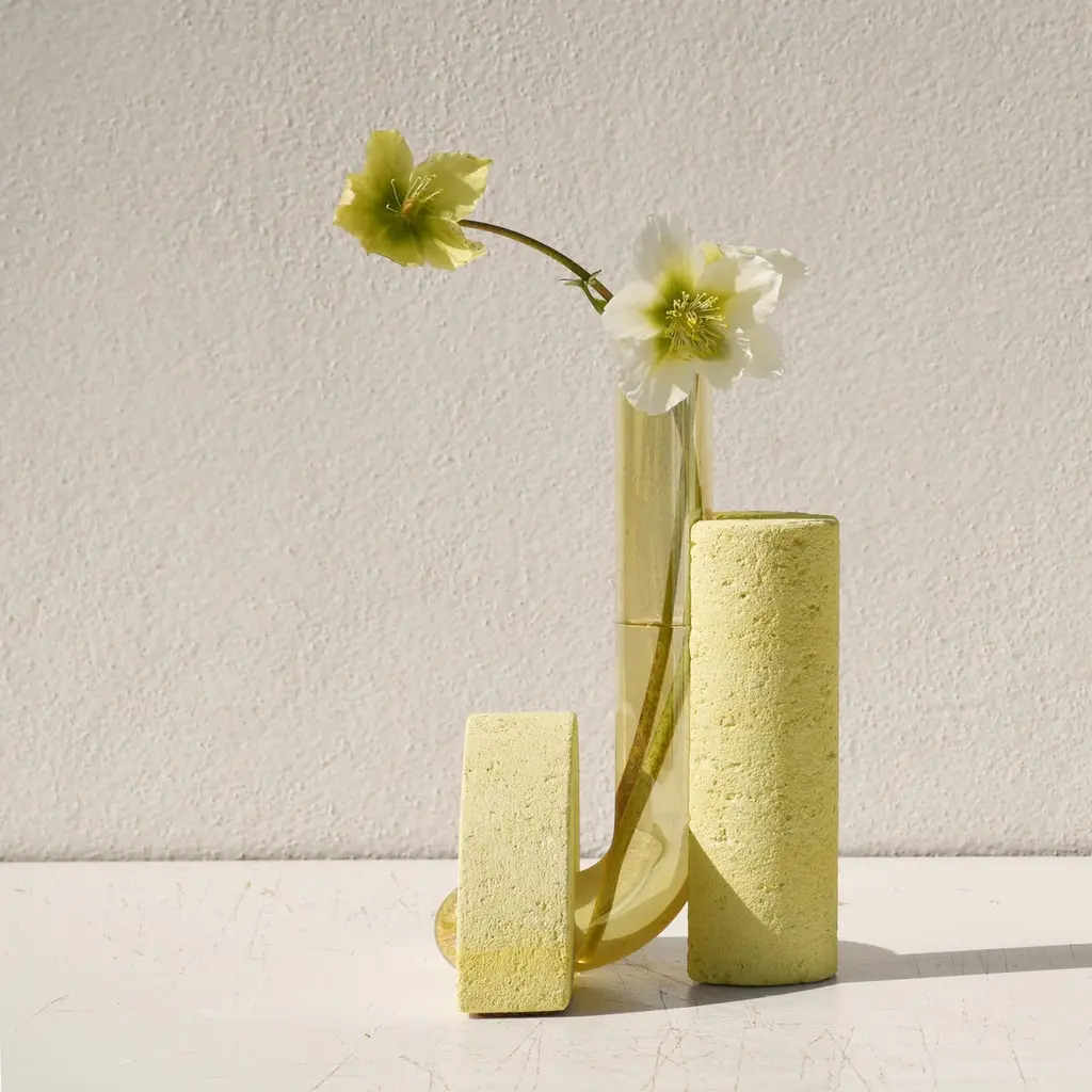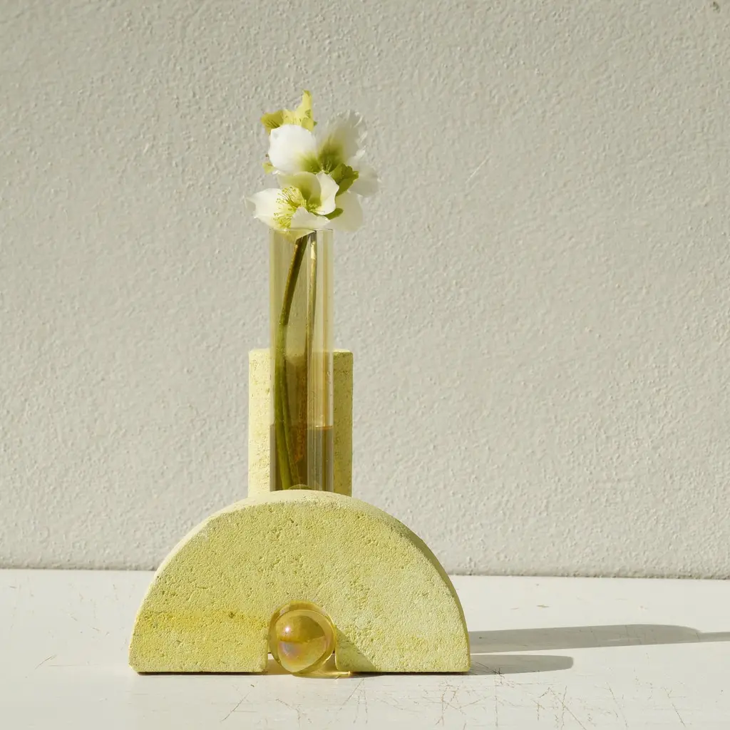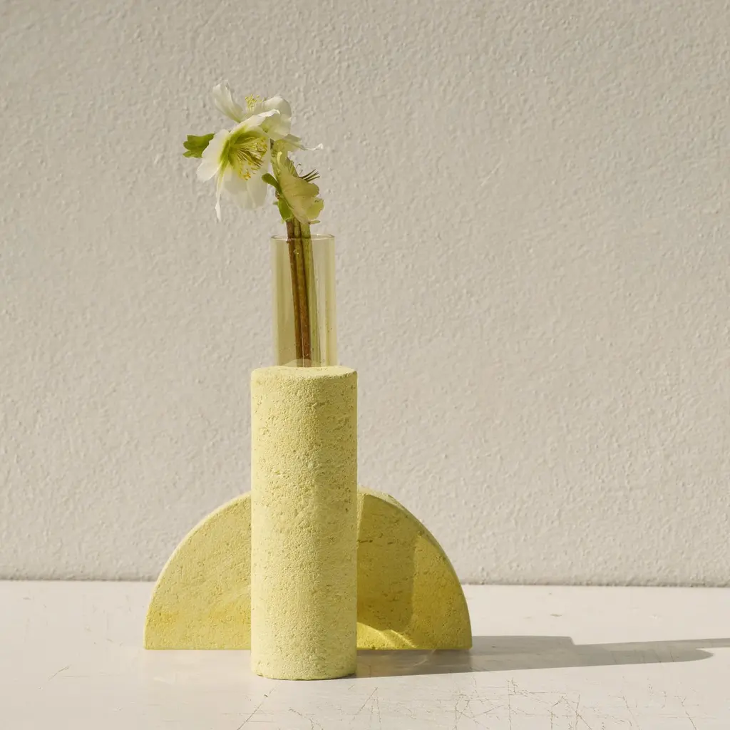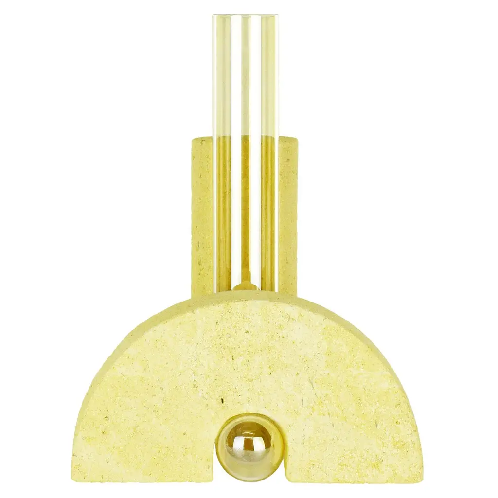 Yellow-Yellow Cochlea della Metamorfosi 1 Soils Edition Vase by Coki Barbieri.Dimensions: W 18,5 x D 15 x H 24 cm.Materials: Handcrafted stone made with Matera stone fragments, sedimentary rocks of the Italian Apennines and pure water, yellow mineral pigments from Italian soils, yellow painted borosilicate glass.Cochleae vases collection is inspired by the life cycle of the snails and captures their growth when the invertebrate's body (represented by the curved glass) develops upwards from the embracing shell symbolized by semicircular shells handcrafted from fragments of historical stones only found in Matera (Città dei Sassi, UNESCO World Heritage, European Capital of Culture), recovered and reprocessed following a sustainable production cycle. The surface of the handcrafted stone piece is treated with an ecological substance developed by COKI. The glass and stone components are not glued and can be separated, disassembled, and ready for new uses.Soils edition is made with colored pigments of Italian soil.A precious objects collection made in Italy with natural and vegan origin materials, conceived by architectural and product designer Coki Barbieri and created by the local craftsmen to expand a new slow living awareness and surround oneself with a few objects, capable of staying alongside us over time.The climate emergency and increased future anxiety push our work to imagine alternative ways of living, producing, and consuming. For that Coki Barbieri uses notions of geology, chemistry, and design culture to create new products (and materials) from fragments and waste from natural products (such as stone and minerals).Coki Barbieri established her eponymous studio-workshop in Rimini in 2017, bringing to life a sustainable way of conceiving the product design for home. Nature inspires her environmentally conscious creations, which are imbued with emotional energy while maintaining their aesthetic impact and practical functionality. Coki collaborates with talented Italian craftsmen to produce one-of-a-kind homeware objects capable of unlocking new synergies between concepts, materials, and use.