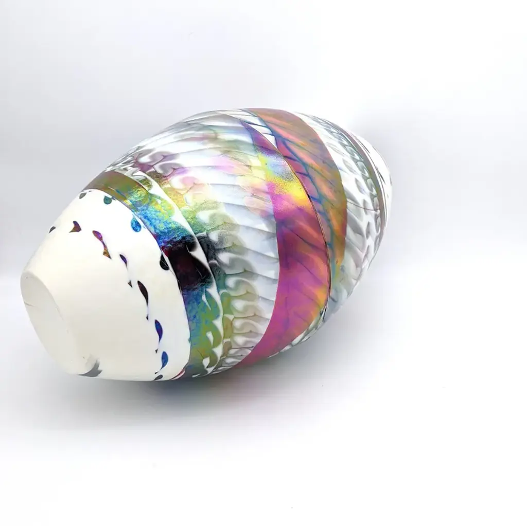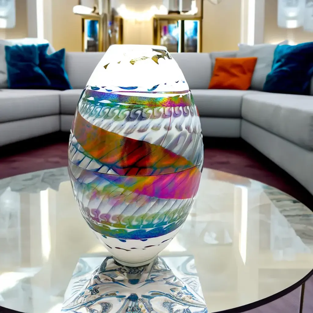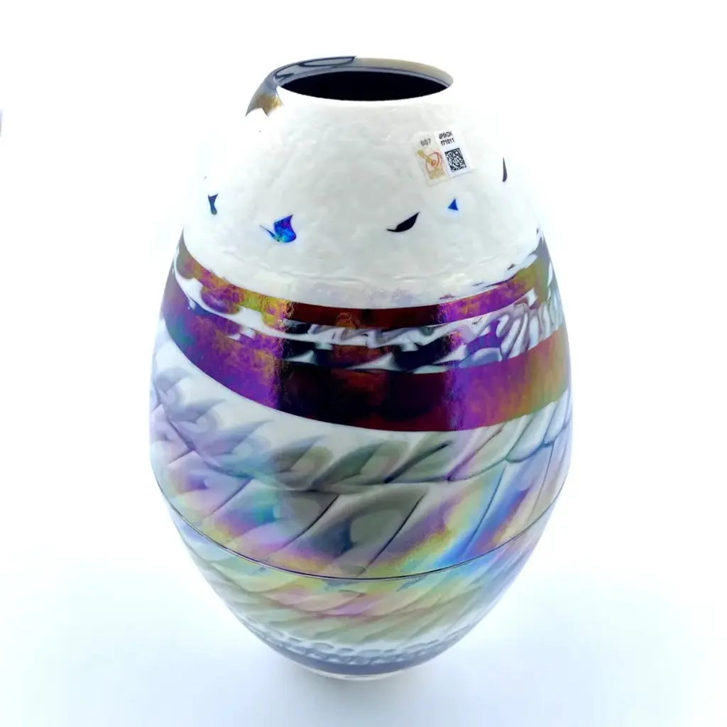 ZAIRE is an oval artistic multicolor Murano glass vase with iridescent pattern. It is a refined piece of furniture to decorate your own house with taste.Here you can find unique handmade glass vases in original Murano glass. They are the product of a long tradition of Venetian glass craftsmanship that has been going on for centuries. They are authentic works of art that perfectly combine the tradition of Murano glass processing and the innovation of contemporary Italian design. All YourMurano products are artisanal and of the highest production quality. Non-substantial variations in shape, size, color, and/or minor imperfections are inevitable and are typical of manual glasswork, highlighting the artisanal craftsmanship.