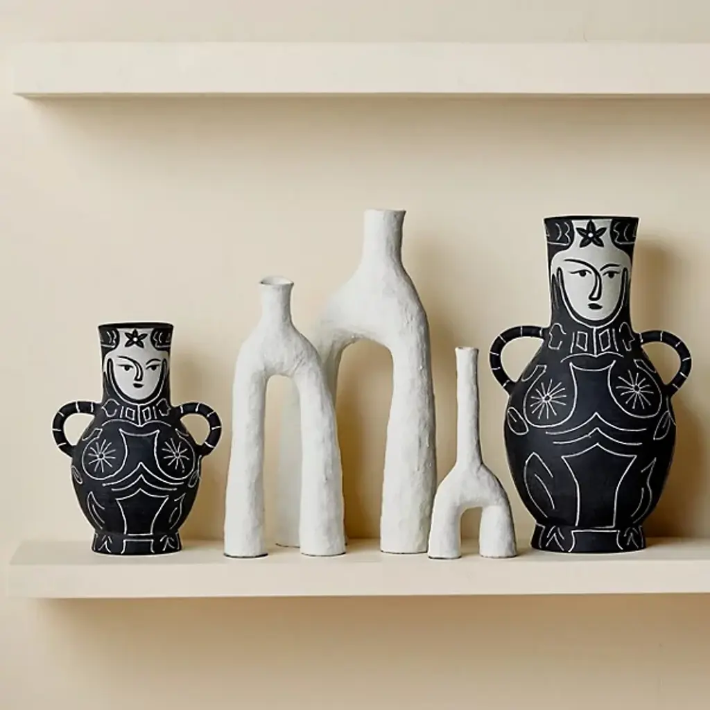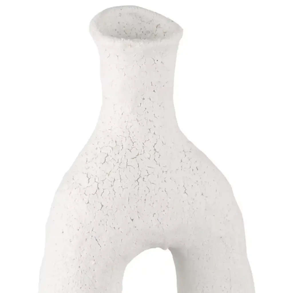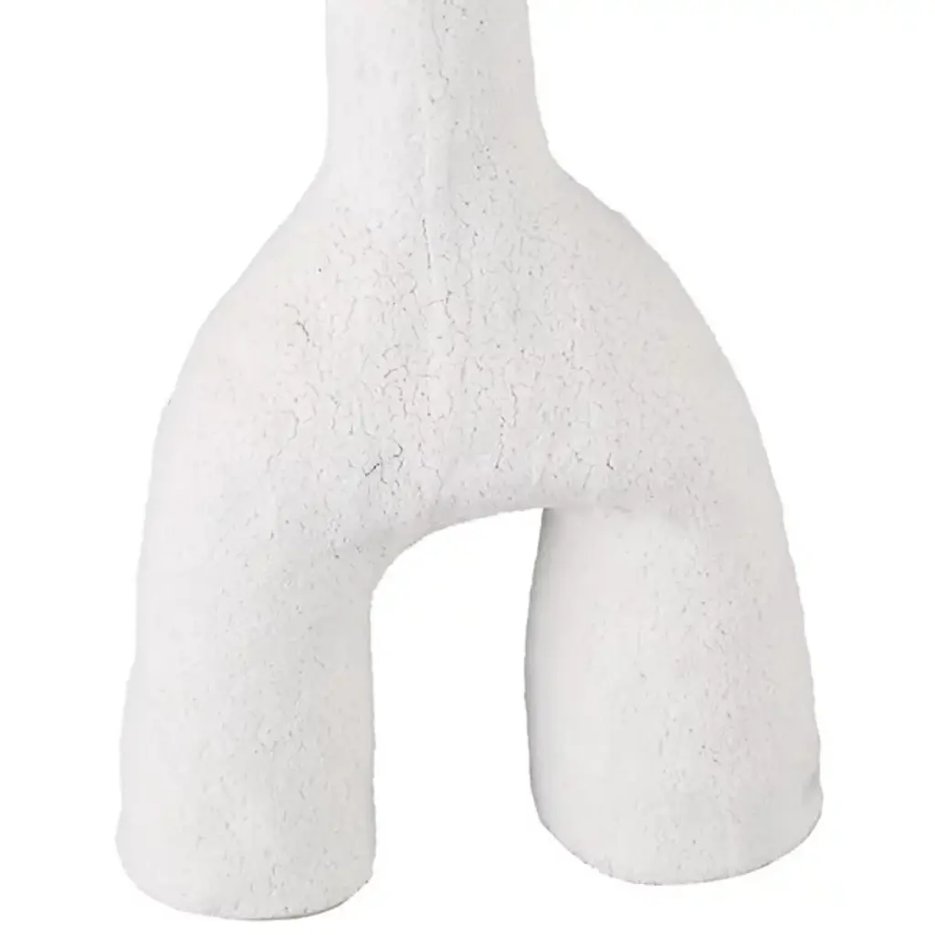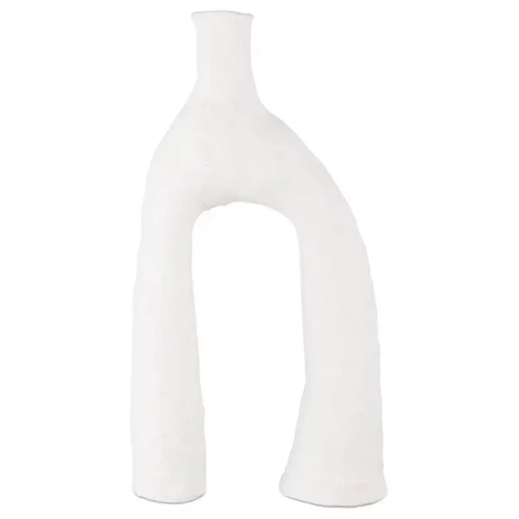 The Zante Vase Set from Currey & Company brings elements of Brutalist charm to your indoor decor. A set of three ceramic vases, each features a striking matte white glaze that appears smooth from a distance but reveals a beautifully textured surface up close. The unique and playful sculptural shapes add an artistic flair curve up and over from small bases, each one a gallery-worthy accent great for creating a modern, sophisticated vignette when displayed together.