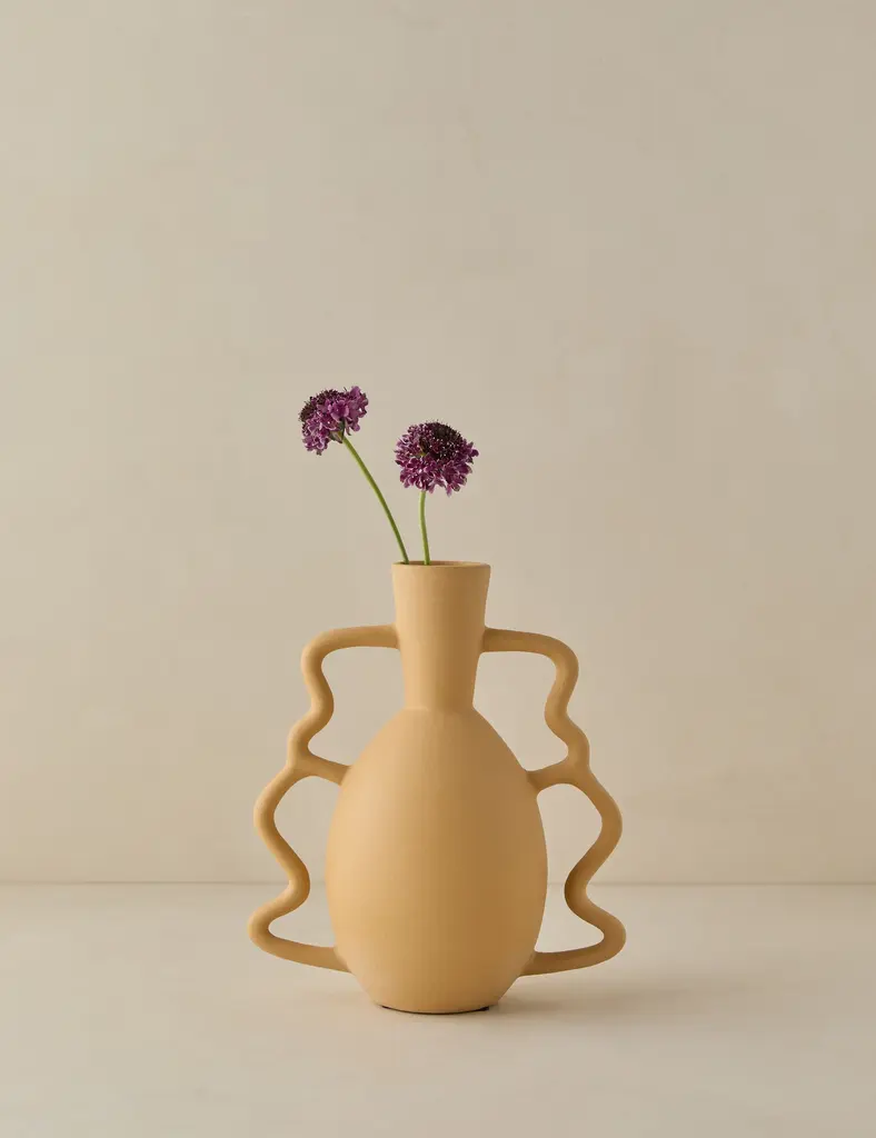 Strike a modern look on a tabletop or counter with our Zayden vase. Its classic vessel shape is fitted with oversized coil handles, fashioning the timeless silhouette with an artful edge. We love the bright warmth of the wheat finish.