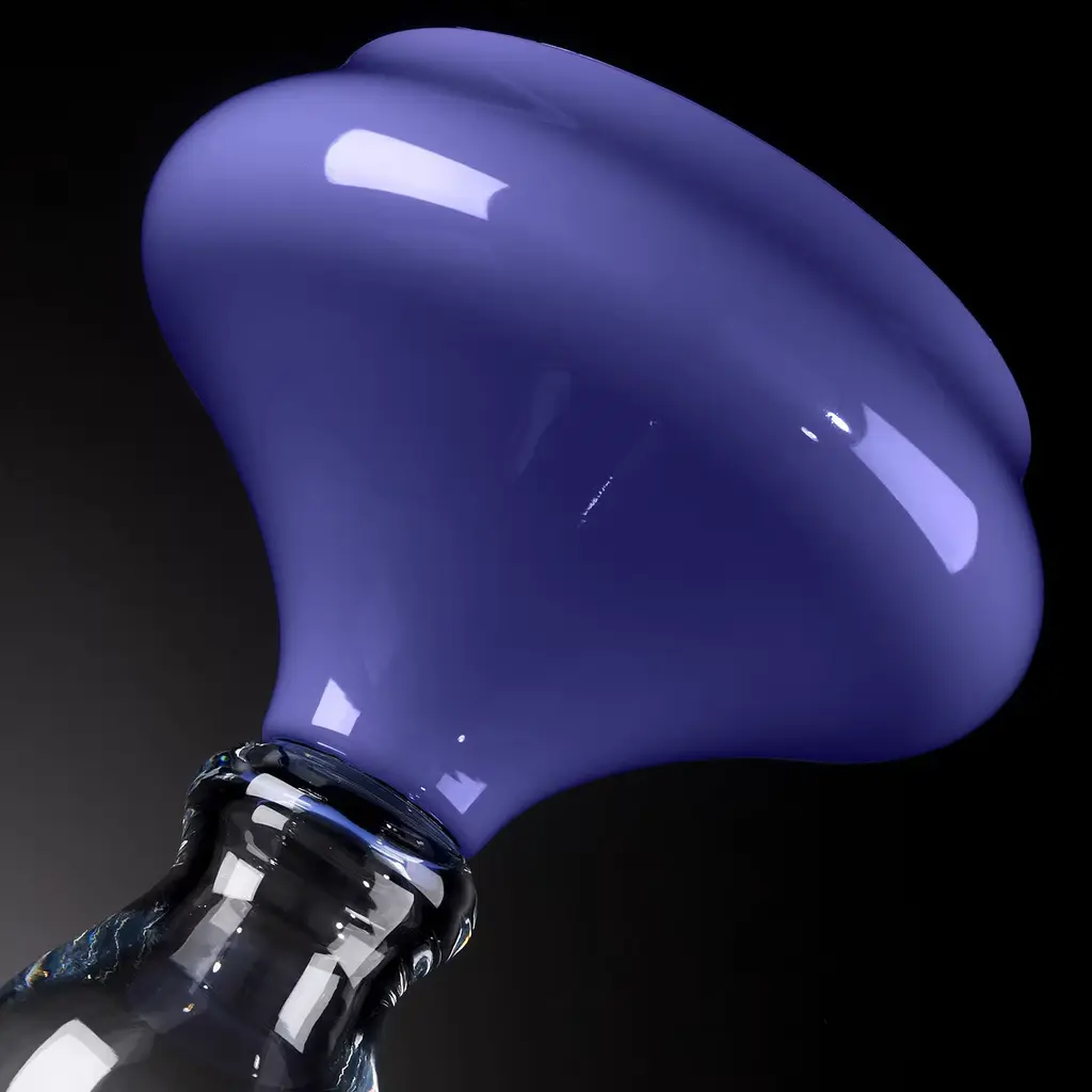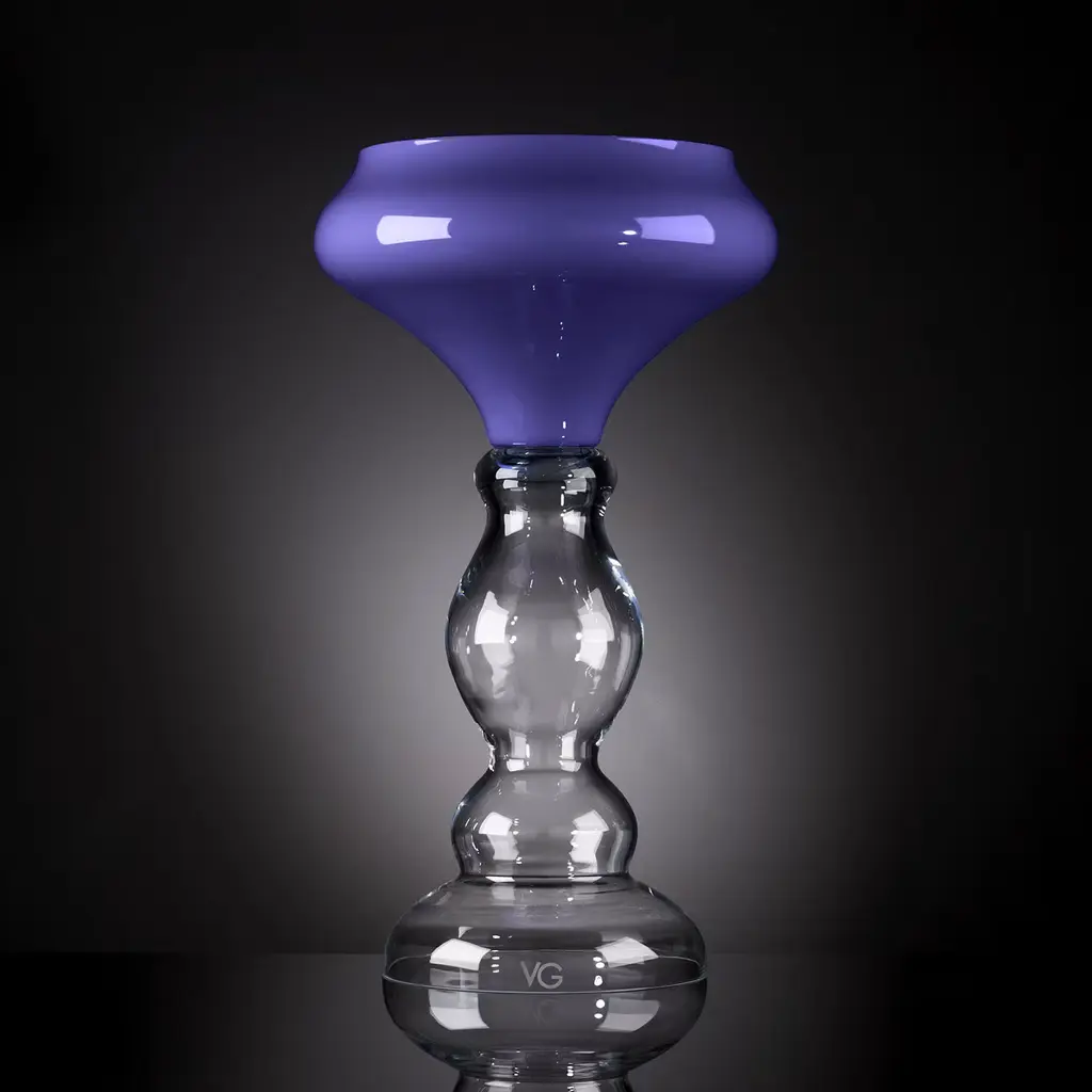 This vase is a modern piece of functional decor that will make a statement on its own or matched with another Zeus piece in a minimalist or contemporary decor. Crafted by expert hands using traditional glassmaking techniques, it contrasts a clear glass hue on the refined stem with a vivacious dark lilac hue marking the cup.