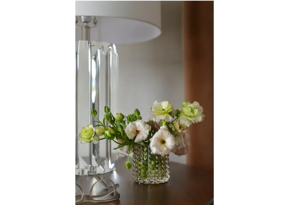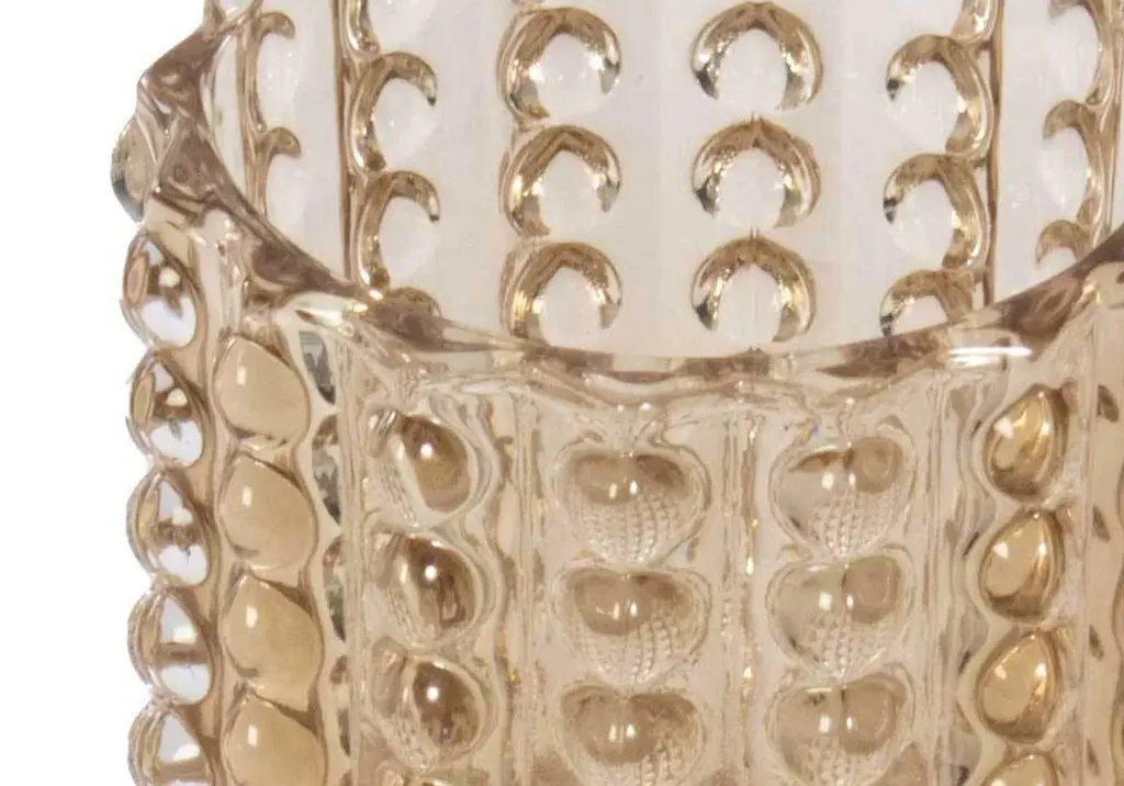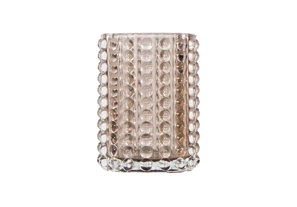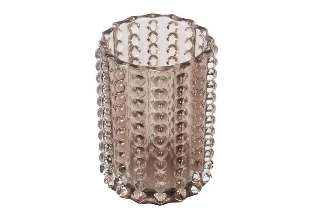 The Zoe is incredibly textured with its repeating bubble design. Its chic, entirely glass form is complemented by a warm, soft color, creating visual dimension and a sophisticated quality. Available in a petite amber or a taller smoke, display alone or pair together for a collected look.