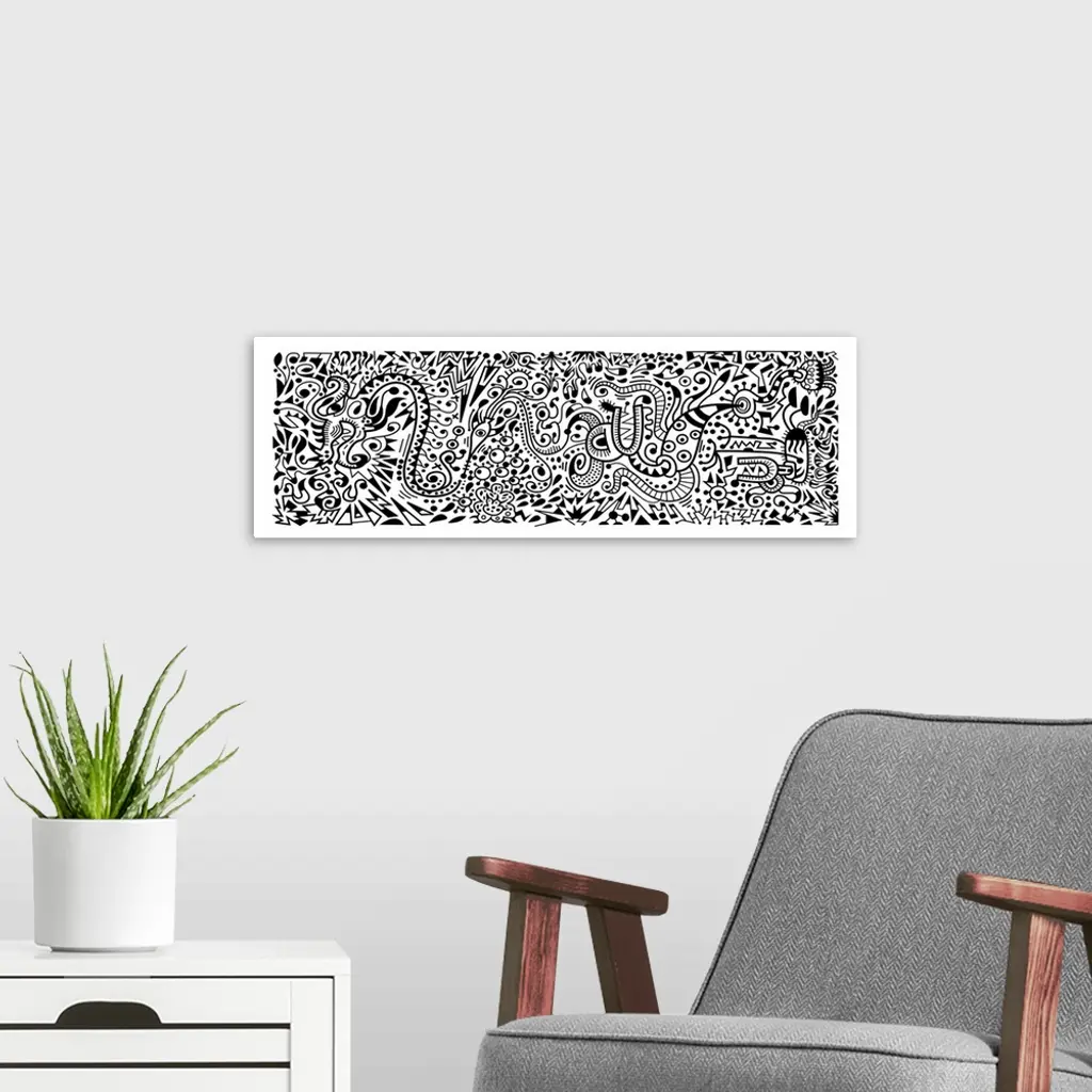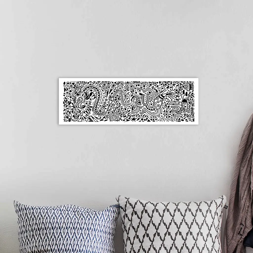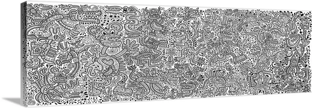 Contemporary mural artwork of monsters and other abstract figures in a confusion of monochromatic patterns.