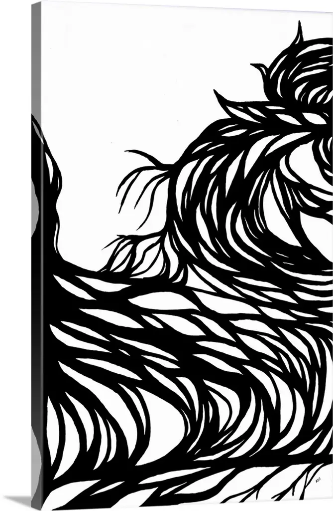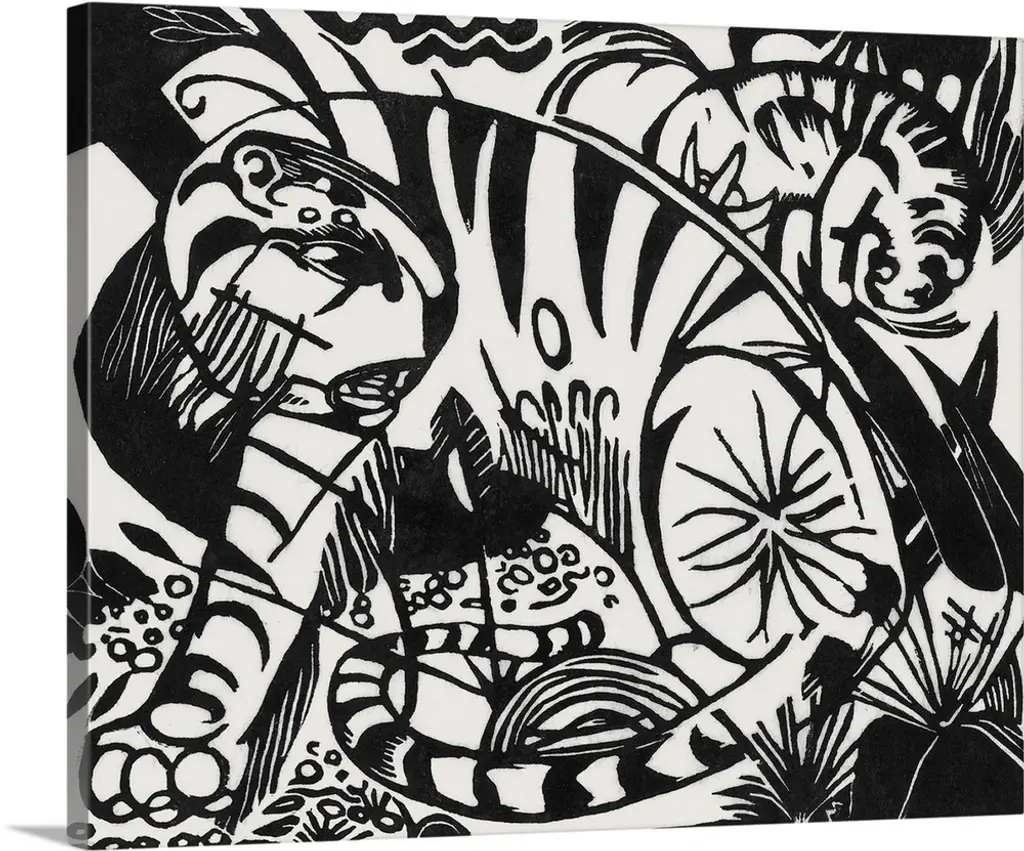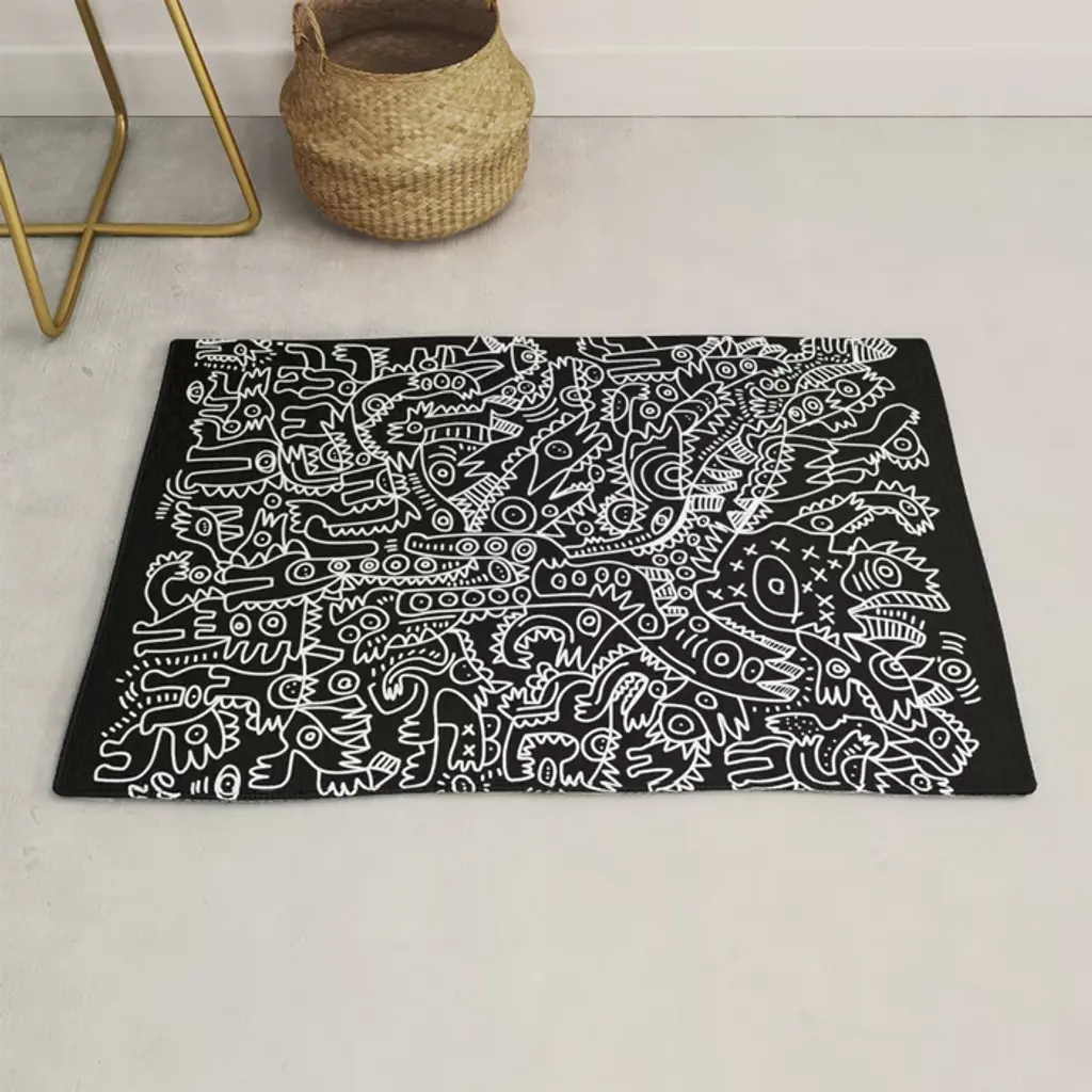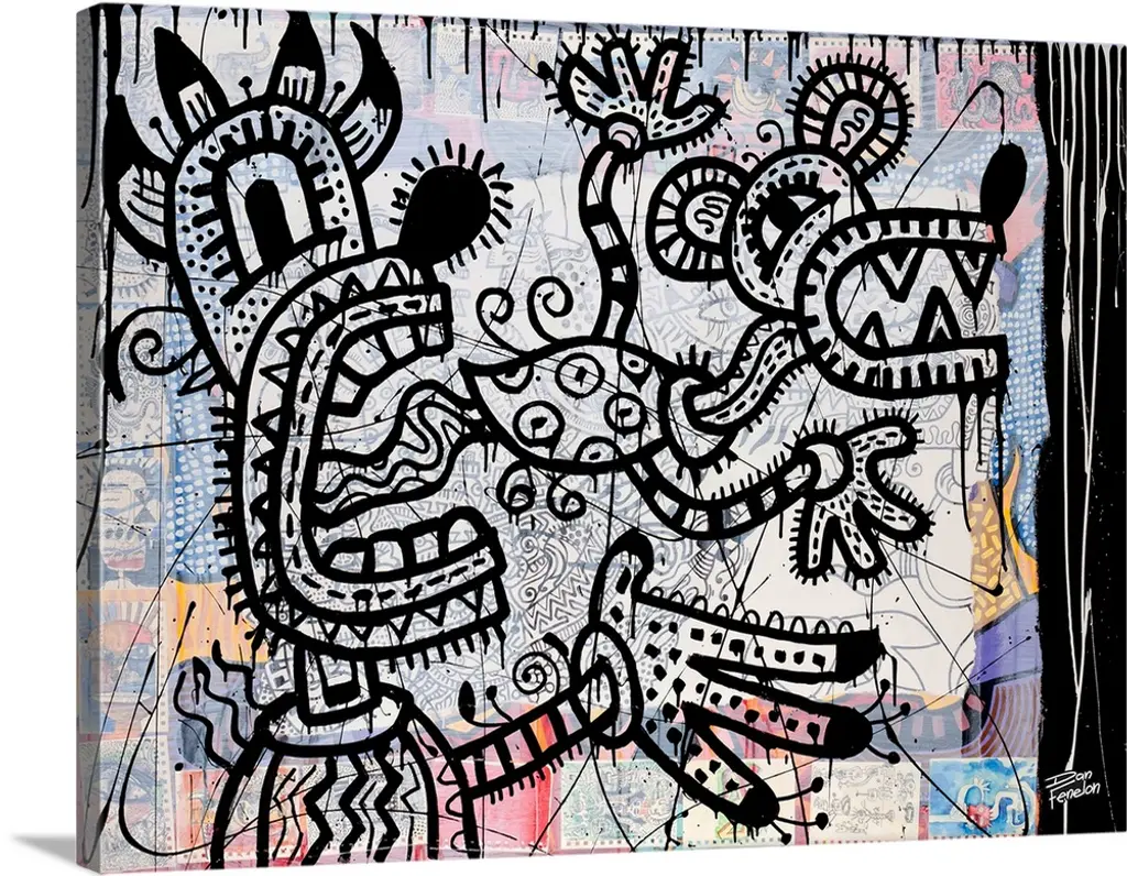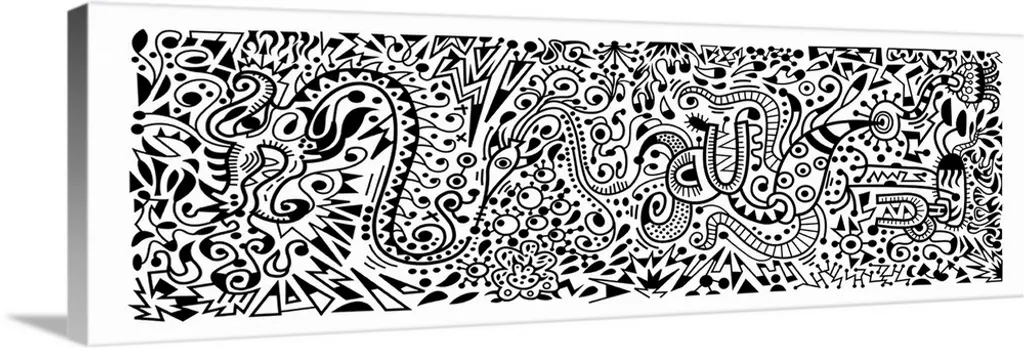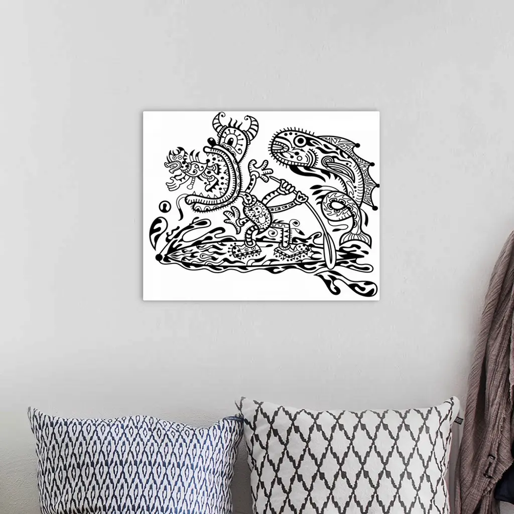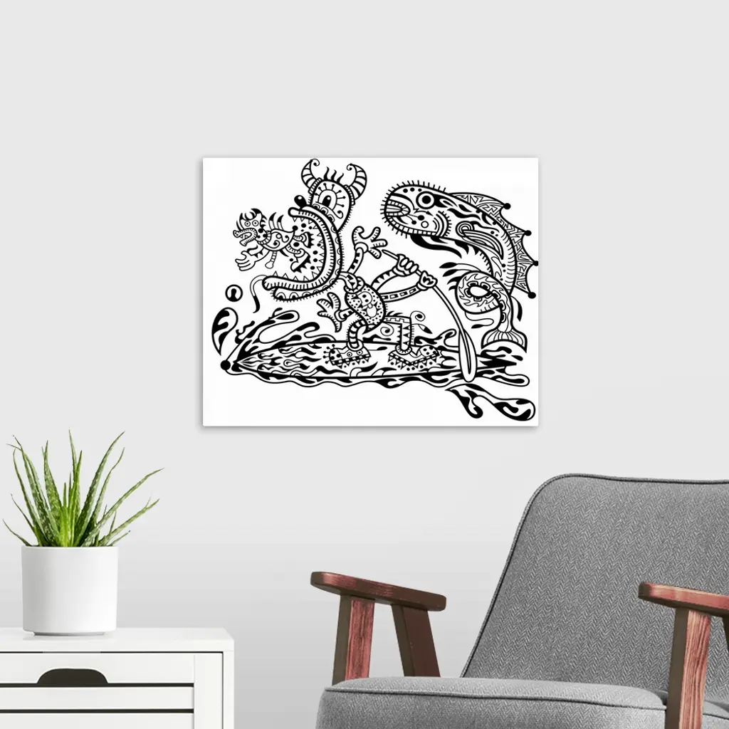 Contemporary artwork of an intricately designed monster with horns paddle boarding, with a giant fish leaping out of the water behind him.
