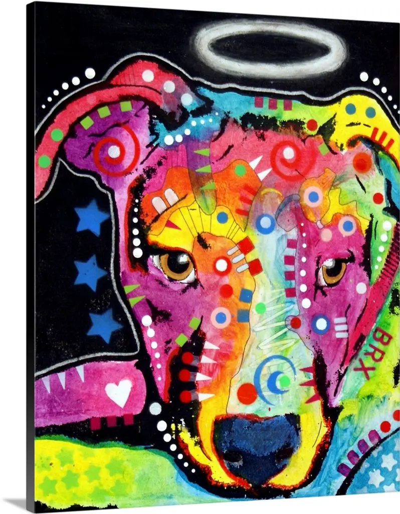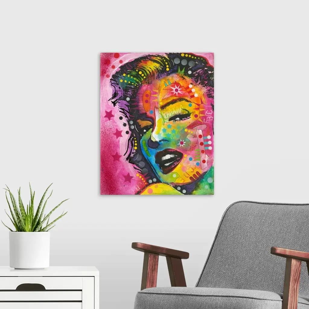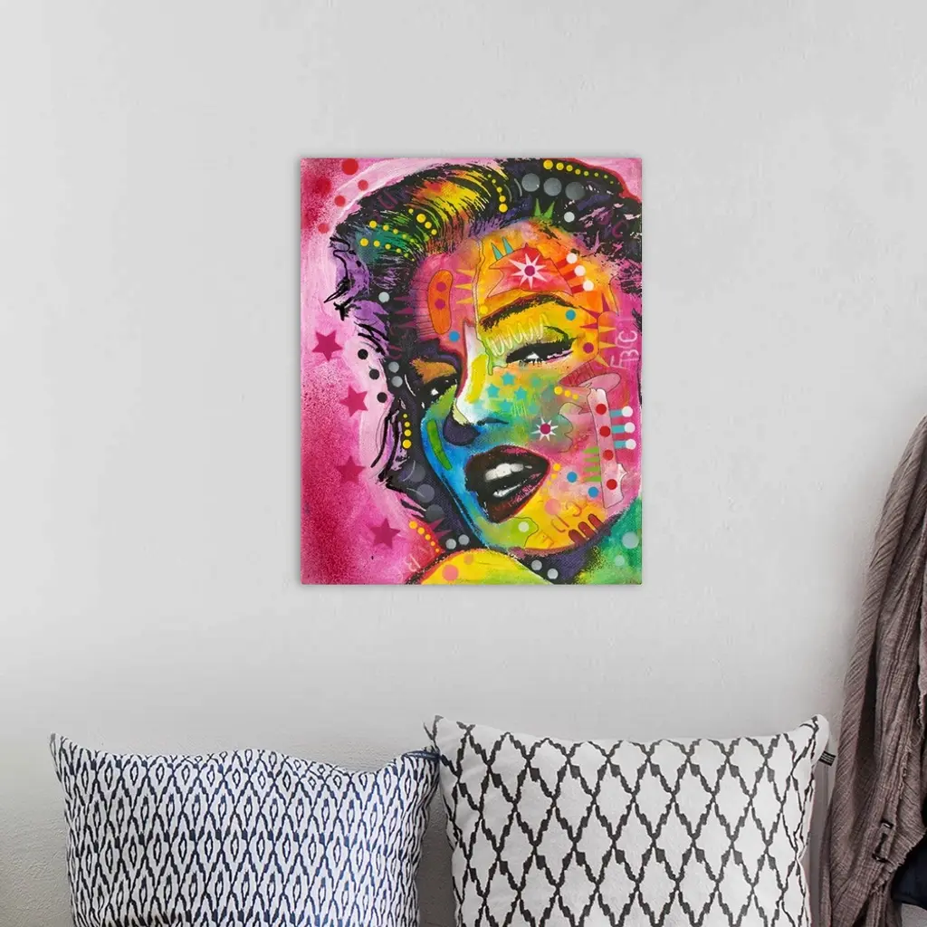 Pop art style painting of Marilyn Monroe with geometric abstract markings on a pink background with stars and circles.