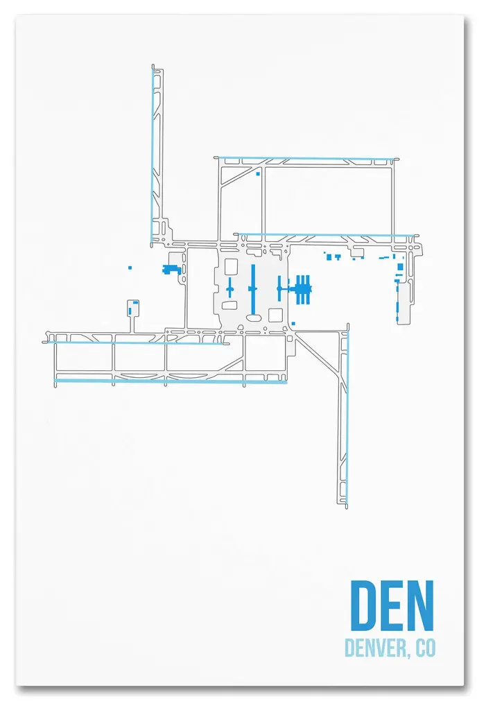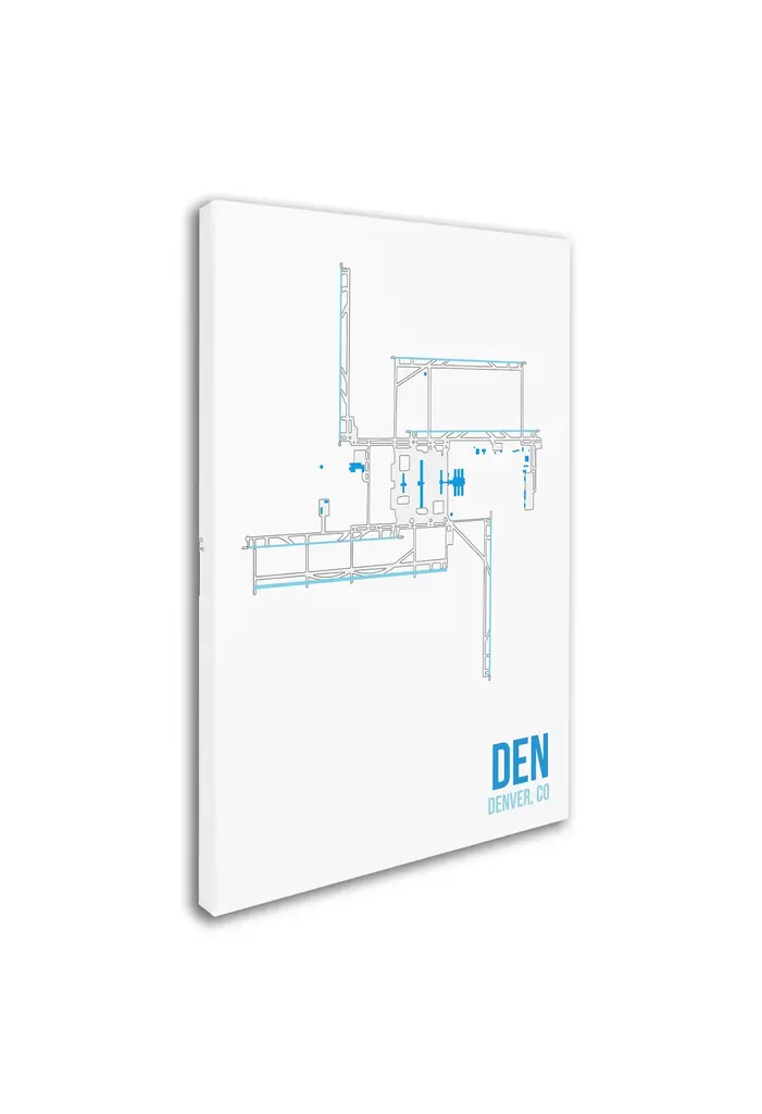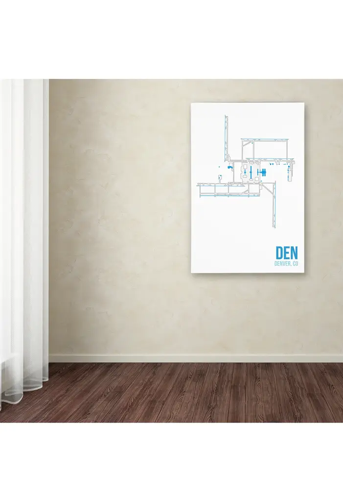 Artist: 08 LeftSubject: TransportationStyle: Modern & ContemporaryProduct Type: Gallery-Wrapped Canvas ArtMade in USAThis ready to hang, gallery-wrapped art piece features a minimalist poster of the Denver airport layout.We are 08 Left. We love art and flight and travel and new places. We create art for people who love those things as well. We do it so we can reflect, be grateful and be inspired. We realize who we are, where we've been, and what we dream.Giclee (jee-clay) is an advanced printmaking process for creating high quality fine art reproductions. The attainable excellence that Giclee printmaking affords makes the reproduction virtually indistinguishable from the original piece. The result is wide acceptance of Giclee by galleries, museums, and private collectors. Gallery wrap is a method of stretching an artist's canvas so that the canvas wraps around the sides and is secured a hidden, wooden frame. This method of stretching and preparing a canvas allows for a frameless presentation of the finished painting.Whether it's a contemporary, rustic, modern, or traditional style decor, Trademark Fine Art offers a variety of high-quality, carefully built wall art that will surely complement any style. We provide an abundance of art themes that range from fascinating abstracts to breathtaking landscapes, in an assortment of sizes that will certainly bring excitement to any area of your home. From the bedroom to the living room, or even the office, Trademark Fine Art makes professionally handcrafted, ready to hang wall decor that will be admired for years to come!IMPORTANT: Avoid buying counterfeit products and transacting with unauthorized sellers. Trademark Fine Art is committed to providing the consumer with the absolute best price and value on our entire line of products, which we ensure by applying a rigorous Quality Control process. Trademark Fine Art is a registered trademark protected by U.S. Trademark law and will be vigorously defended.