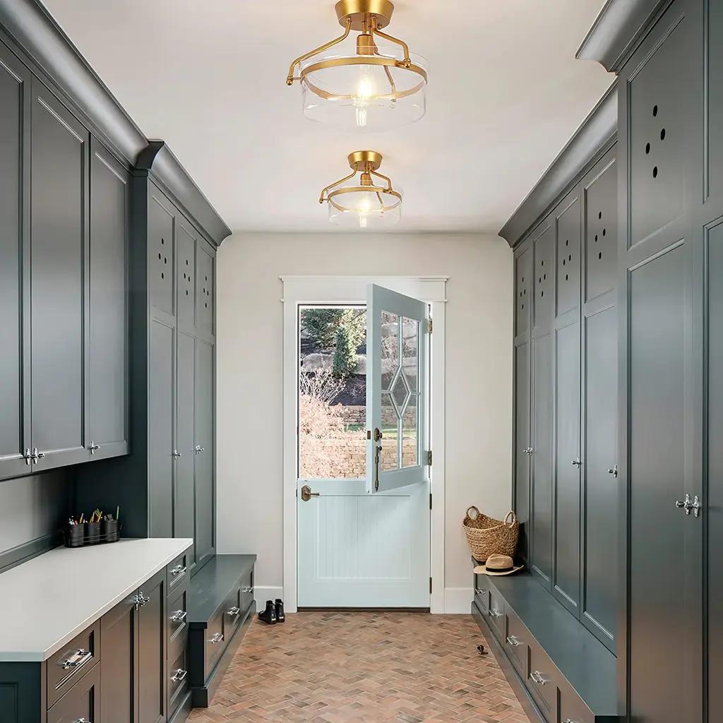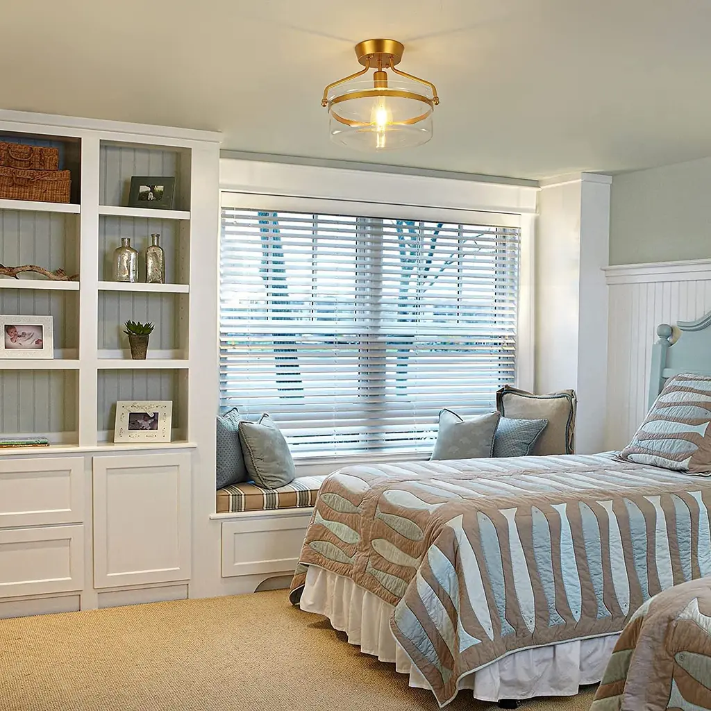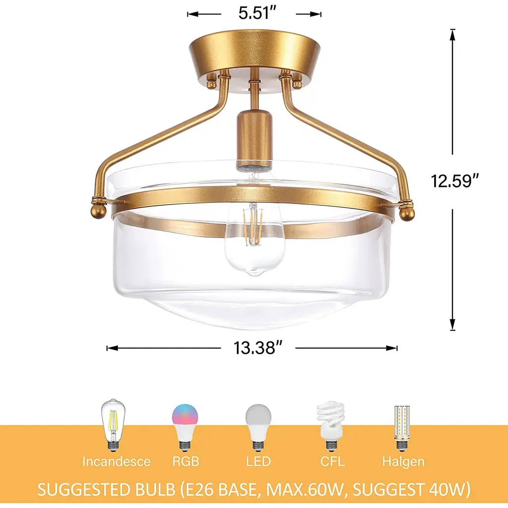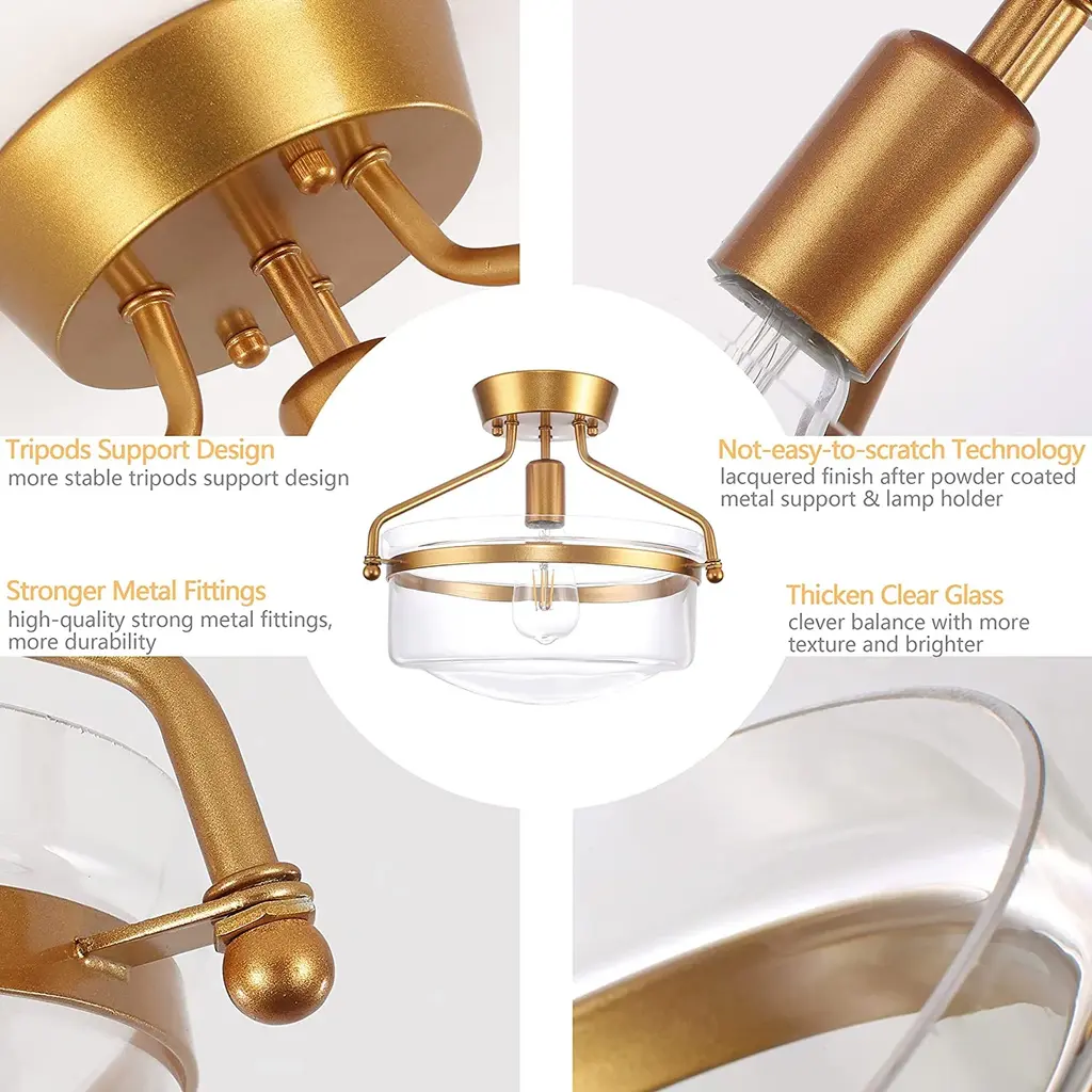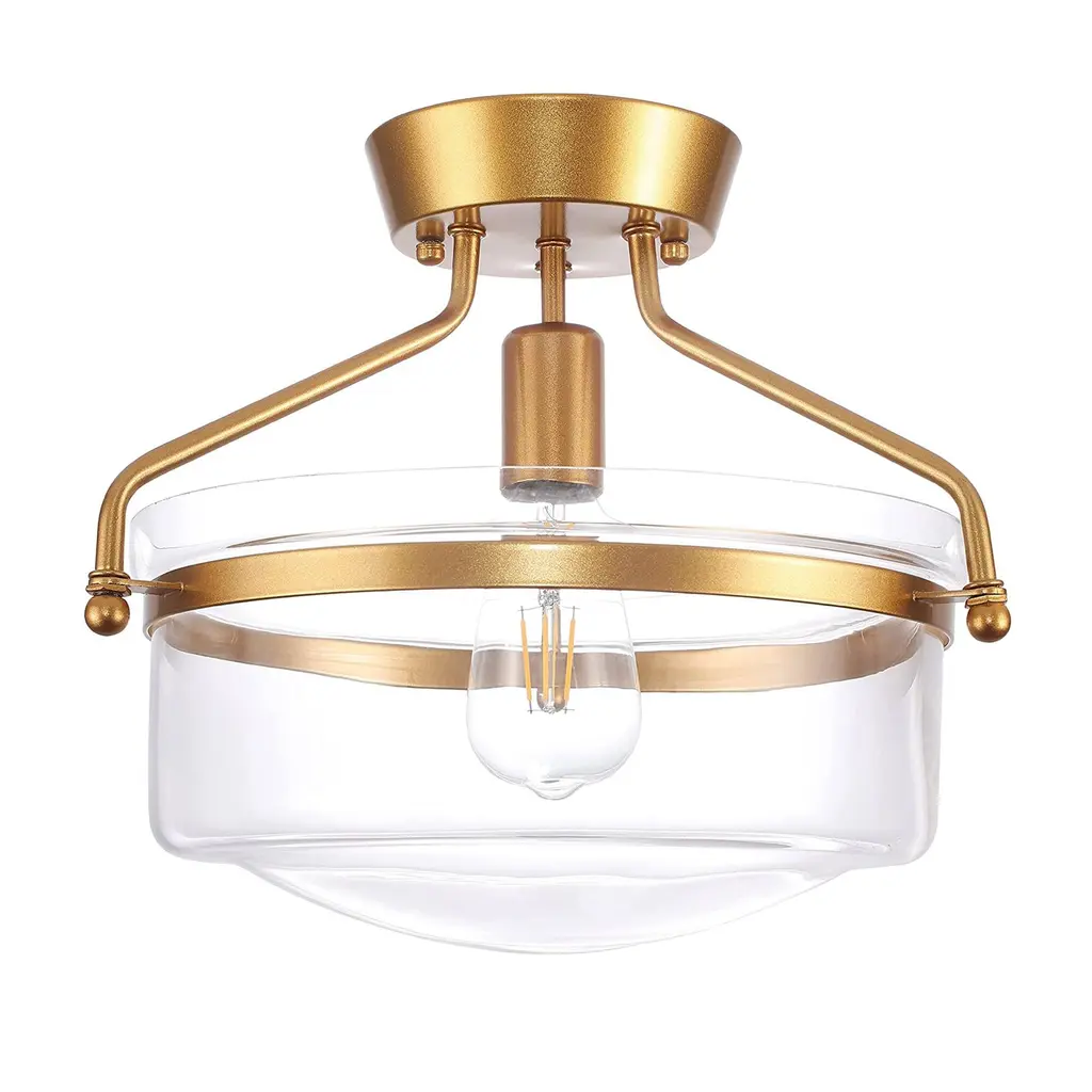 1-Light Dimmable Semi-Flush Mount With Clear Glass Shade For Bedroom Foyer - Gold