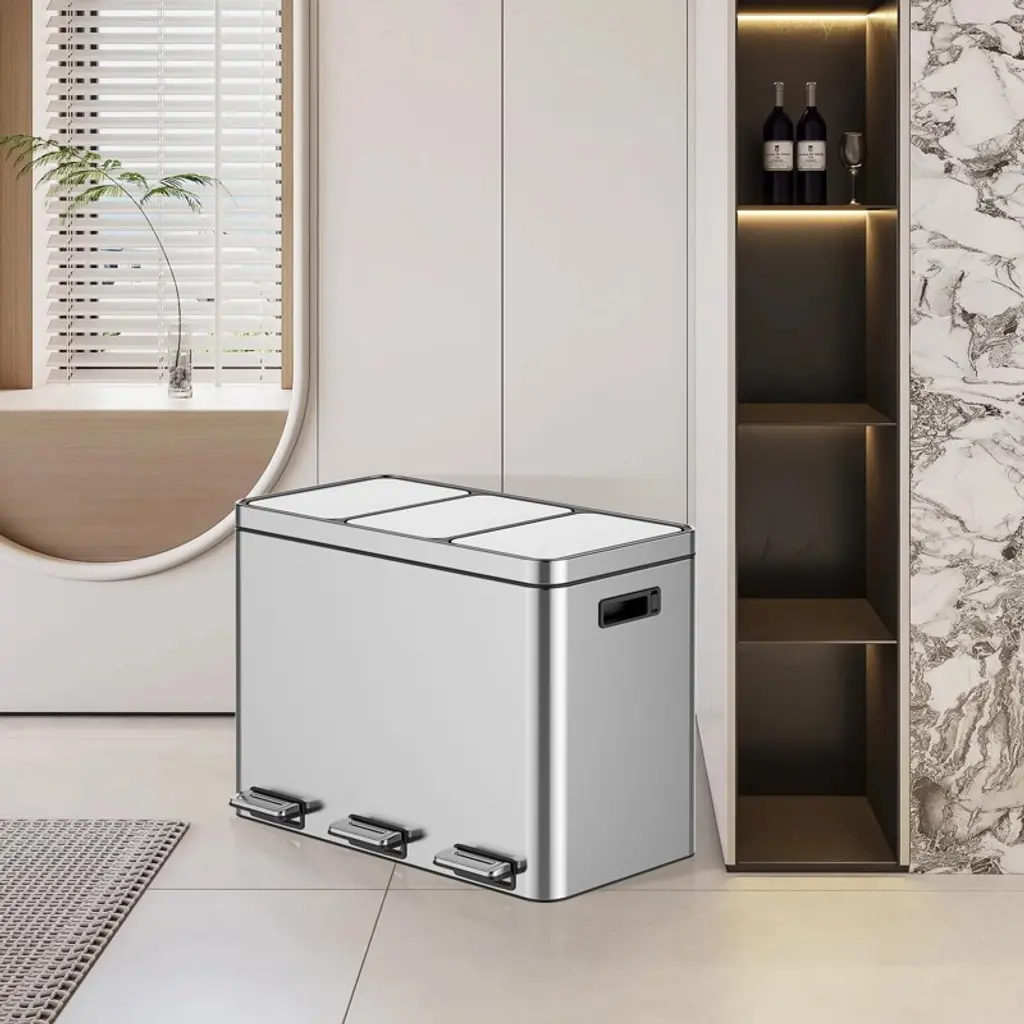 Efficient Recycling Solution: Featuring two compartments, this trash can allows you to easily sort garbage and recycling in one compact unit. This promotes environmentally friendly habits by making waste separation effortless and organized.Step-on Operation: Featuring a sturdy stepped pedal that opens without the need for two hands, this bin is both hygienic and convenient when disposing of waste, making it ideal for busy homes, office environments or recycling centres where efficient and hygienic waste management is vital.Soft-Close Lid: The lid closes smoothly and quietly, preventing loud noises and ensuring a peaceful environment in your home or workplace, Its space-saving rectangular design fits neatly into corners or against walls, making it ideal for kitchens, offices, or recycling stations with limited space.Removable Inner Buckets: Equipped with two removable inner buckets with sturdy handles that allow effortless sorting of recyclables and rubbish, this design simplifies the process of sorting and disposing of rubbish, increasing convenience while keeping hands clean during disposal.Stainless Steel Construction: Crafted from high quality stainless steel, the bin is resistant to fingerprints and smudges and requires minimal effort to maintain a clean and shiny appearance that complements any modern space while preventing unsightly marks.
