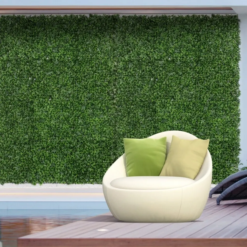 This greenery wall set includes 12 boxwood panels you can use as a privacy screen or backdrop. Place them outside on your patio, against the balcony, or along a fence. You don't need a green thumb to have an impressive green backdrop. Our grass wall gives you the look without the pruning, watering, or waiting. Giving you the privacy coverage and appeal of real greenery.
