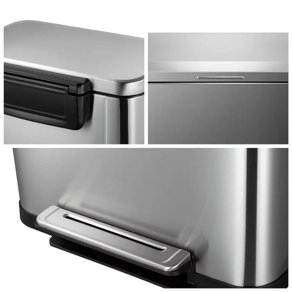 Silent Soft-Close Lid & Durable Stainless Steel: The trash can features a noiseless closing mechanism with an internal hinge design, preventing loud slams and wall damage. Made of premium stainless steel, it resists fingerprints, smudges, and corrosion, keeping your kitchen sleek with minimal cleaning. Hands-Free Foot Pedal & 90° Stay-Open Lid: Operate effortlessly with the sturdy steel pedal—ideal for messy tasks. The lid stays open at 90° for easy trash disposal while cooking or peeling veggies. (Note: Close manually if pedal is pressed below 90°.) Removable Inner Bucket & Leakproof Base: Includes a detachable inner bucket for quick bag replacement and a sealed base to contain spills. The rectangular design fits snugly in tight spaces like bathrooms, offices, or corners. Space-Saving & Multi-Scene Use: With a slim 13-gallon (50L) capacity, this trash can optimizes space in kitchens, bathrooms, or offices. Its modern steel finish blends seamlessly with home décor. Easy to Clean & Hygienic: The smooth stainless surface wipes clean in seconds, and the smudge-resistant coating blocks grime buildup. No more sticky fingerprints or lingering odors!