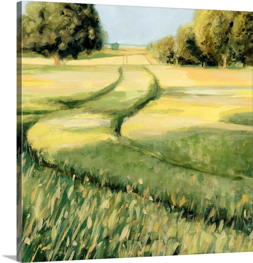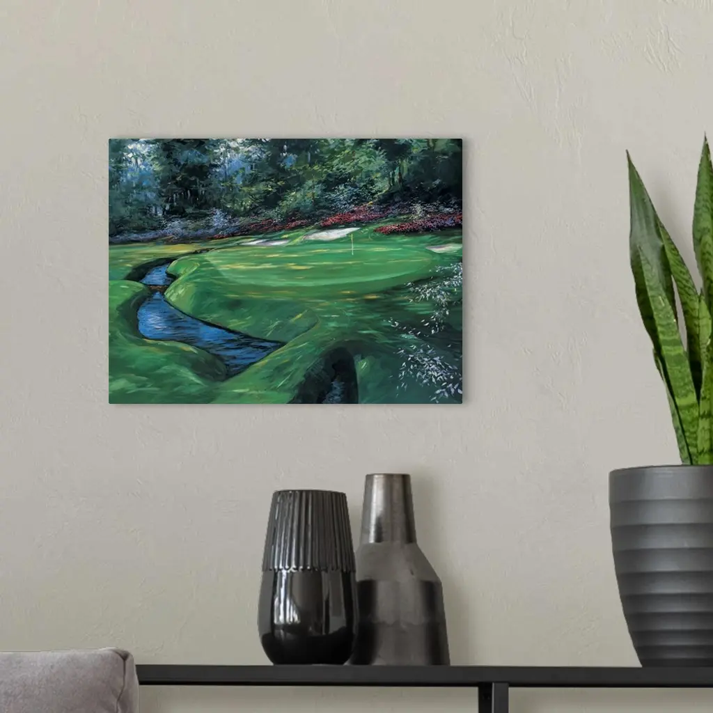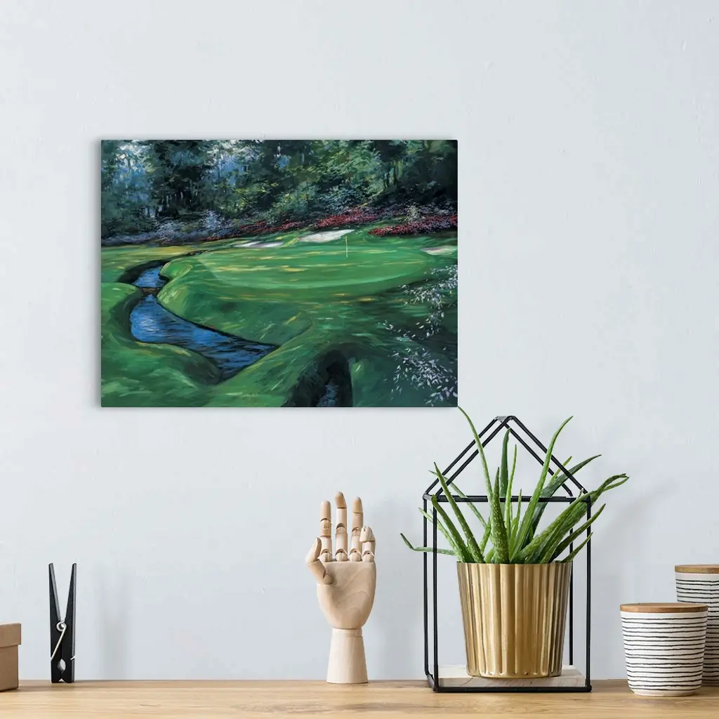 A traditional style painting of the thirteenth green of Augusta National Golf Club in Georgia, home of the Masters Golf Tournament. The light suggests it is late afternoon, with dappled sunlight falling across the grass, and a bank of spring flowers in the background.