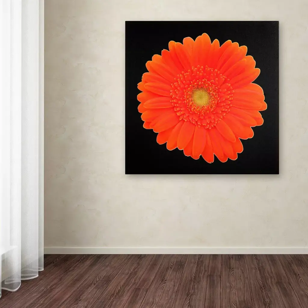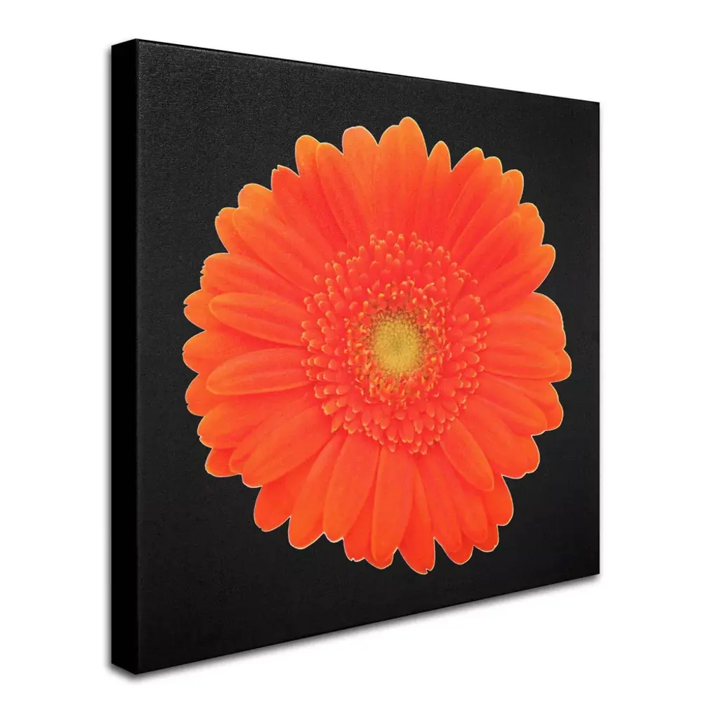 This ready to hang, gallery-wrapped art piece features an orange Gerber daisy. Giclee (jee-clay) is an advanced printmaking process for creating high quality fine art reproductions. The attainable excellence that Giclee printmaking affords makes the reproduction virtually indistinguishable from the original piece. The result is wide acceptance of Giclee by galleries, museums, and private collectors. Gallery wrap is a method of stretching an artist's canvas so that the canvas wraps around the sides and is secured a hidden, wooden frame. This method of stretching and preparing a canvas allows for a frameless presentation of the finished painting.