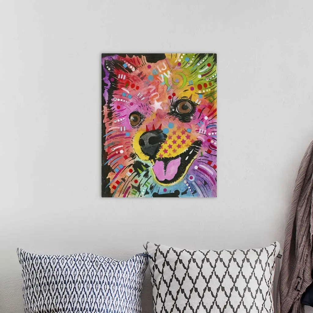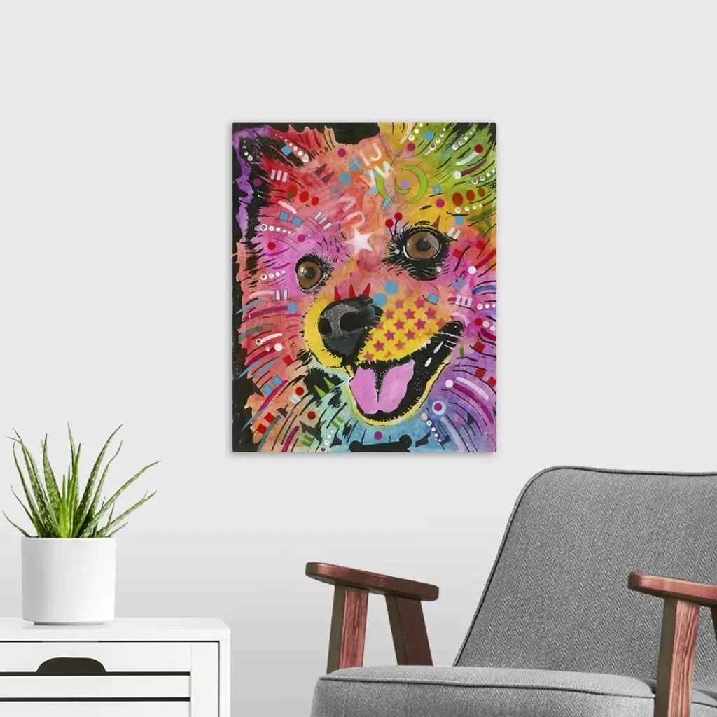 Contemporary painting of a colorful Spitz with geometric abstract designs all over.