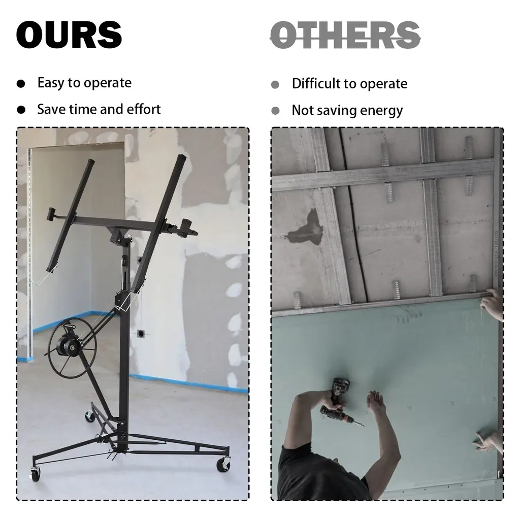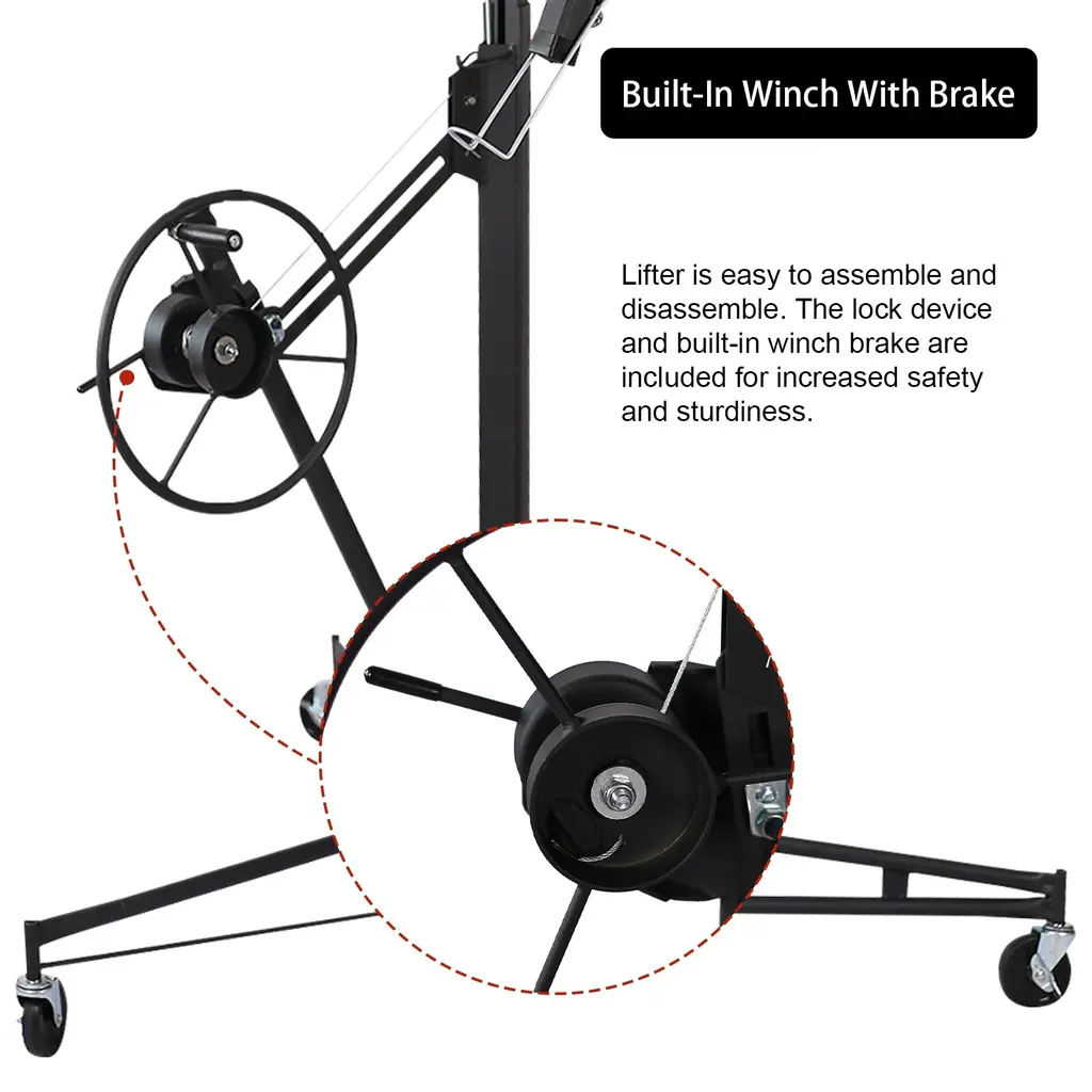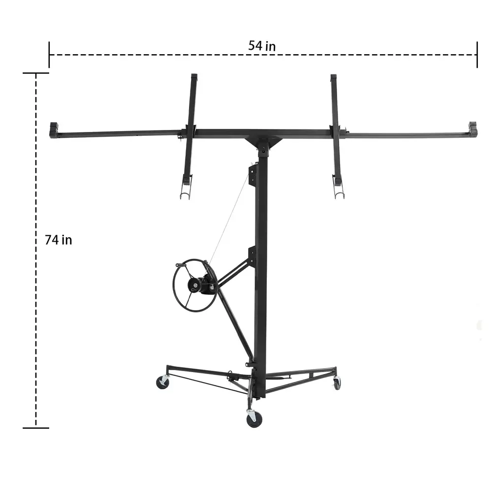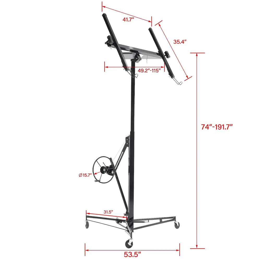 About This ProductThis drywall lift offers 1-person operation, a 150 lbs. load capacity and sturdy welded steel construction with powder coating for durability. It features foot stops for safety, easy disassembly without tools and hoist tilting for ceilings and walls, making it ideal for both home and commercial use. The built-in winch with brake, CE Standard compliance and the ability to lower to 74 in. off the floor ensure safe and convenient panel loading.1-person operation with foot stops for safety, Quiet operation with minimal noise and no squeaking during liftingSturdy welded steel construction with powder coatingBuilt-in winch with brake and CE standard complianceHoist tilting for ceilings and wallsMaximum height of 16 ft., it is versatile, Lower to 74 in. off the floor for easy panel loading, perfect for various sheet sizesEasy to assemble and disassemble without tools