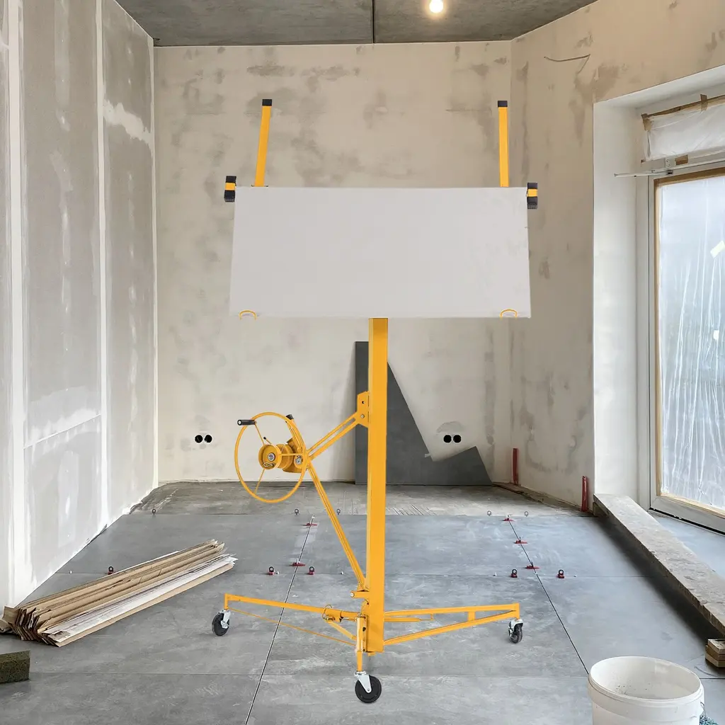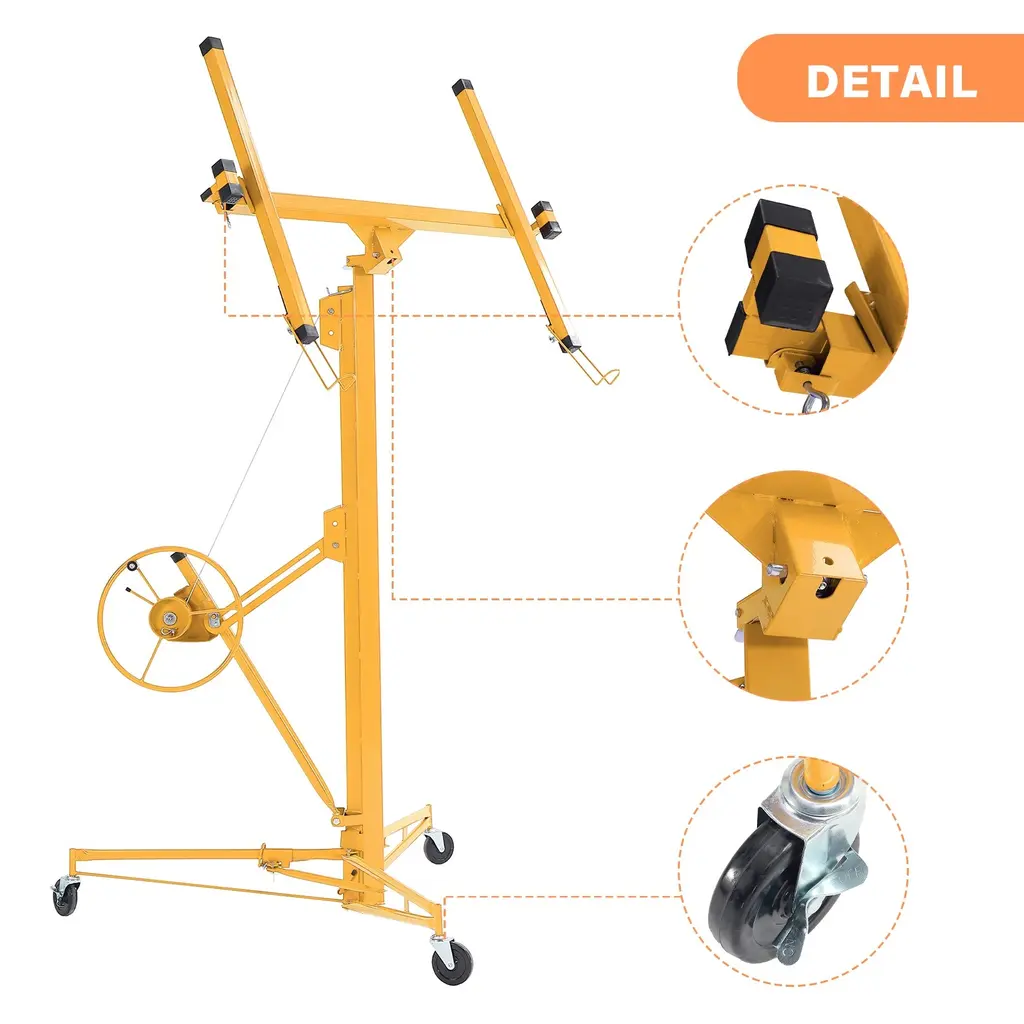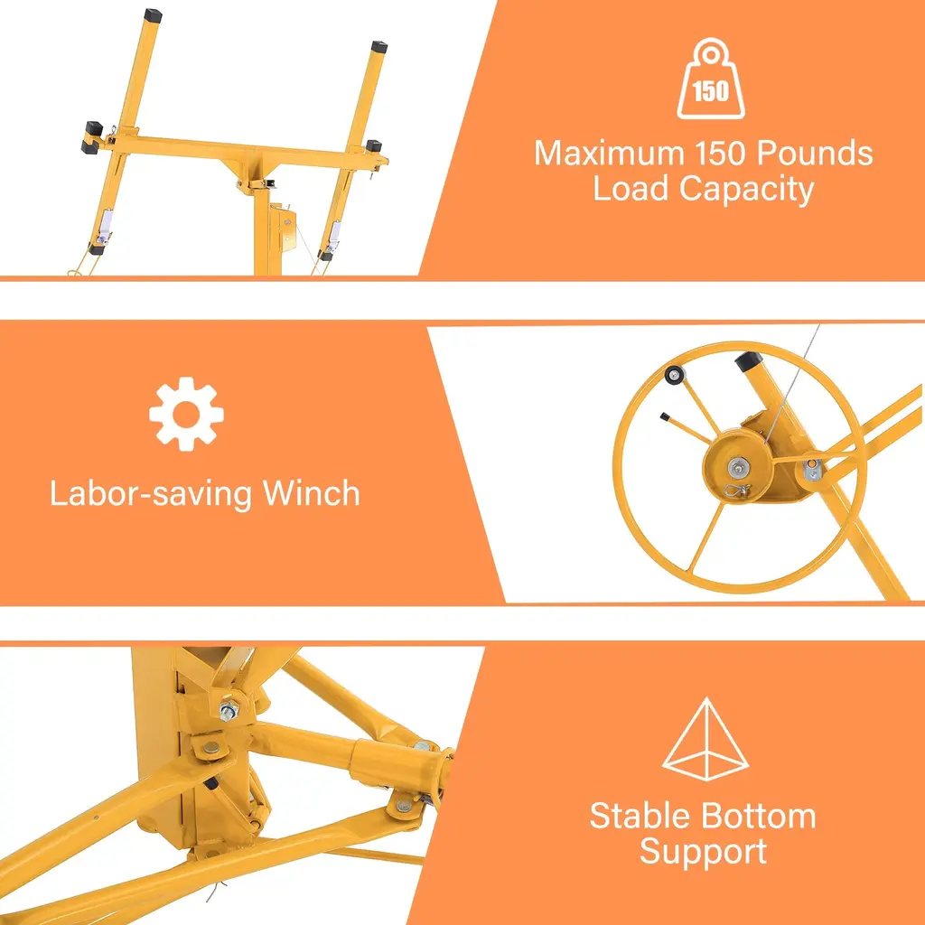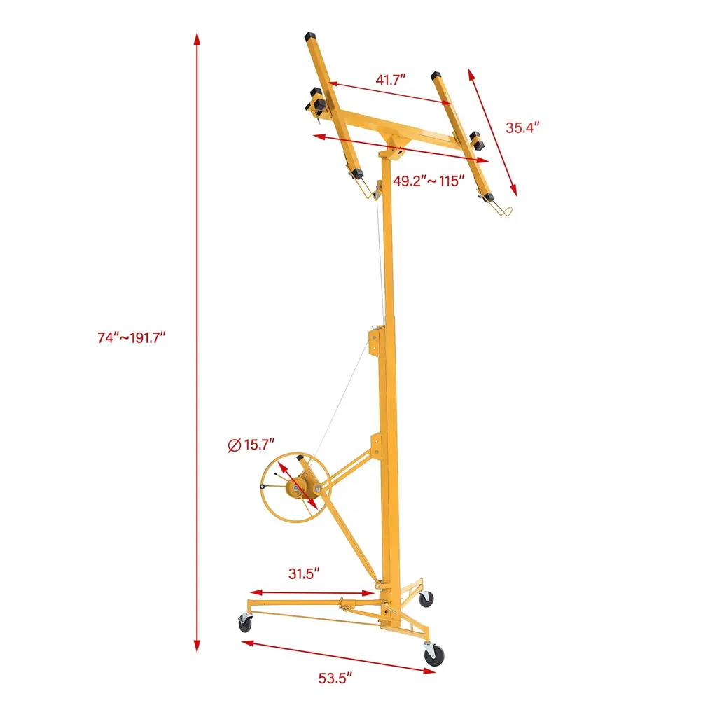 About This ProductThis drywall lift offers 1-person operation, a 150 lbs. load capacity and sturdy welded steel construction with powder coating for durability. It features foot stops for safety, easy disassembly without tools and hoist tilting for ceilings and walls, making it ideal for both home and commercial use. The built-in winch with brake, CE Standard compliance and the ability to lower to 74 in. off the floor ensure safe and convenient panel loading.1-person operation with foot stops for safety, Quiet operation with minimal noise and no squeaking during liftingSturdy welded steel construction with powder coatingBuilt-in winch with brake and CE standard complianceHoist tilting for ceilings and wallsMaximum height of 16 ft., it is versatile, Lower to 74 in. off the floor for easy panel loading, perfect for various sheet sizesEasy to assemble and disassemble without tools