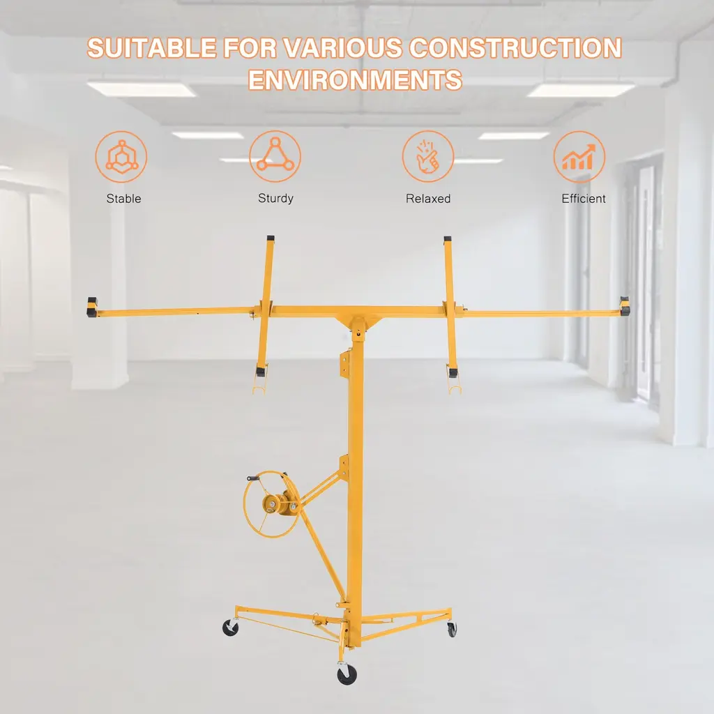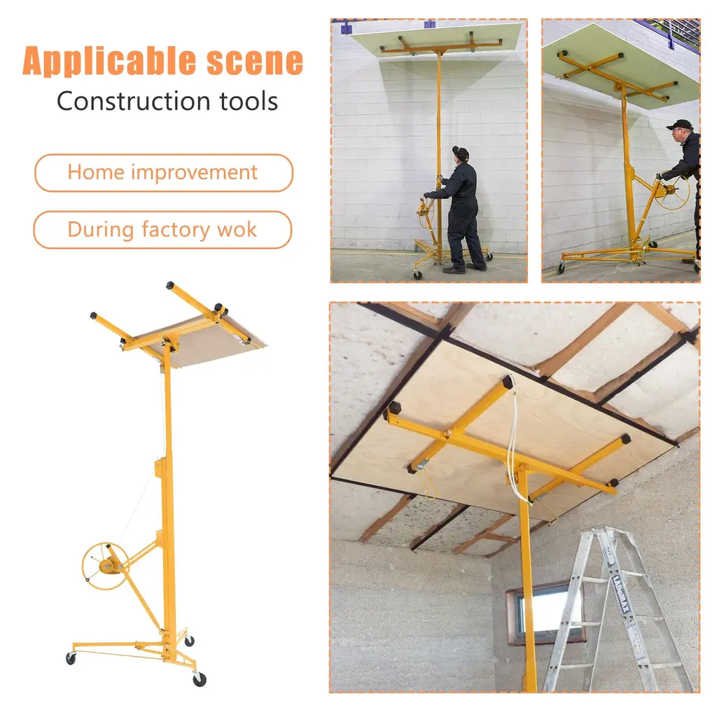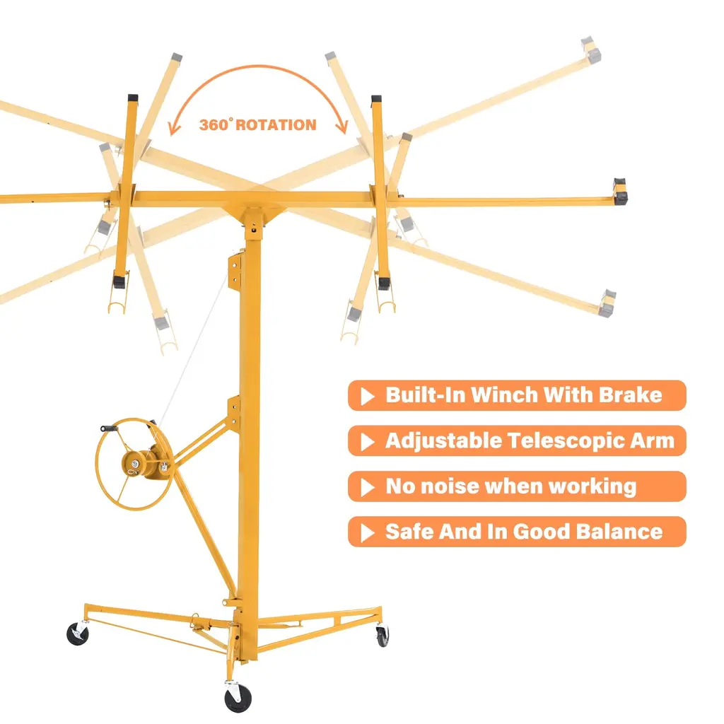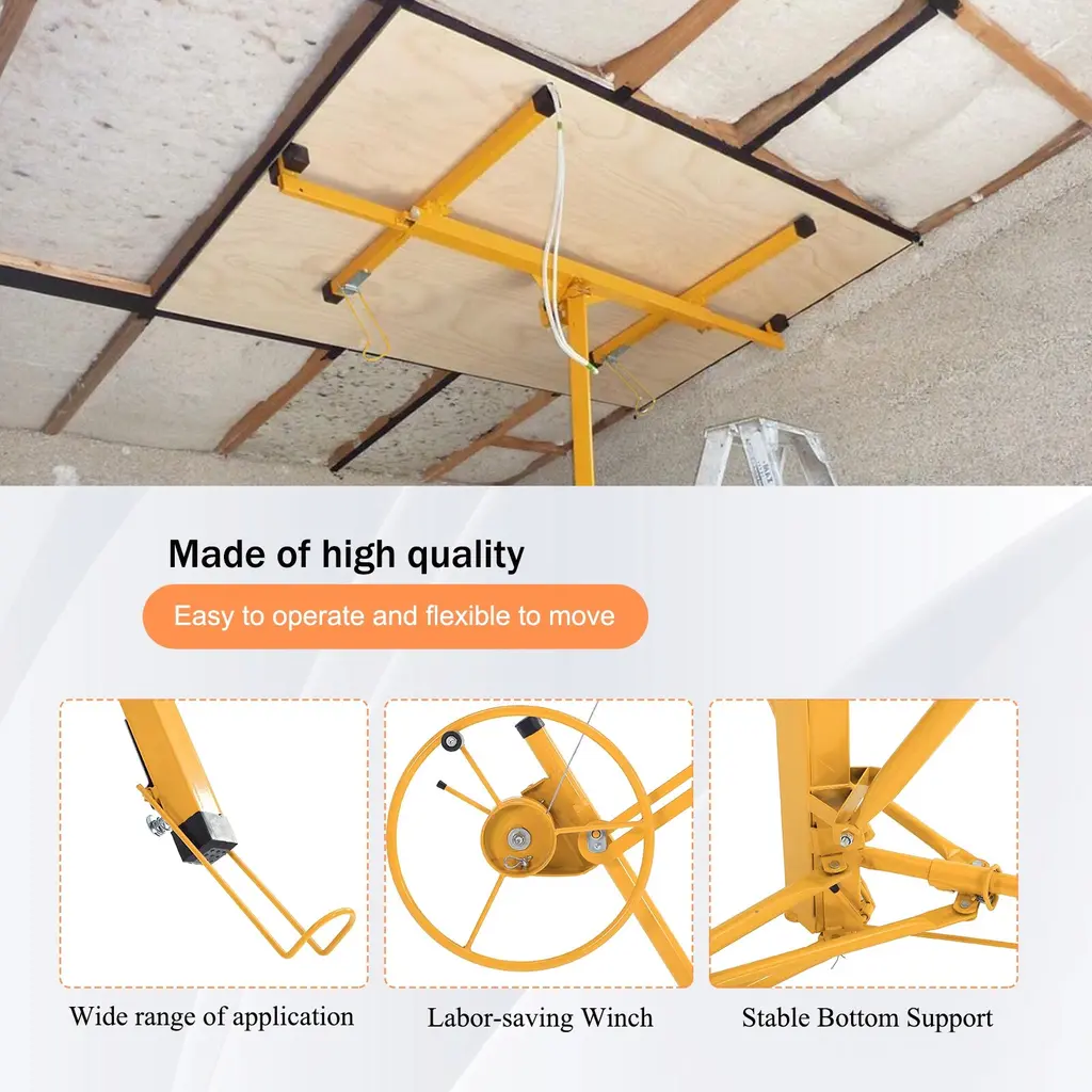 About This ProductThis drywall lift offers 1-person operation, a 150 lbs. load capacity and sturdy welded steel construction with powder coating for durability. It features foot stops for safety, easy disassembly without tools and hoist tilting for ceilings and walls, making it ideal for both home and commercial use. The built-in winch with brake, CE Standard compliance and the ability to lower to 74 in. off the floor ensure safe and convenient panel loading.1-person operation with foot stops for safety, Quiet operation with minimal noise and no squeaking during liftingSturdy welded steel construction with powder coatingBuilt-in winch with brake and CE standard complianceHoist tilting for ceilings and wallsMaximum height of 16 ft., it is versatile, Lower to 74 in. off the floor for easy panel loading, perfect for various sheet sizesEasy to assemble and disassemble without tools