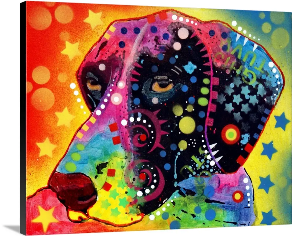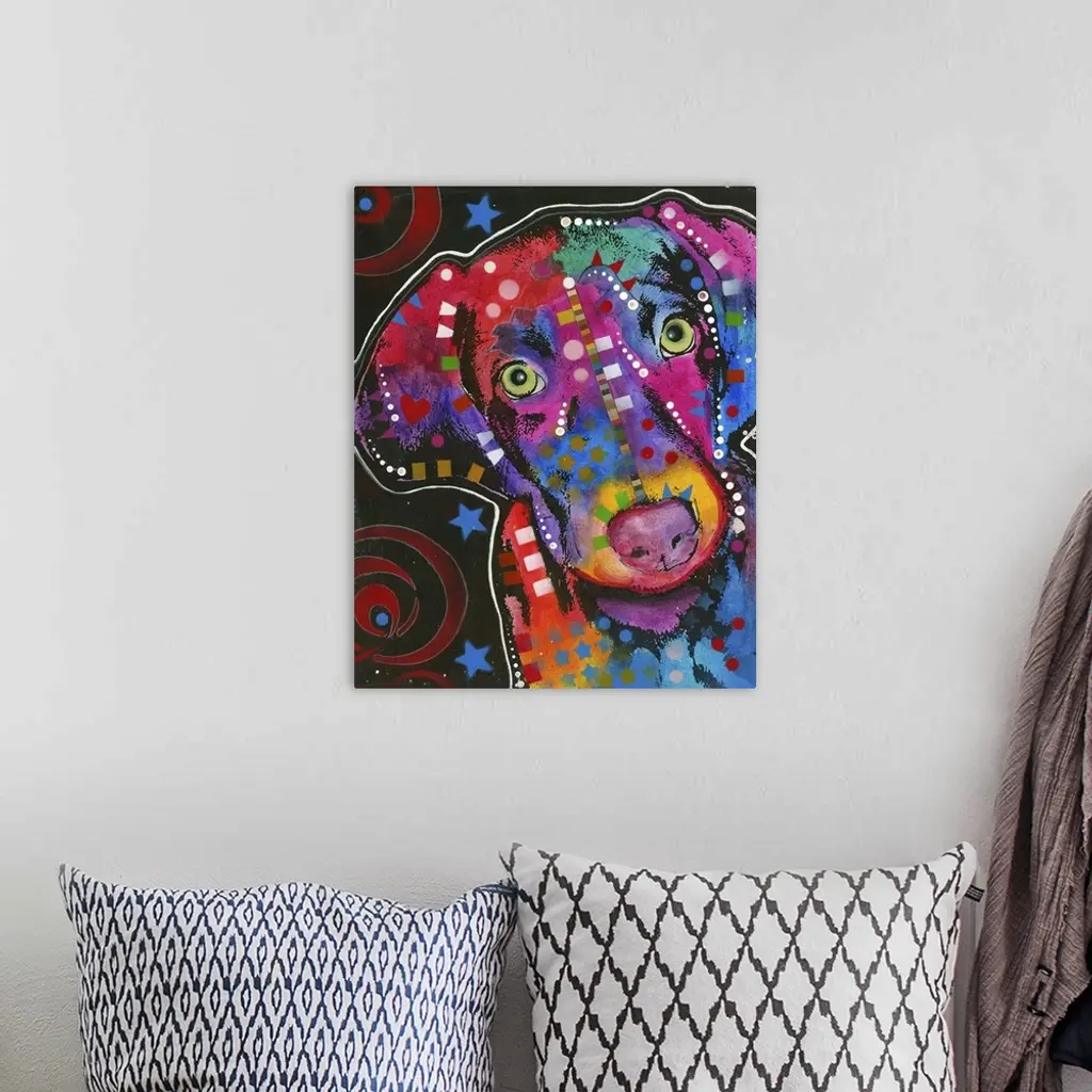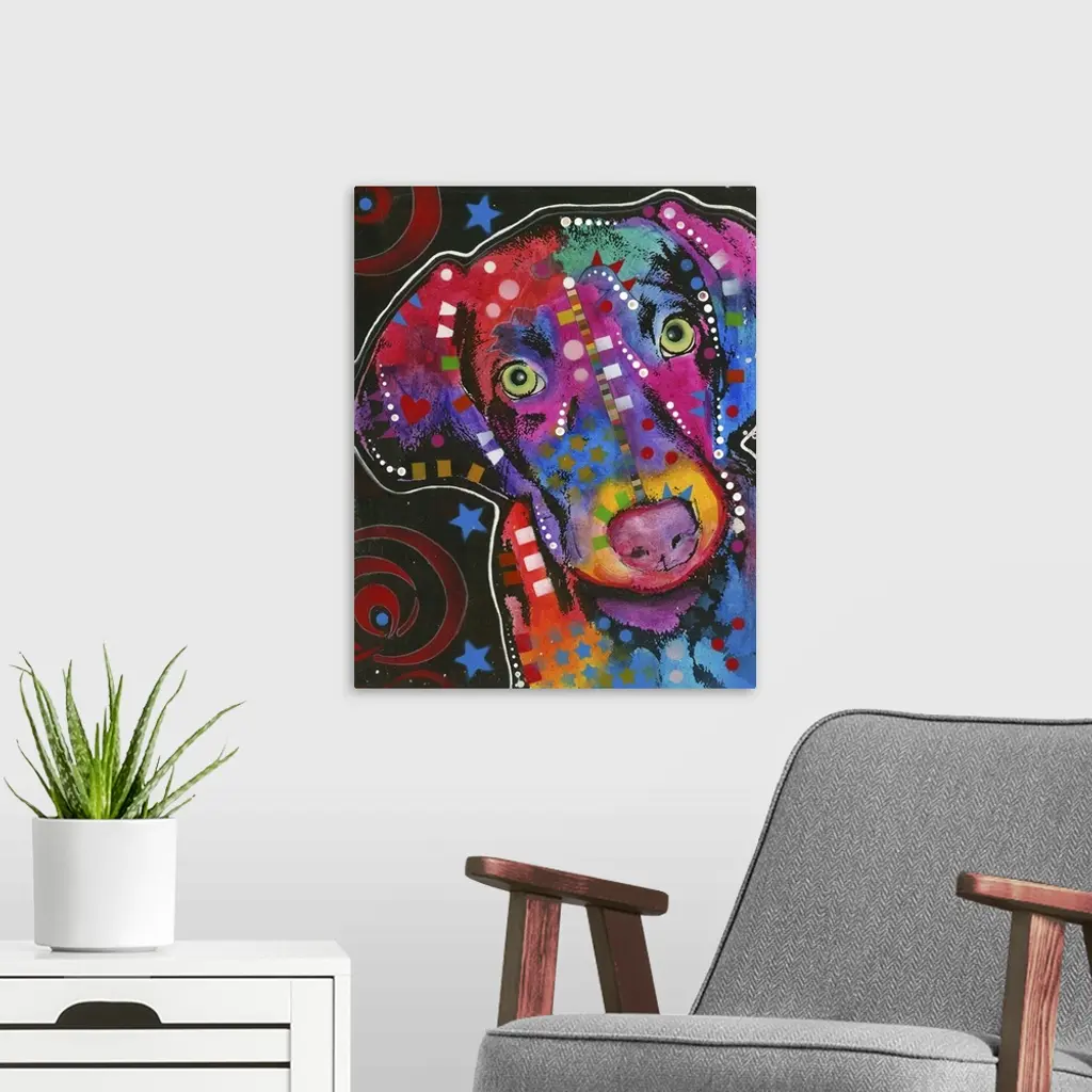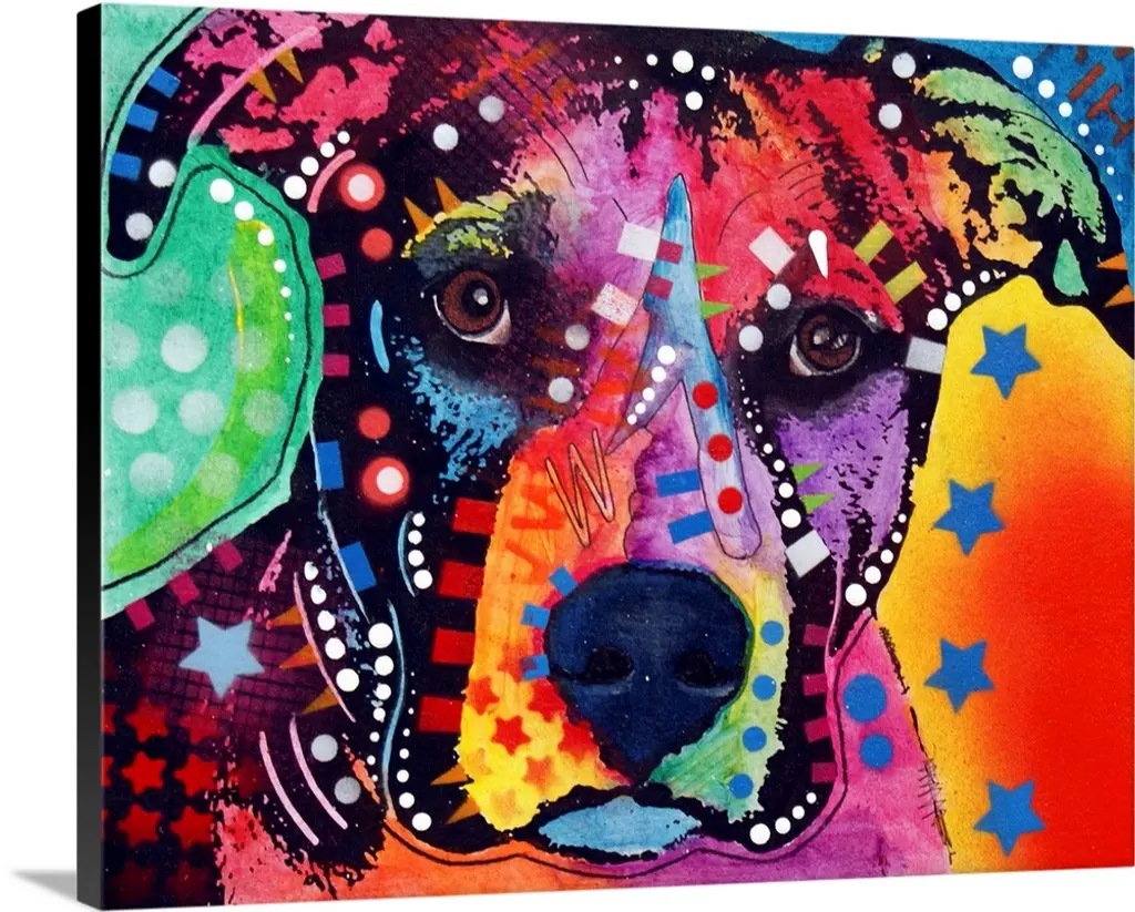 Contemporary painting of a colorful Labrador with geometric abstract designs all over.