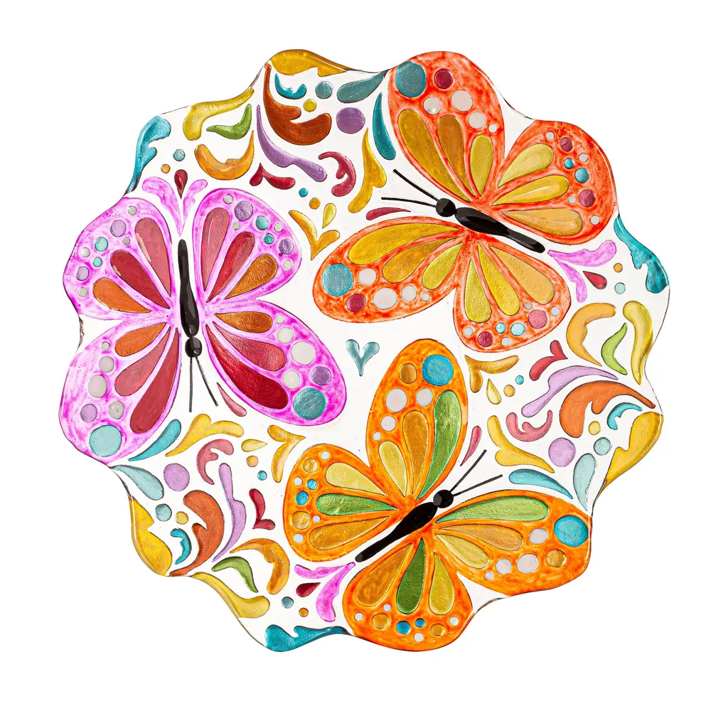 Beckon feathered friends to your yard with this Iridescent Dragonfly bird bath. The shimmering artwork will create a stunning accent in your garden. Composed of high-quality materials, the 18" bowl is beautiful yet practical. Its elegance and functionality are sure to delight both humans and birds alike! Choose a shady spot to place the bath, as this can prevent algae growth and keep the water cool. For best results, fill the bath with only 1 to 2 inches of fresh water. Place gravel, stones, or sand in the bowl to adjust water depth or make the bottom less slippery. Change the water every few days.