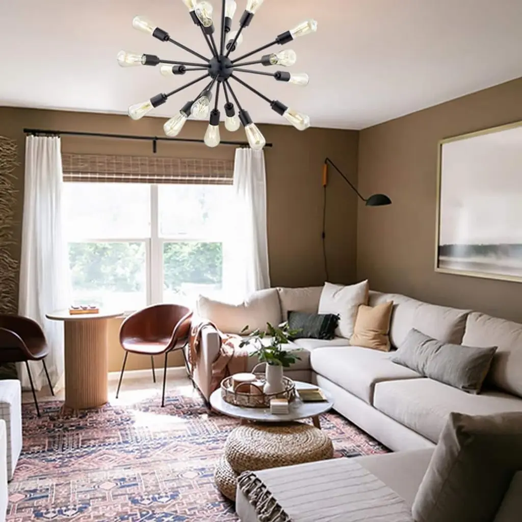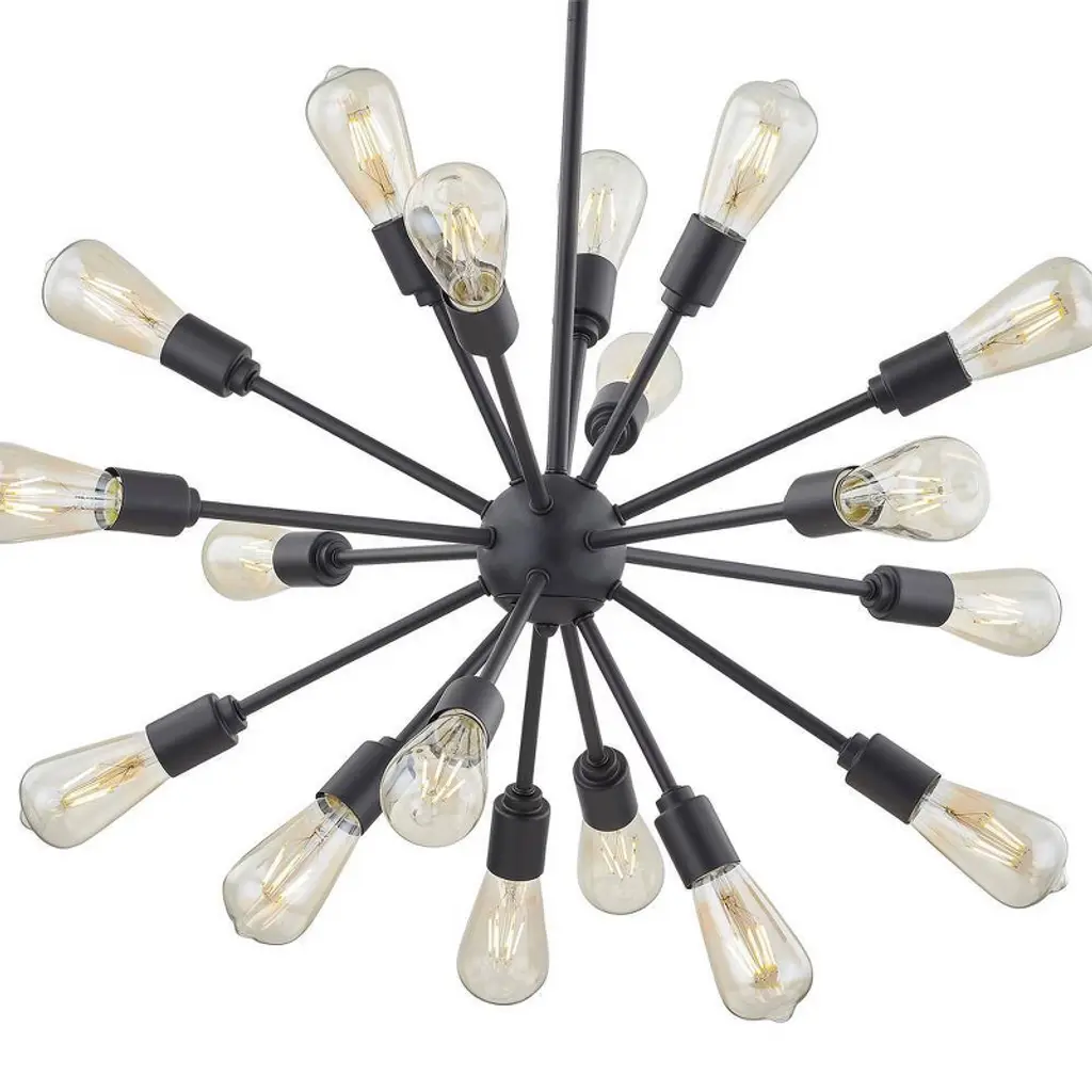 This Modern Matt Gold chandelier infuses your home with mid-century modern charm while providing ample illumination. Crafted from sleek metal, this fixture boasts a captivating design featuring a network of slender rod-like arms, reminiscent of minimalist artwork. Easily adjustable suspension height allows for personalized positioning with simple disassembly for effortless cleaning. with 18 arms extending from its metallic core, this chandelier creates a dynamic, space-age aesthetic. Atop the fixture, 18 sockets accommodate up to 60-Watt incandescent bulbs each (bulbs not included), casting a warm, ambient glow throughout your living space.
