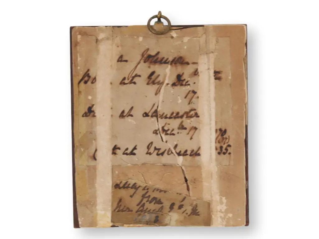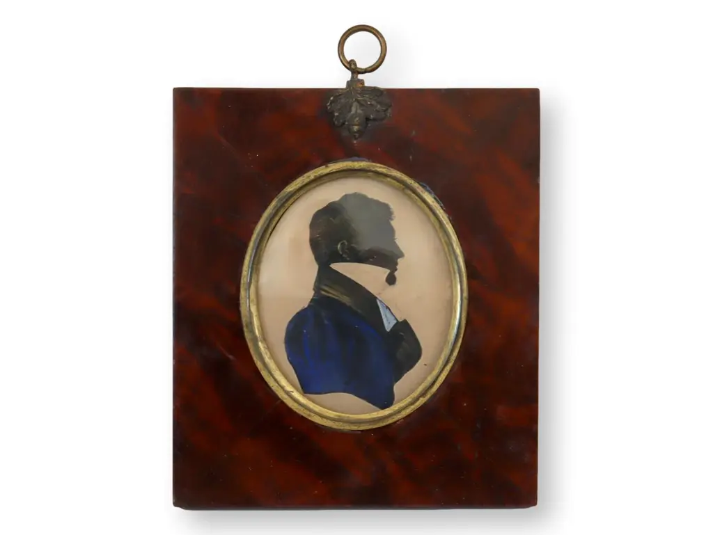 An 1848 English silhouette portrait, this piece is encased in its original burl wood frame, adorned with a brass hanger. The reverse side bears handwritten details of the subject, adding to its historical intrigue and authenticity. A rare, and highly collectible timeless treasure of Victorian art.