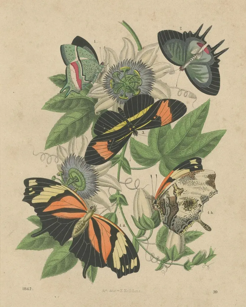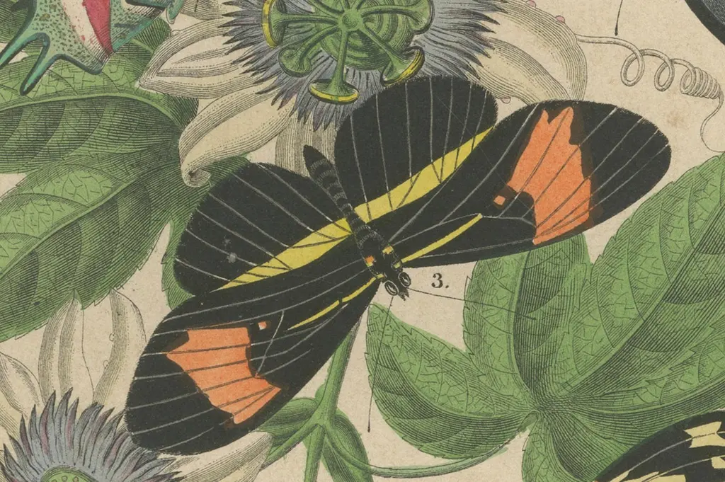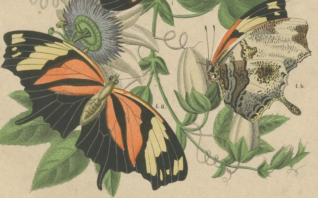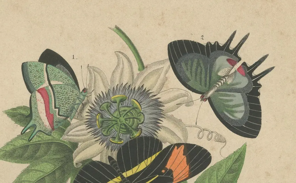 1867 Hand-Colored Lithograph Of South American Butterflies And Passionflower