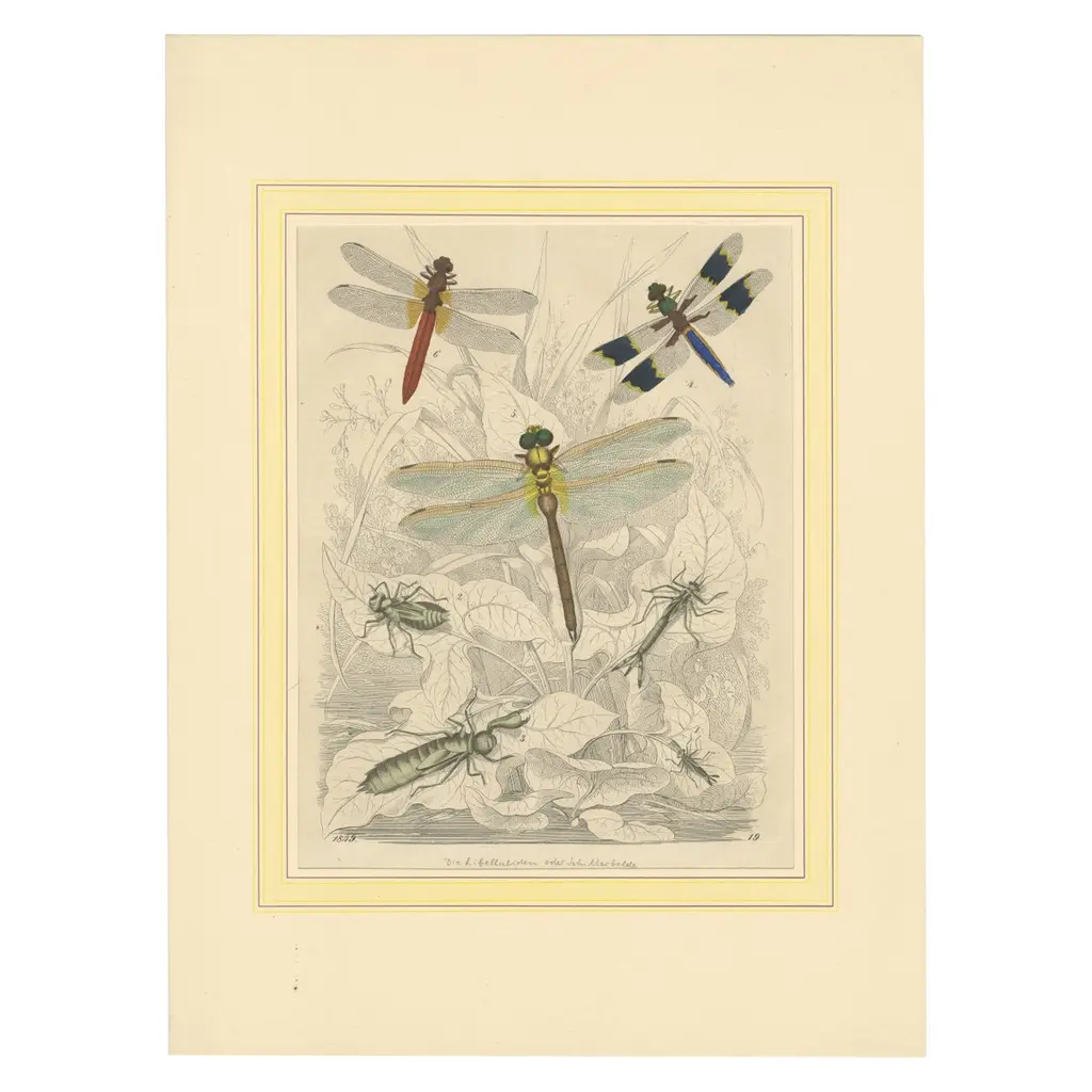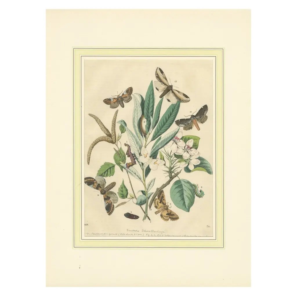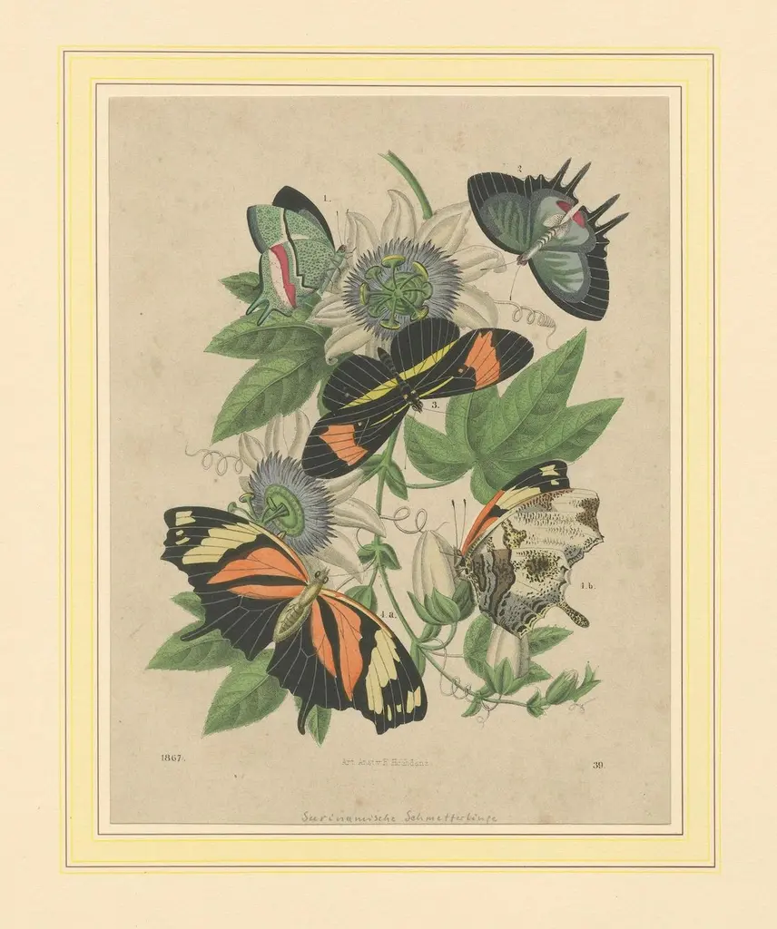 Title: 1867 Hand-Colored Lithograph of South American Butterflies and Passionflower – A Stunning Natural History Artwork Description: This beautiful 1867 hand-colored lithograph presents an exquisite study of South American butterflies amidst the intricate blossoms and foliage of a passionflower (Passiflora). The composition features a variety of butterfly species, each meticulously illustrated to capture their vibrant patterns and delicate anatomy. The standout butterflies include a striking emerald-green and red specimen, an elegant black butterfly with iridescent blue markings, and others with vivid orange, yellow, and white accents. Their positioning on the passionflower vine emphasizes the ecological relationship between these insects and their host plant, highlighting the intricate balance of nature. The passionflower, with its ornate blossoms and tendrils, adds a botanical dimension to the artwork, making it a visually captivating piece that combines artistic mastery with scientific detail. This lithograph is a testament to the 19th-century fascination with documenting the natural world in both beauty and accuracy. The butterflies depicted might include species commonly found in Suriname and neighboring regions. Here are possible identifications:Butterfly 1: Likely a species of Urania, possibly Urania leilus (Green-banded Urania). These day-flying moths are native to the tropical rainforests of South America and are known for their iridescent green and black striped wings.Butterfly 2: Likely a Prepona species, such as Prepona laertes (Blue Prepona), known for its vibrant blue and black wings with a velvety appearance. This butterfly is native to South American rainforests.Butterfly 3: A species of Heliconius, possibly Heliconius melpomene (Postman Butterfly). Its bold orange and black patterns are characteristic of this genus, common in tropical South America.Butterfly 4: Likely a species of Hamadryas, such as Hamadryas feronia (Blue Cracker). These butterflies have cryptic brown and blue patterns and are found throughout South and Central America.The lithograph emphasizes their connection to Suriname through the caption. Suriname was a focal point for naturalists during the 18th and 19th centuries, especially after Maria Sibylla Merian's groundbreaking work on Surinamese insects. The presence of the passionflower (Passiflora), a host plant for several butterfly species, ties these butterflies to their ecological setting in tropical South America.Condition Report: The lithograph is in very good condition, with vivid hand-coloring and fine details well-preserved. The paper shows light age-related toning, consistent with its history, and minor foxing confined to the margins. Mounted on a cream-colored mat with yellow borders, this piece is ready for framing or display. This lithograph is perfect for collectors of entomological art, botanical illustration, or 19th-century natural history works, offering both visual appeal and scientific significance.